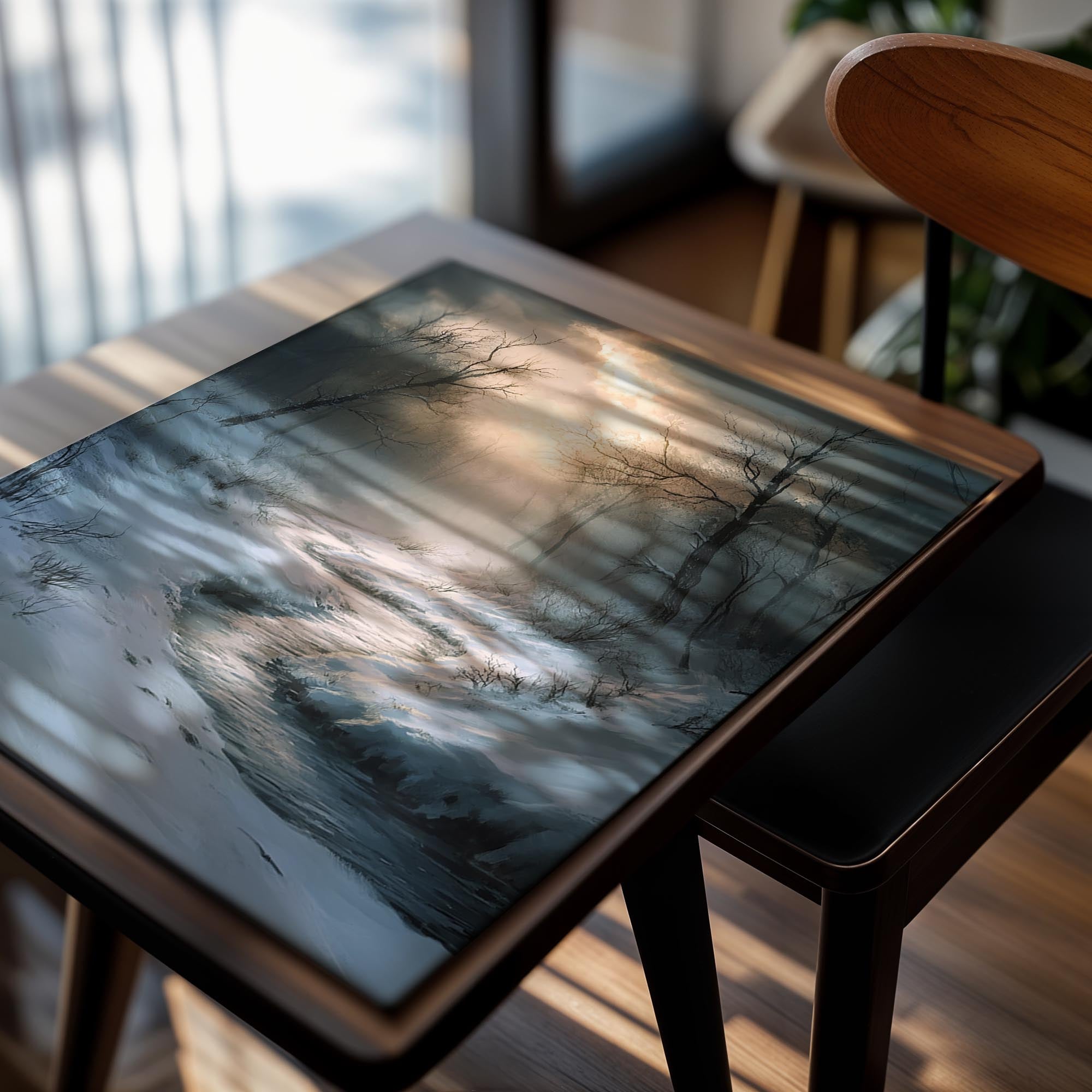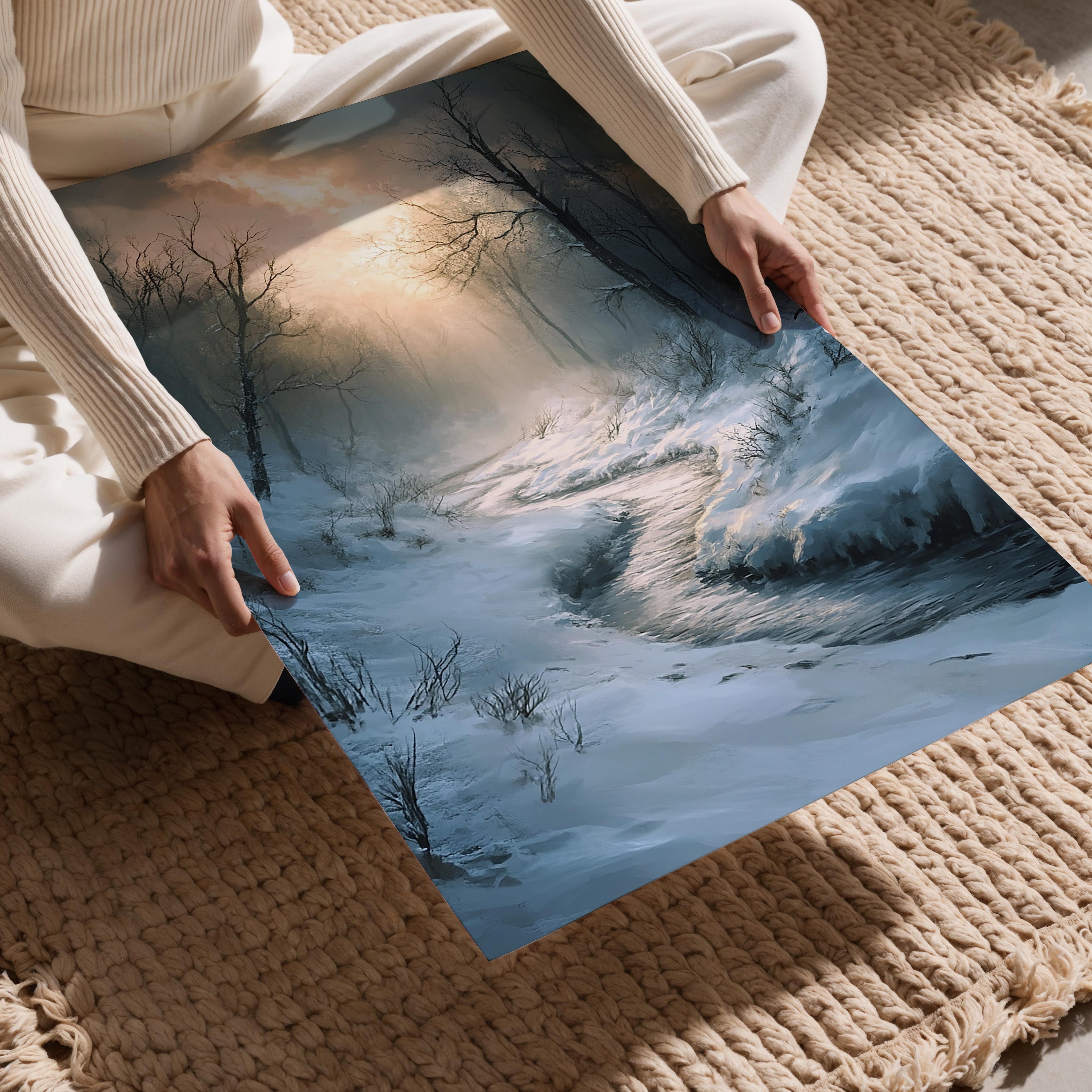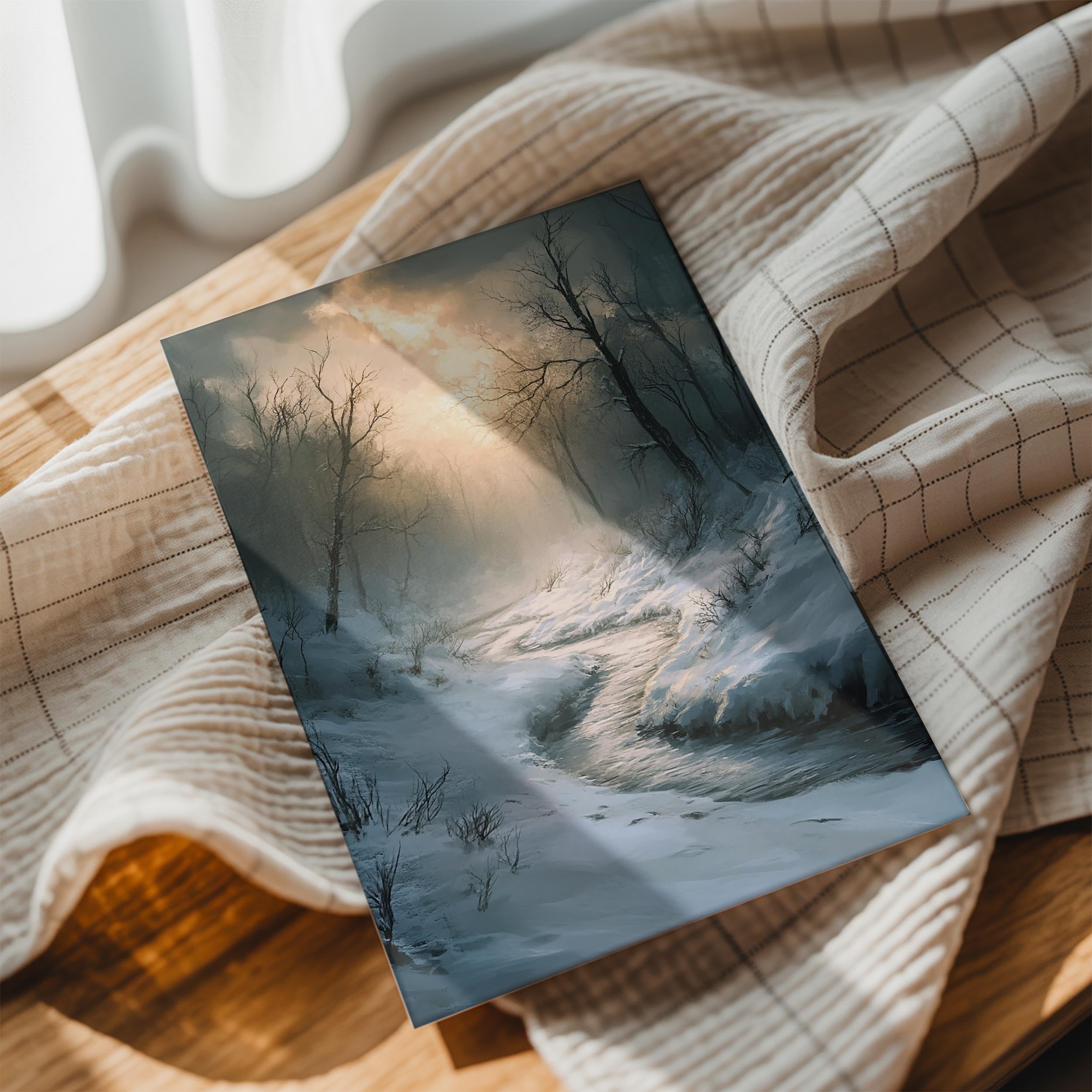 A winter creek glows softly as sunlight reflects off its surface, casting a magical light that contrasts beautifully with the snowy banks. The surrounding trees stand tall, their branches dusted with frost, framing the serene flow of water. The scene captures the quiet charm of winter, where even the coldest days are warmed by the gentle touch of sunlight. Ideal for evoking a sense of tranquility and magic, this image brings to life the balance between the stillness of snow and the movement of water. It is a celebration of winter’s quiet beauty, perfect for inspiring peaceful thoughts and reflection.