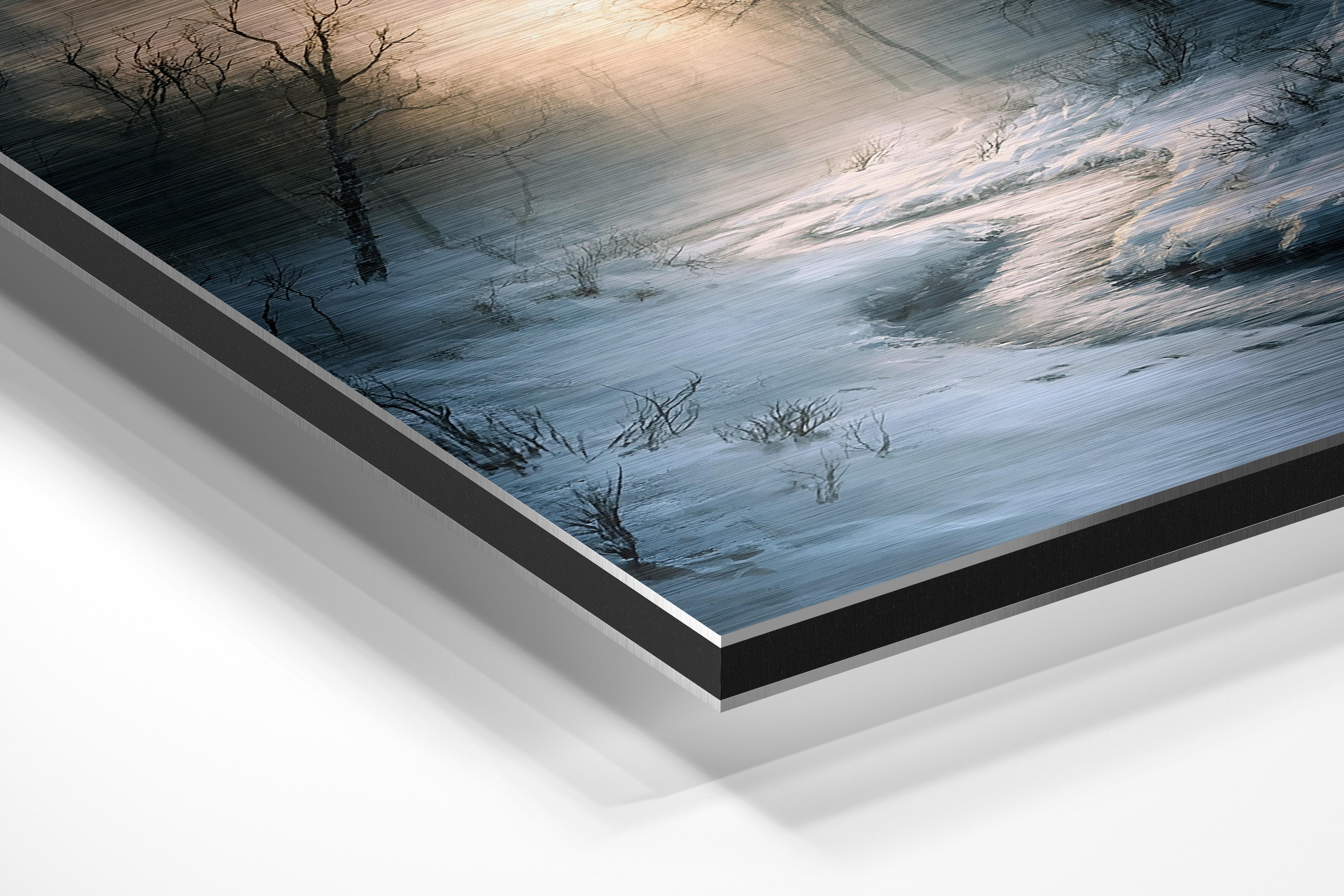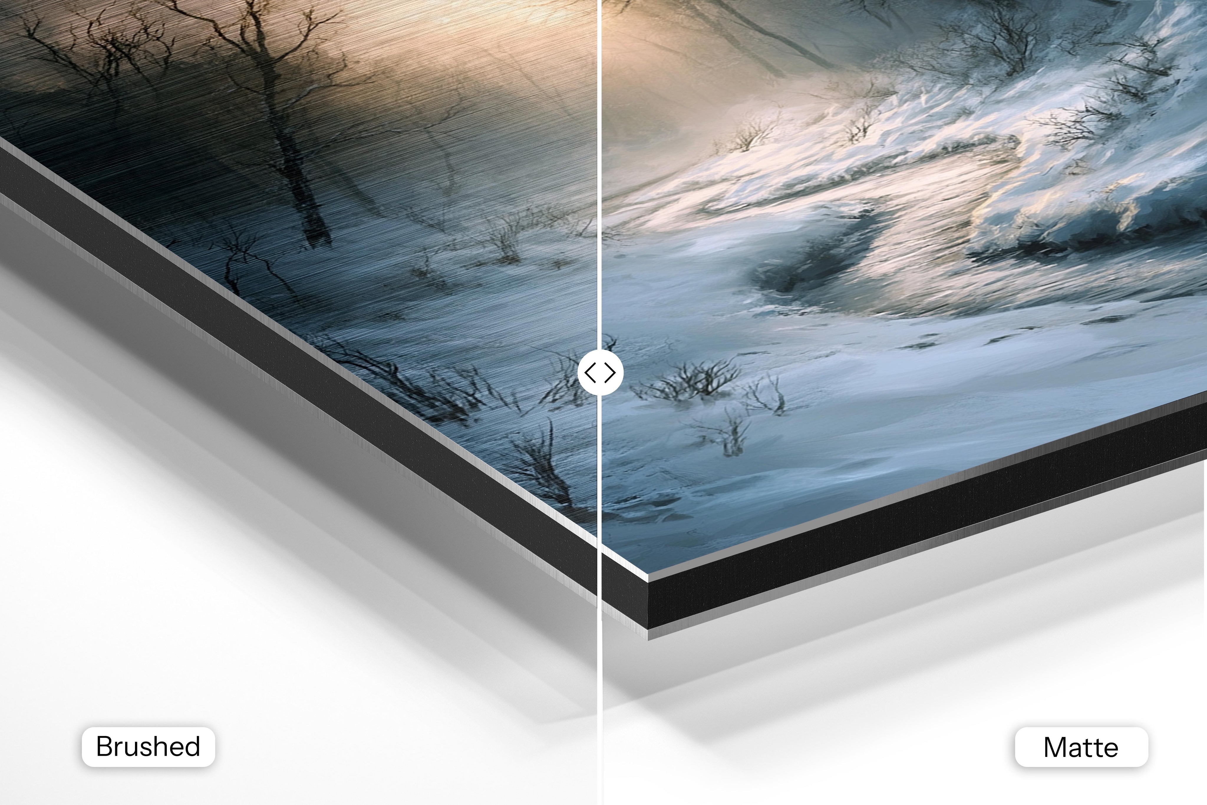 - Brushed Aluminum, on the other hand, features a raw metallic texture with visible brush strokes. Whites and highlights in your image let the silver surface show through, adding a dramatic, shimmering effect. Ideal for black-and-white images, minimalist designs, or abstract art, it creates a bold, industrial vibe with a modern edge.