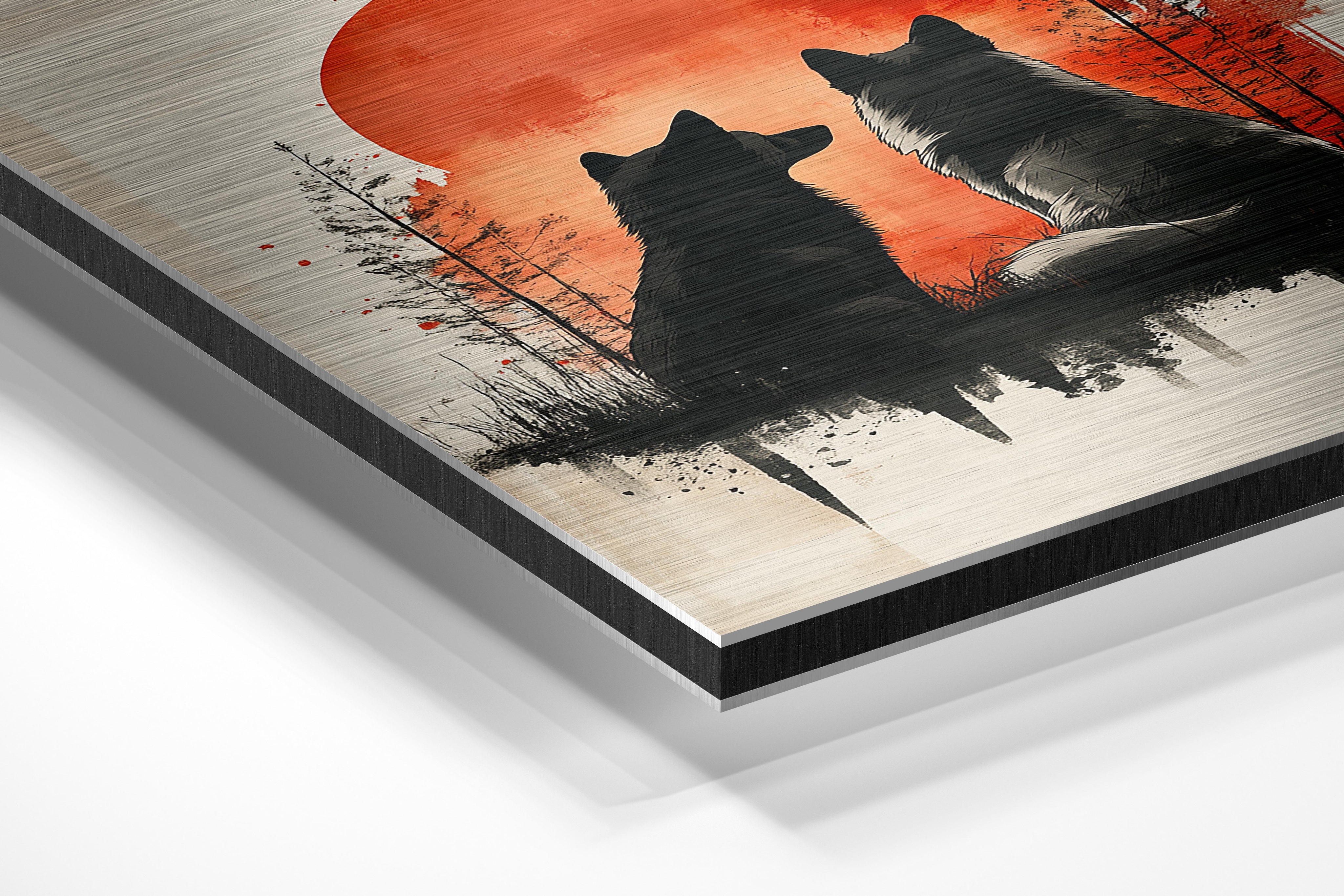 This stunning image captures two wolves sitting side by side, their silhouettes dark against a striking red-orange sun. The bold contrast between the dark forest and the fiery sky creates a dramatic and emotionally evocative scene. The painterly drips add a contemporary artistic touch, making it a unique choice for modern interiors. Ideal for those drawn to the symbolism of wolves—loyalty, independence, and wisdom—this piece brings a powerful, raw energy to a room. It would be a compelling statement piece in an office, bedroom, or space dedicated to strength and resilience.