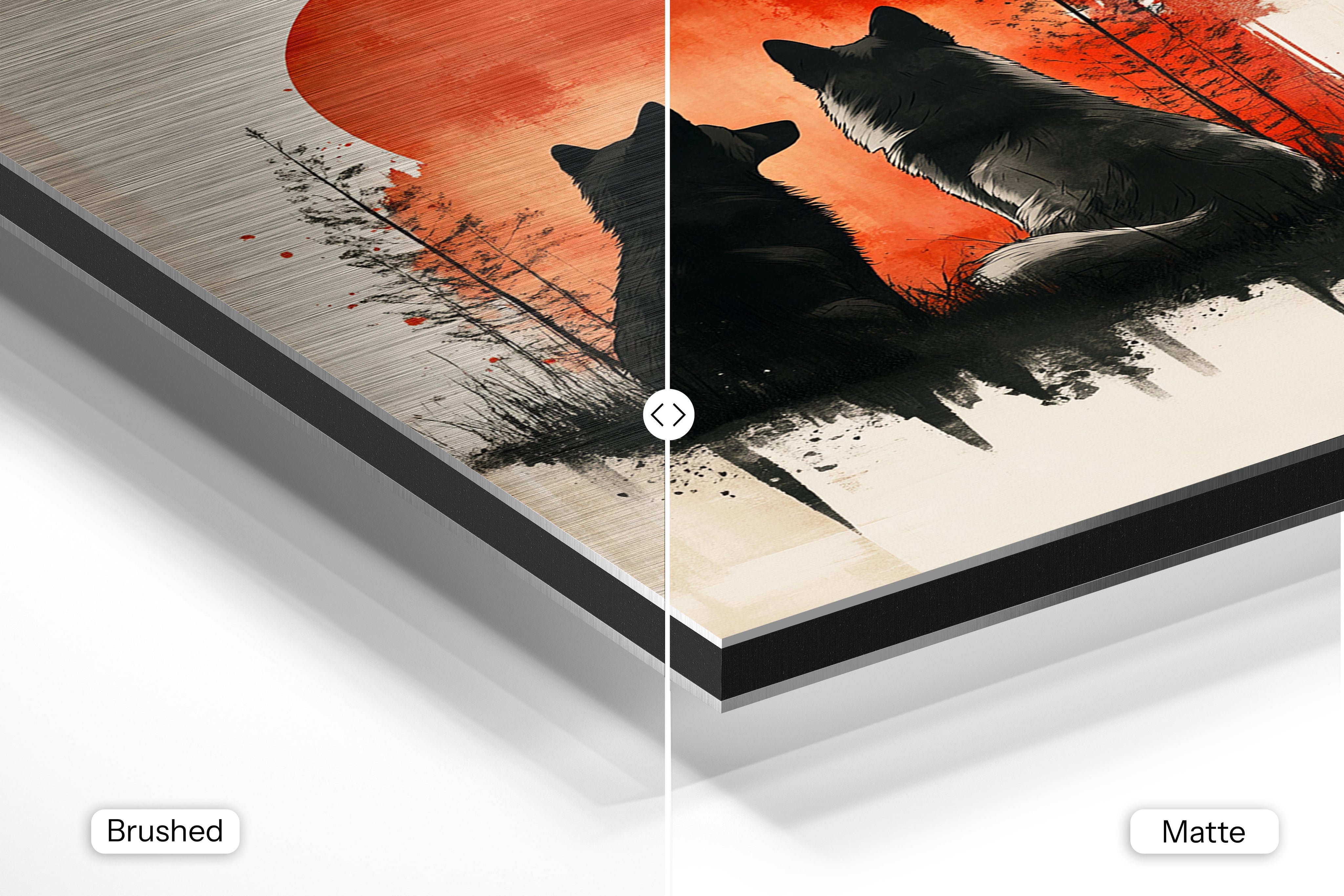 - Brushed Aluminum, on the other hand, features a raw metallic texture with visible brush strokes. Whites and highlights in your image let the silver surface show through, adding a dramatic, shimmering effect. Ideal for black-and-white images, minimalist designs, or abstract art, it creates a bold, industrial vibe with a modern edge.