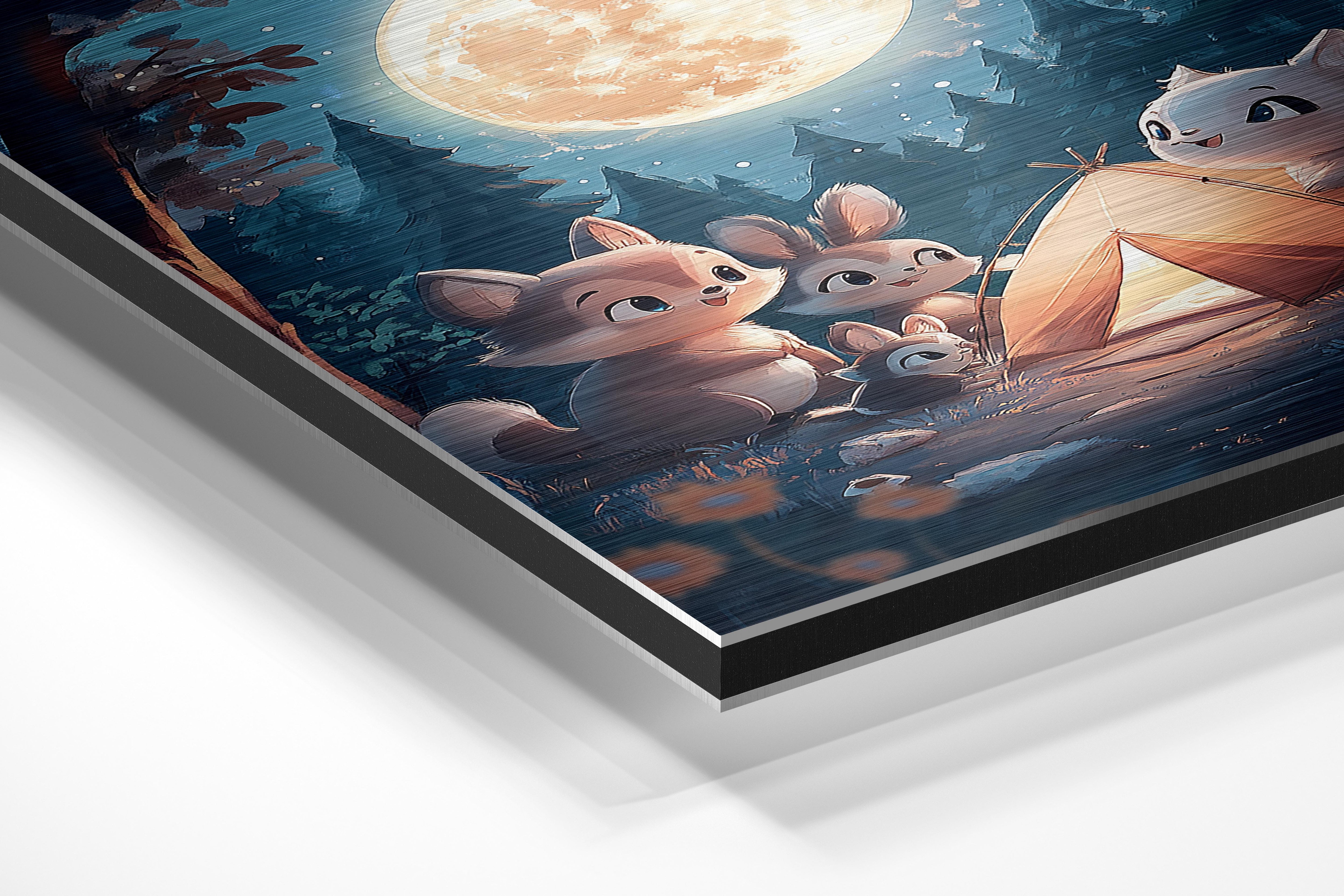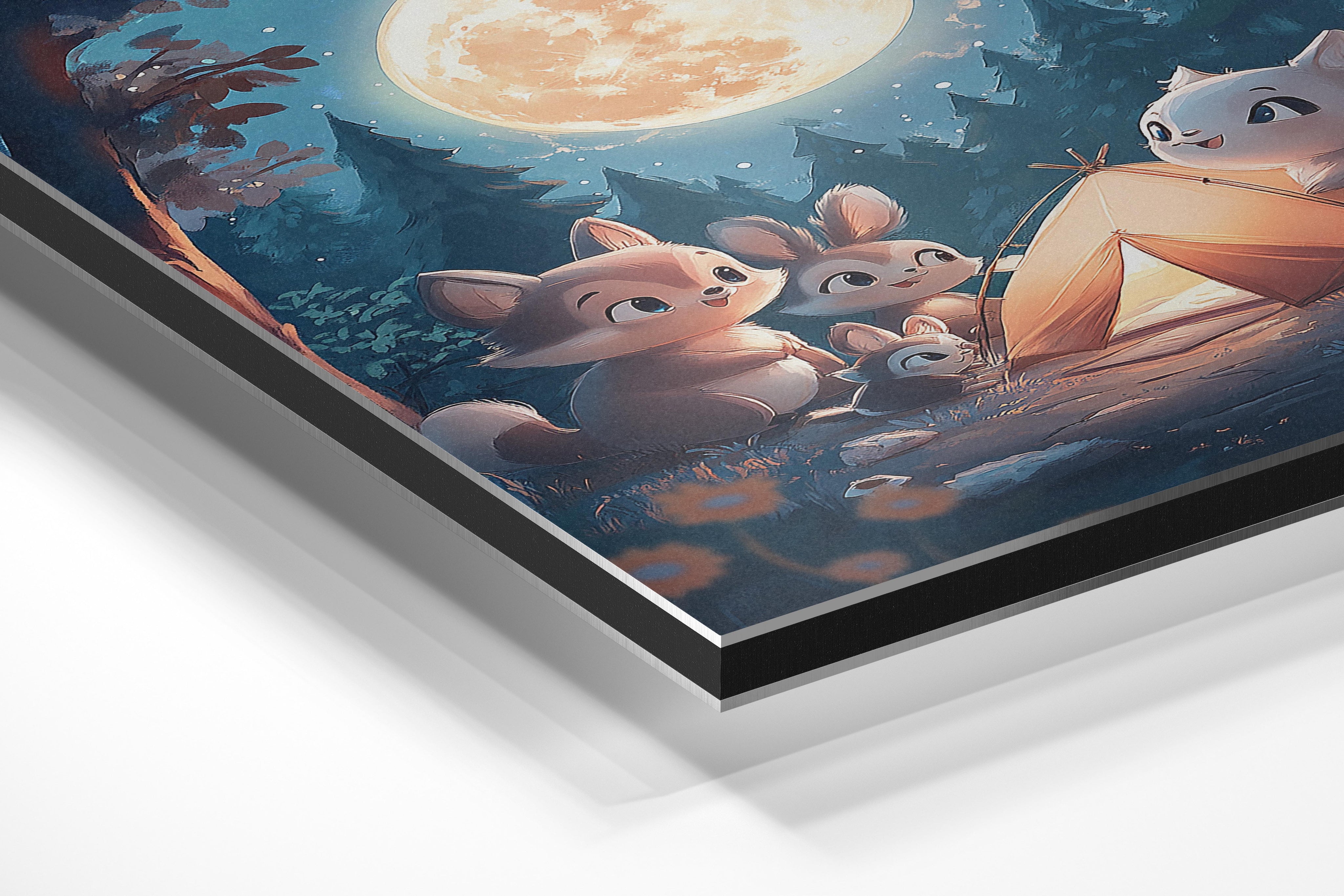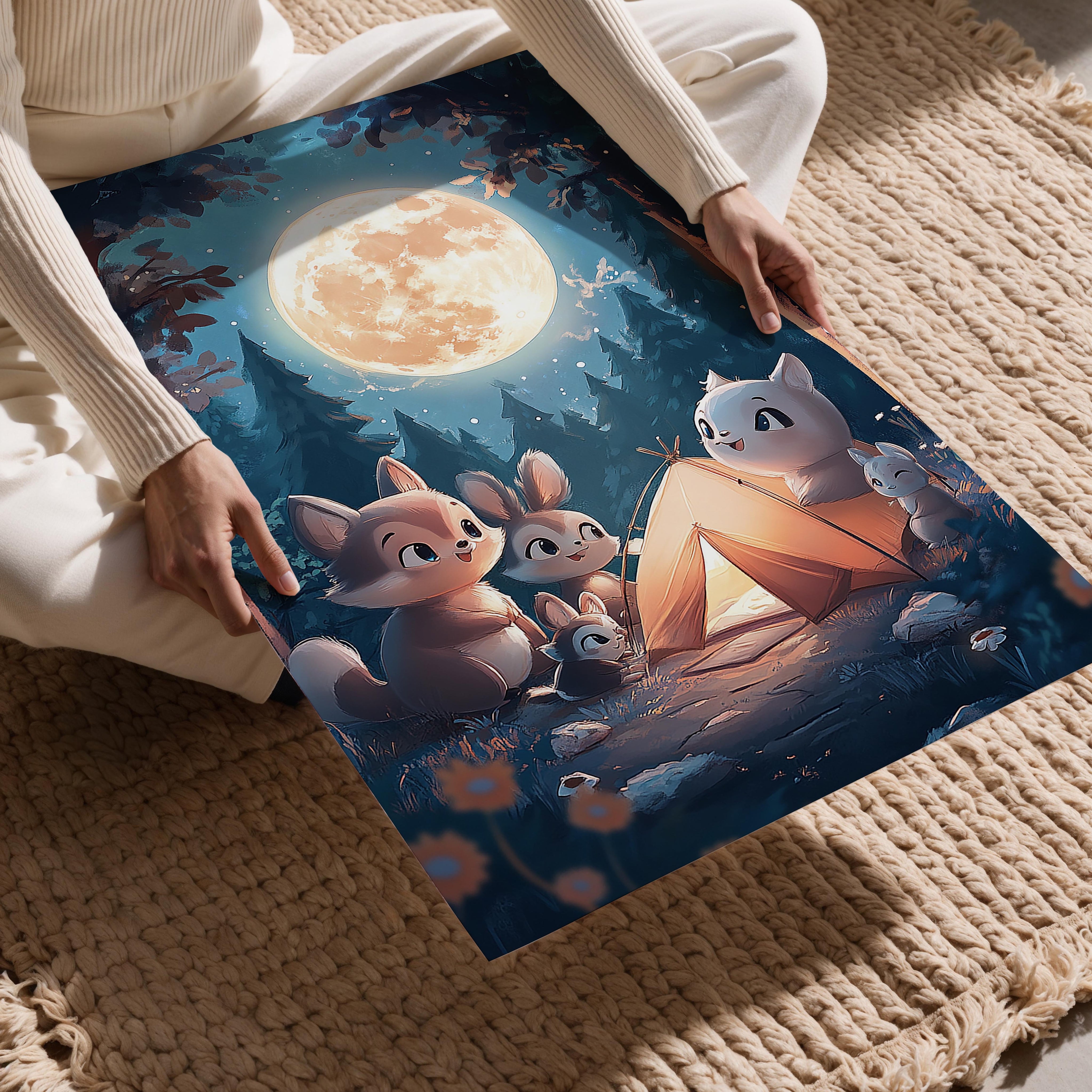 A captivating depiction of woodland animals gathered around a glowing campfire under a full moon. The intricate details of the forest and the gentle light create a magical and heartwarming scene. Perfect for children's rooms, this artwork captures the essence of togetherness and wonder in nature. Its enchanting composition makes it a delightful addition to any cozy space.
