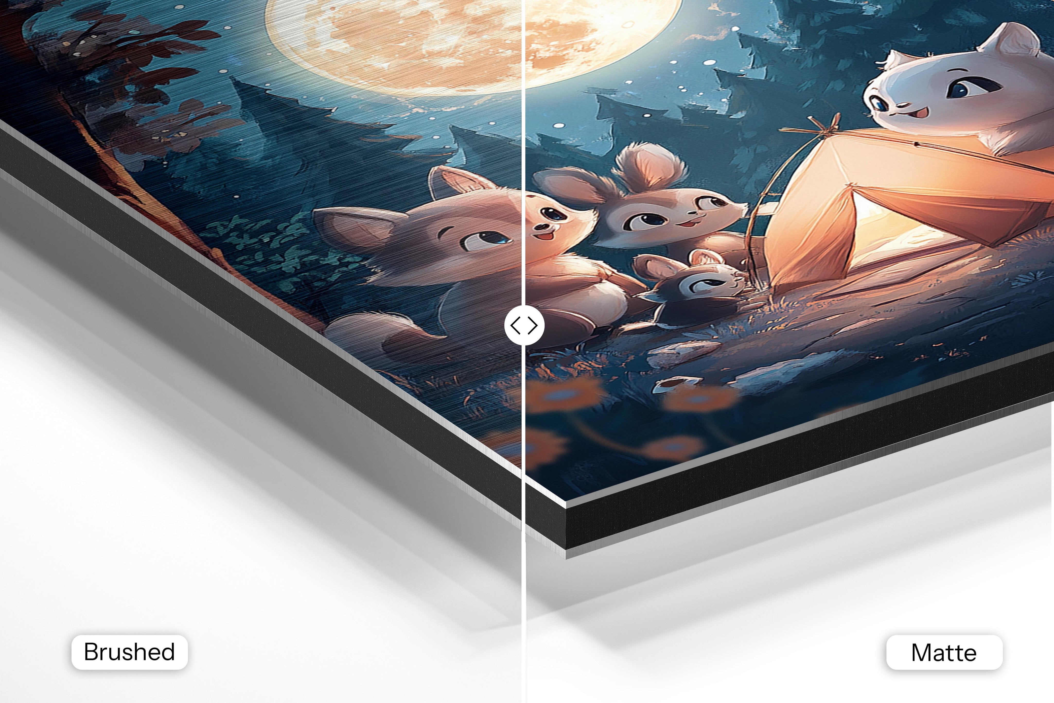 - Matte Aluminum offers a smooth, bright white surface that delivers crisp details and vibrant, true-to-life colors. With its non-reflective finish and subtle silky sheen, it’s perfect for photography, portraits, and colorful artwork—bringing a clean, polished look to any interior.