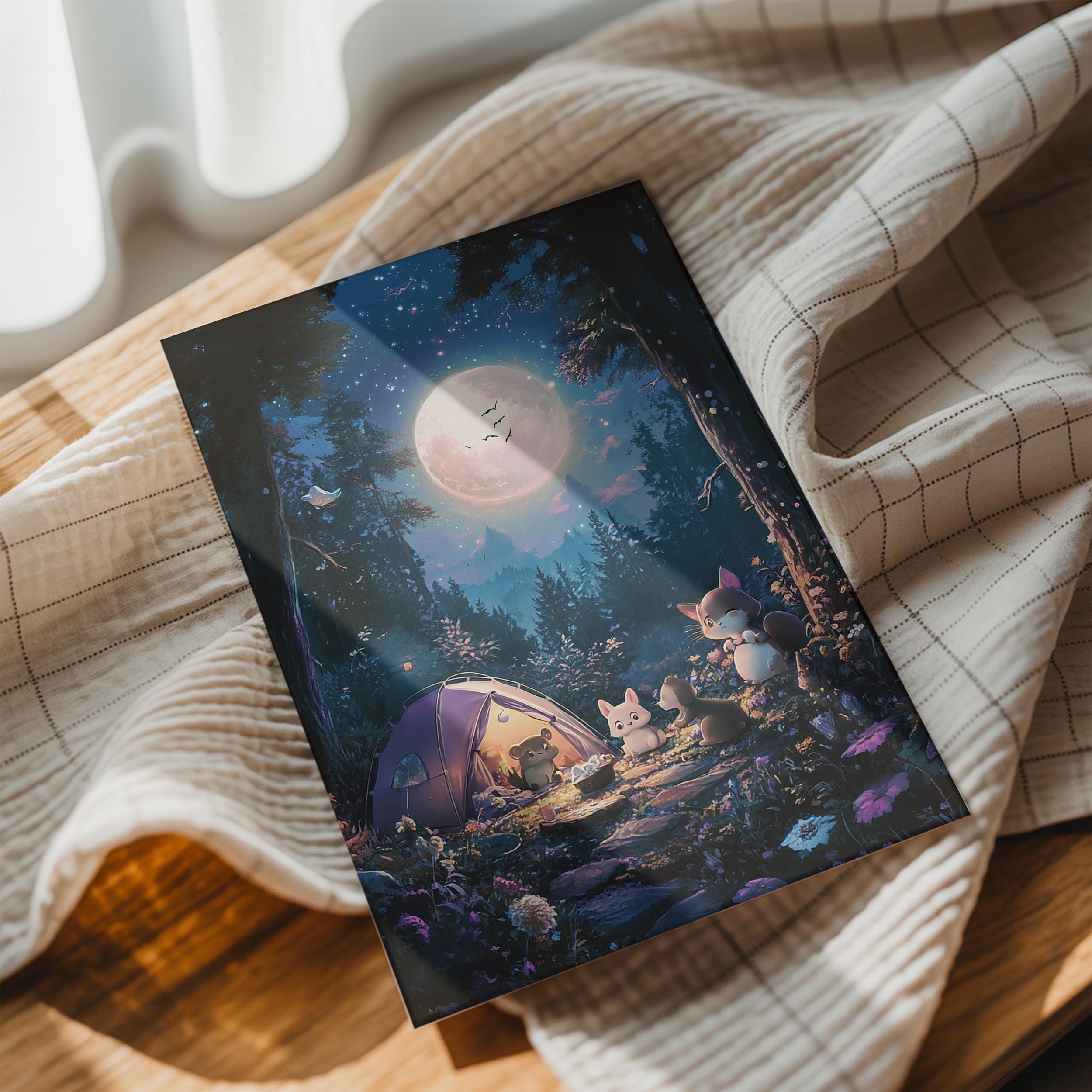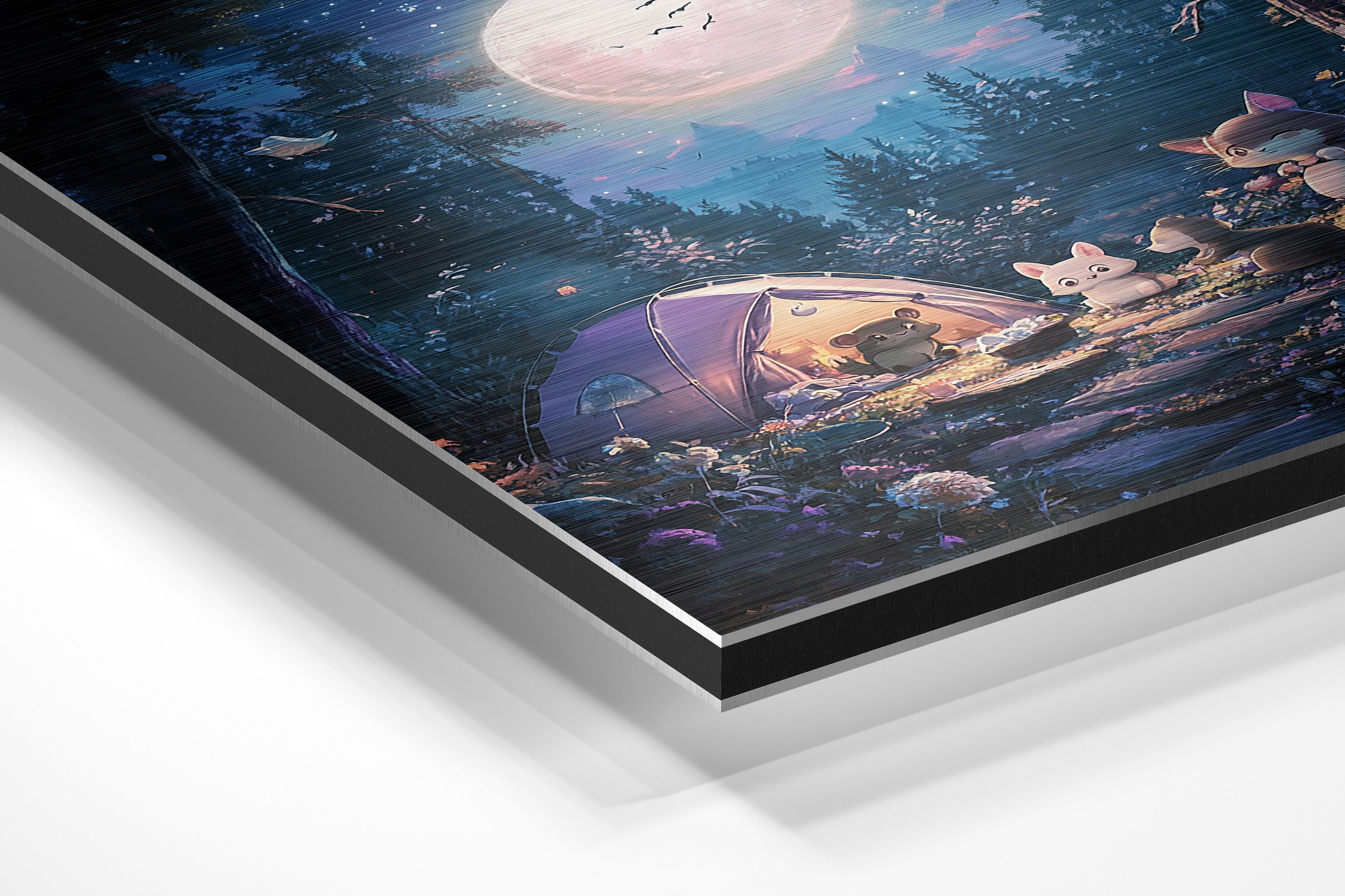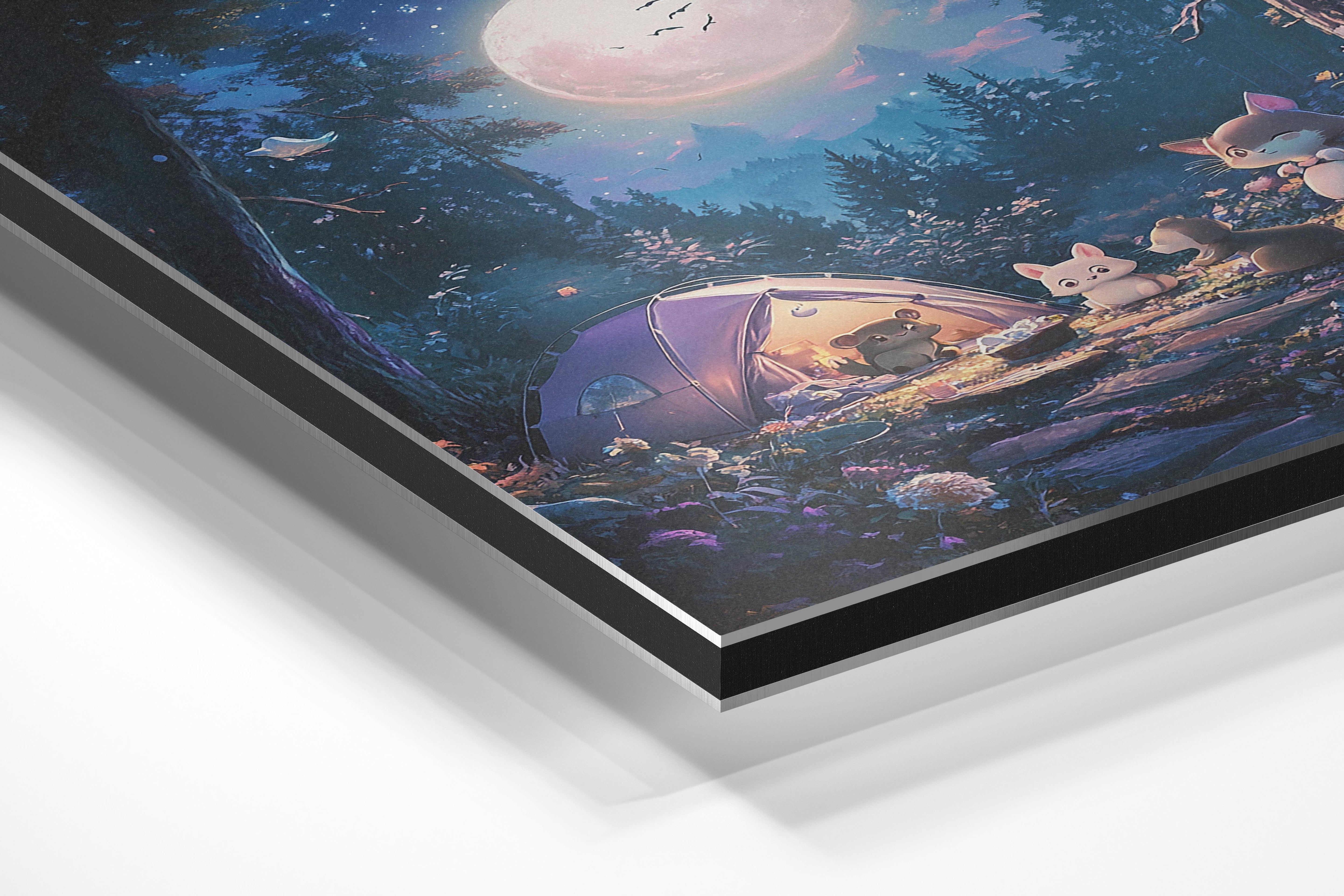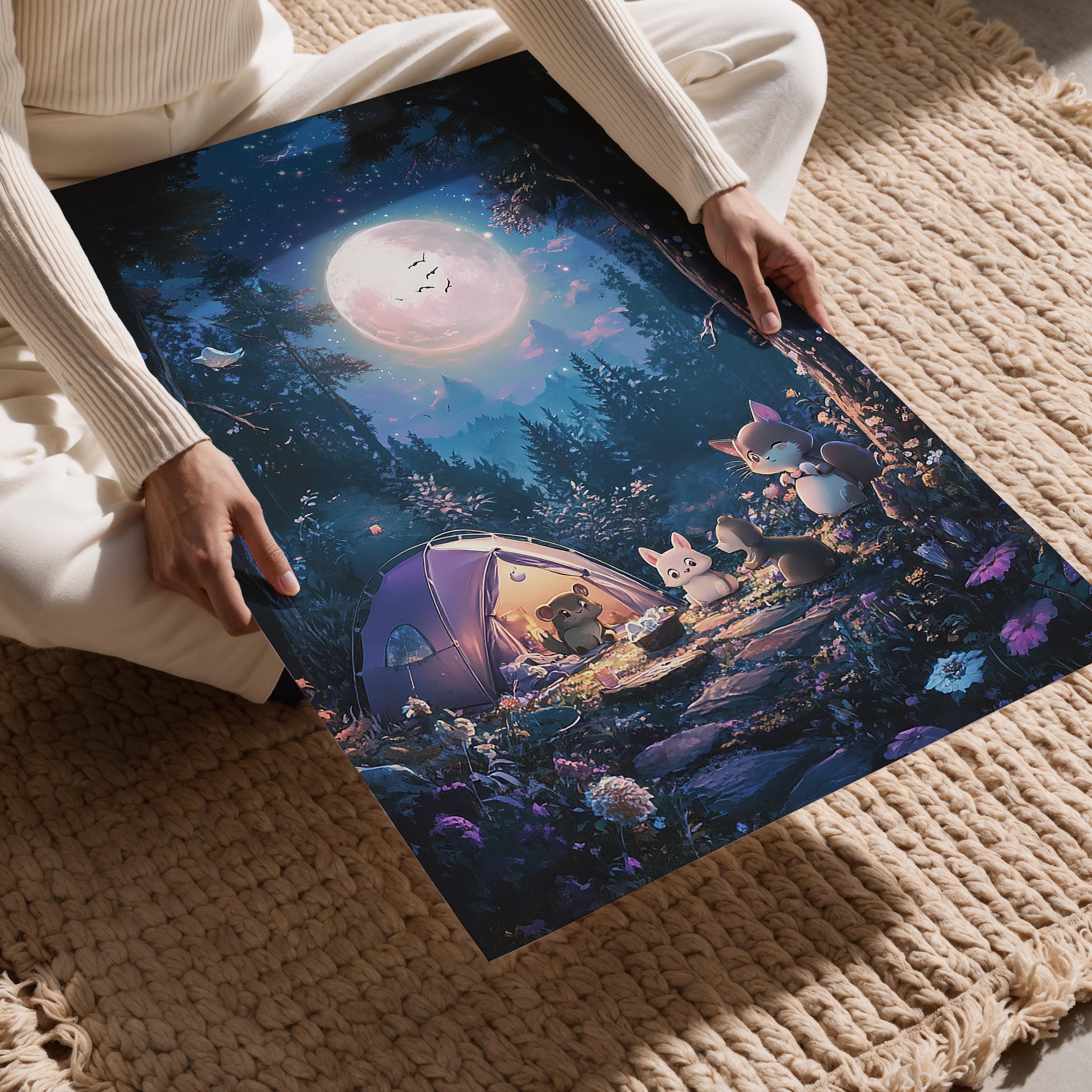 A heartwarming scene of small woodland creatures gathered around a glowing tent under a luminous full moon. The intricate details of the forest, paired with the soft, magical lighting, create a cozy and inviting atmosphere. This artwork captures the essence of friendship and adventure, making it ideal for a child's room or a cozy living space. The dreamy quality of the moonlit sky and vibrant foliage adds a sense of enchantment that appeals to nature lovers and dreamers alike.