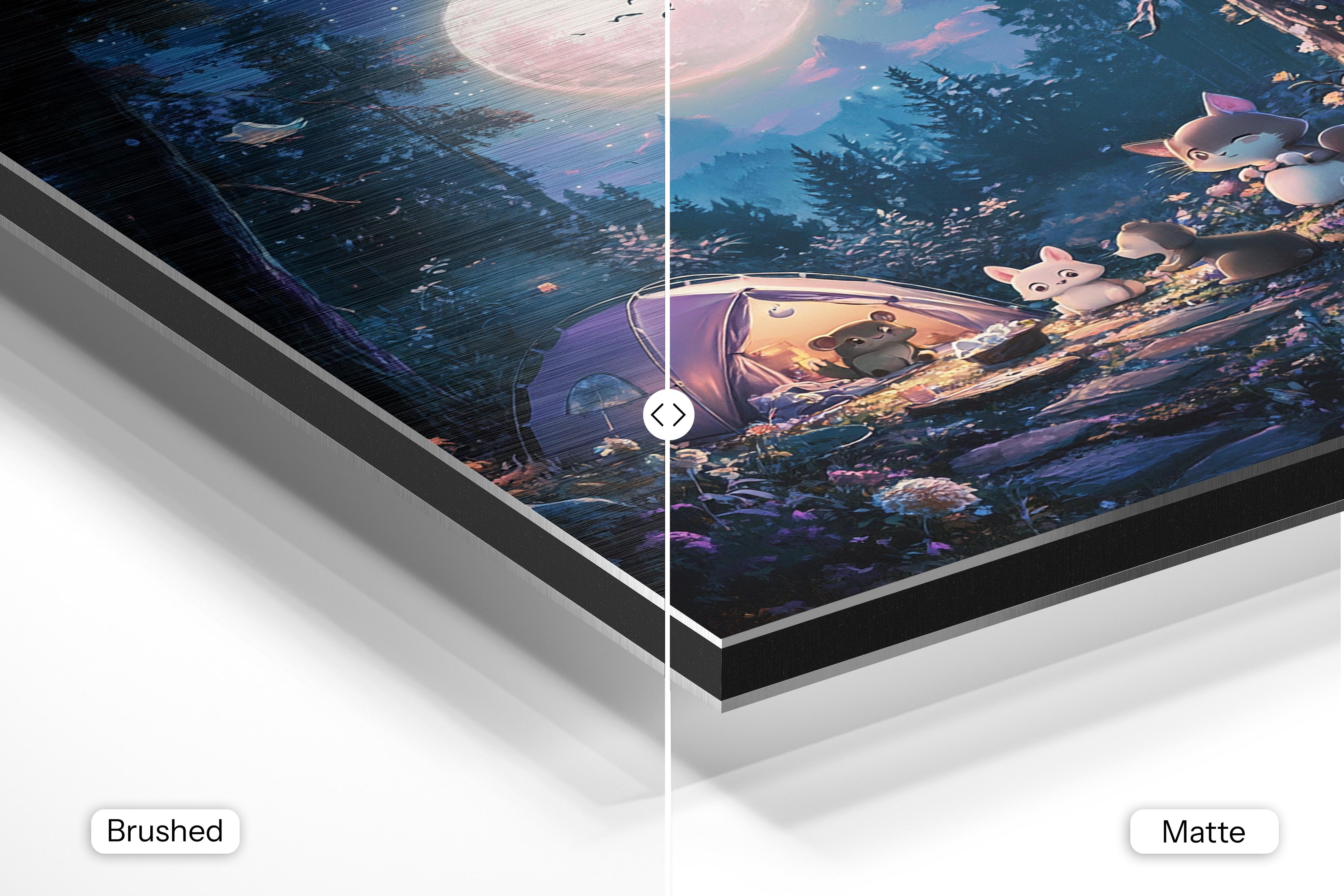 - Matte Aluminum offers a smooth, bright white surface that delivers crisp details and vibrant, true-to-life colors. With its non-reflective finish and subtle silky sheen, it’s perfect for photography, portraits, and colorful artwork—bringing a clean, polished look to any interior.