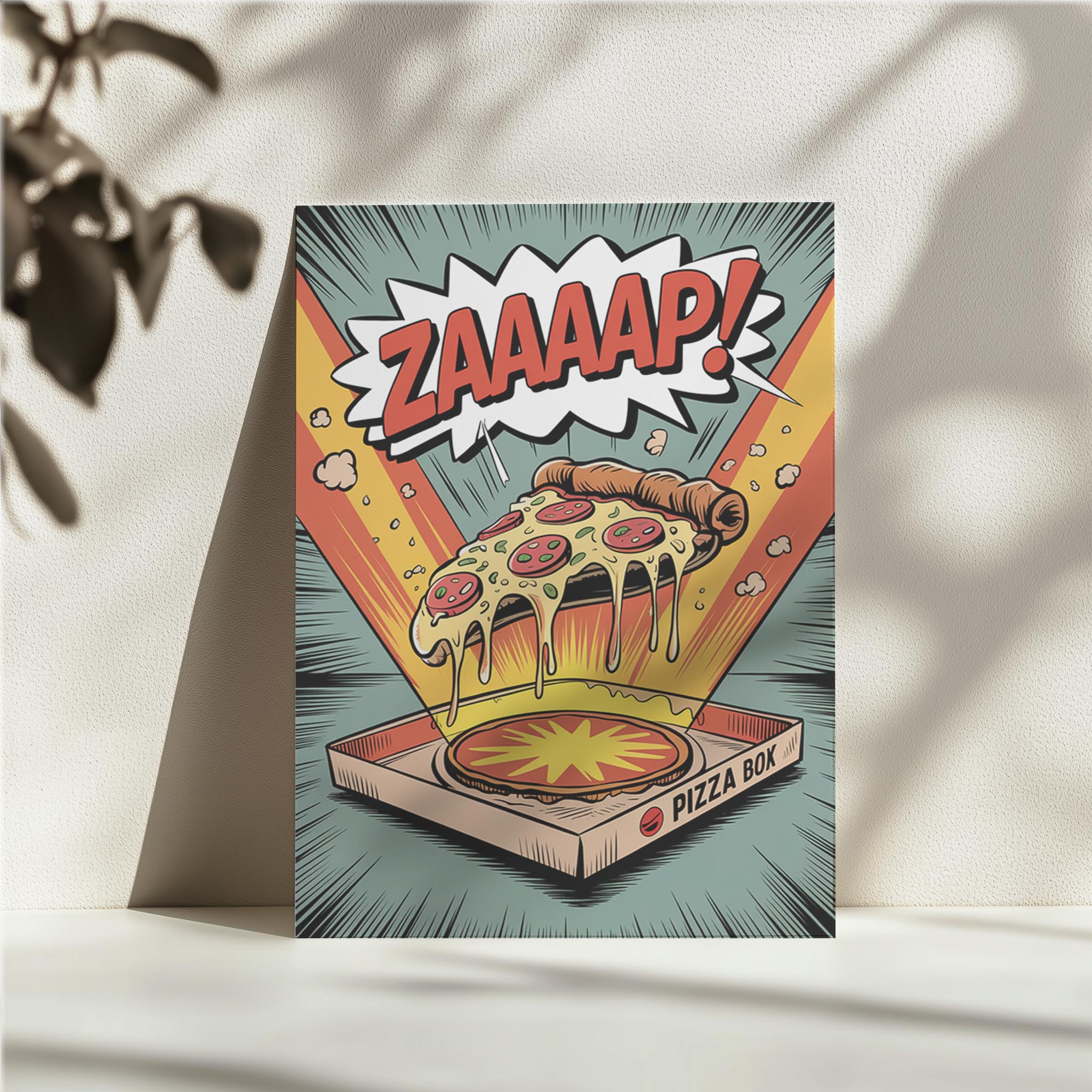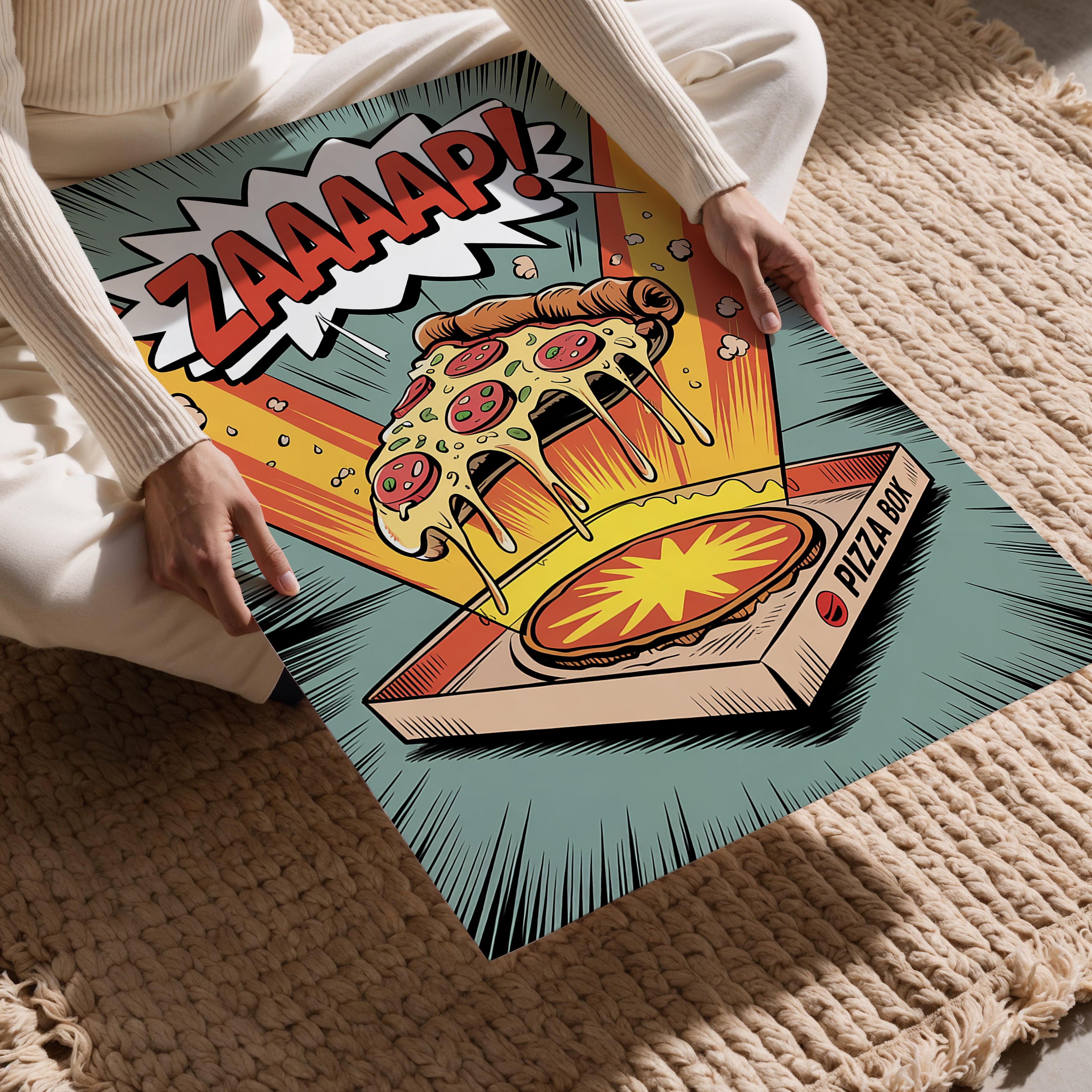 This vivid pop-art style illustration explodes with comic book energy, capturing a slice of pepperoni pizza being dramatically pulled from a pizza box. The word “ZAAAP!” is rendered in bold, electric typography, adding a sense of action and sound. The gooey cheese stretches exaggeratedly, enhancing the dynamism of the scene. With its saturated colors and action-line background, this piece cleverly merges food culture with vintage comic book aesthetics. Ideal for modern kitchens, pizza parlors, or youth-oriented spaces, this artwork offers a playful, energetic vibe that will make any wall pop with fun and flavor.