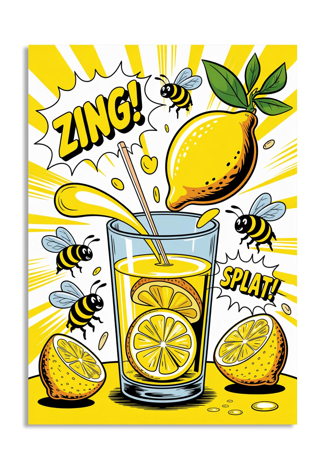 An energetic and vibrant pop-art illustration captures the dynamic zing of fresh lemonade, complete with buzzing bees, citrus splashes, and comic-style exclamations like 'ZING!' and 'SPLAT!'. The exaggerated elements and bold yellow palette emphasize the image’s playful intensity. Perfect for kitchens, dining areas, cafés, or summer-themed settings, this artwork radiates freshness and excitement. Its cartoonish charm and comic book aesthetic make it ideal for retro or quirky interiors, infusing the space with brightness and whimsy.