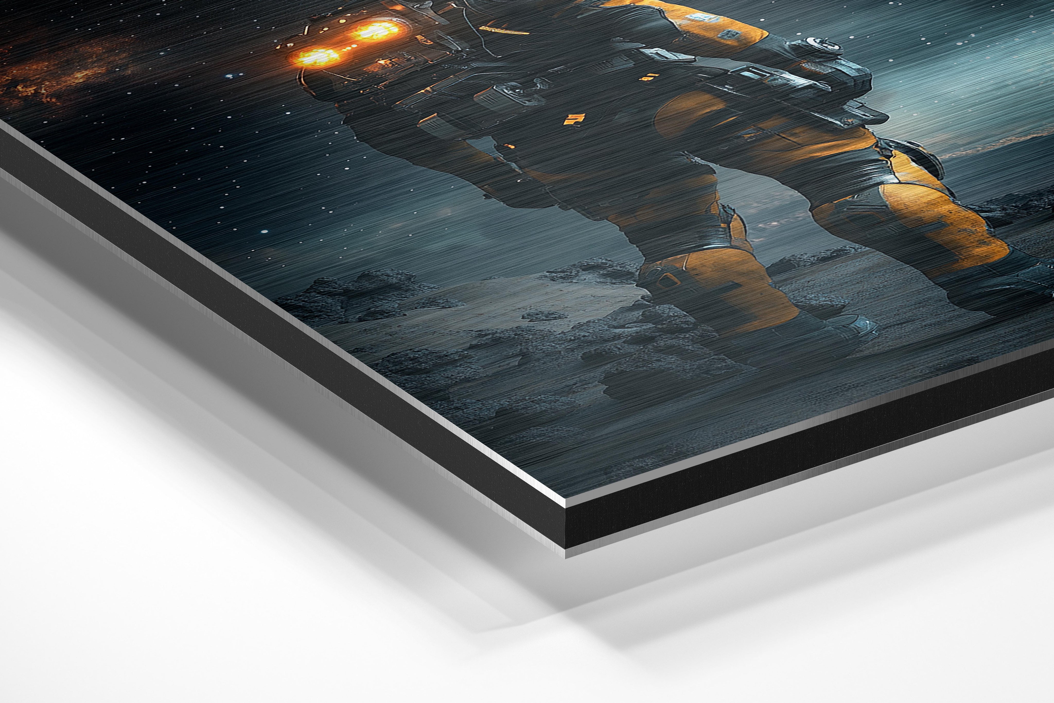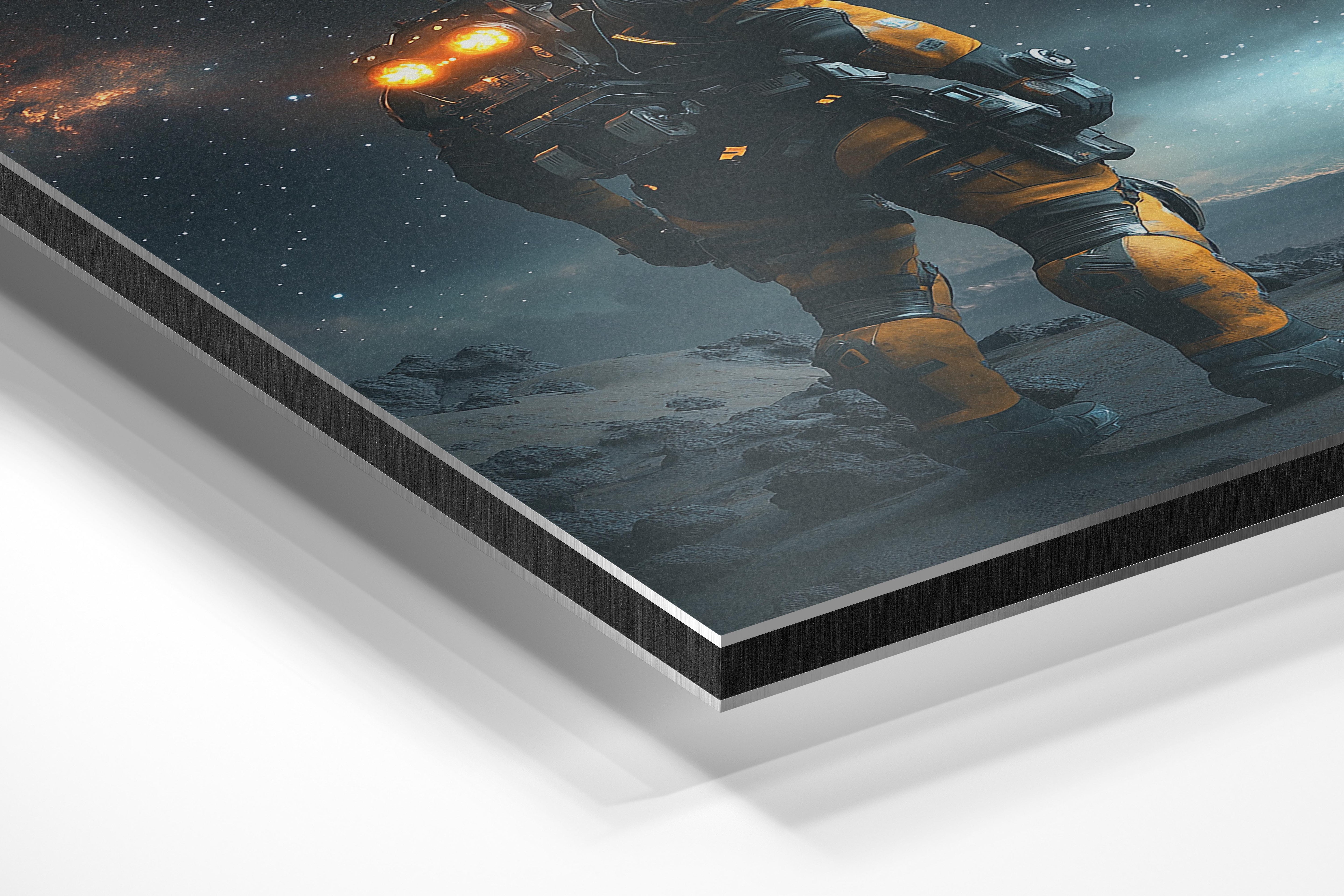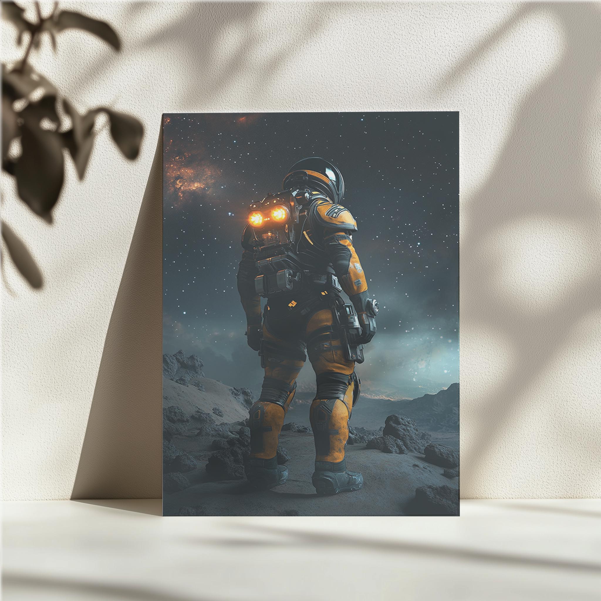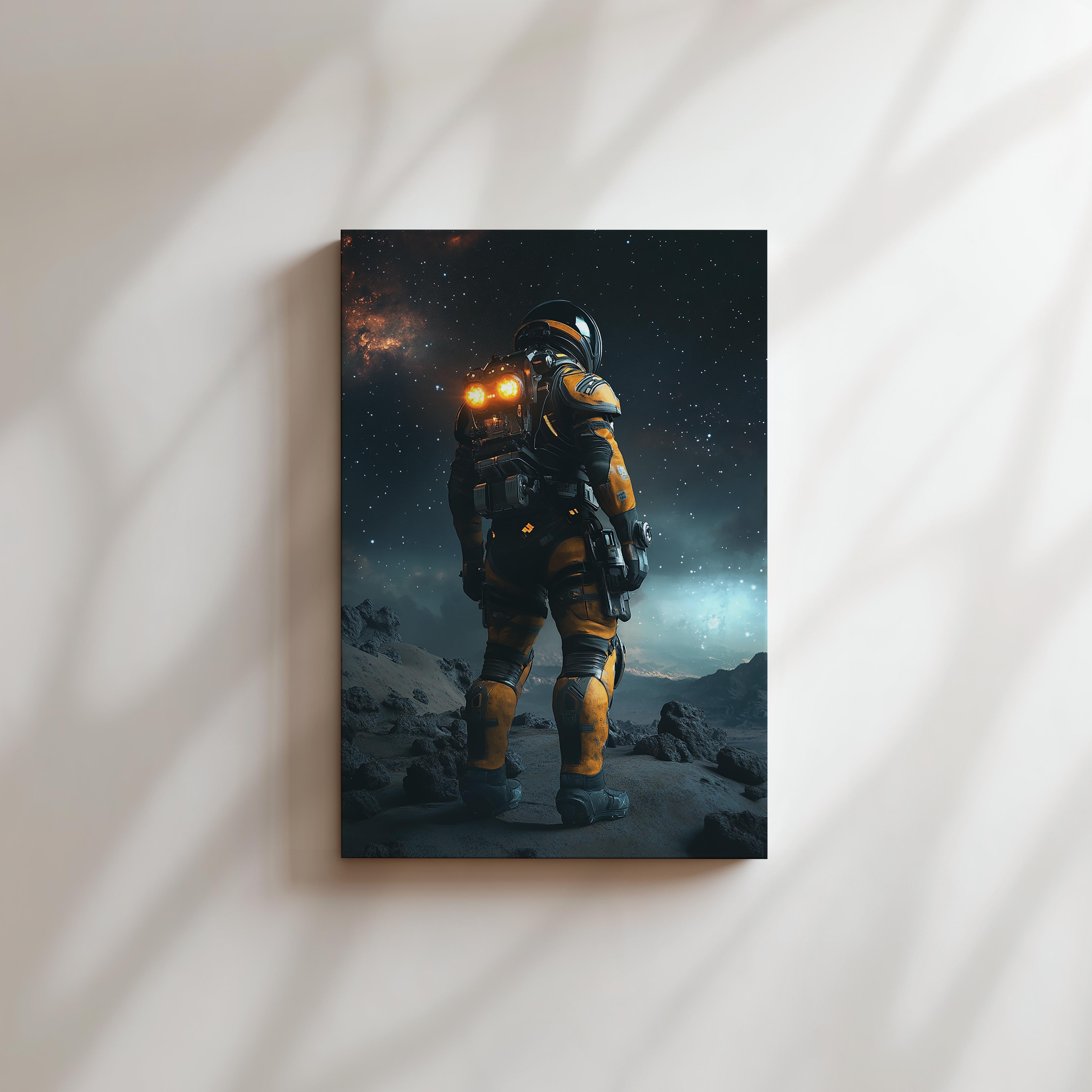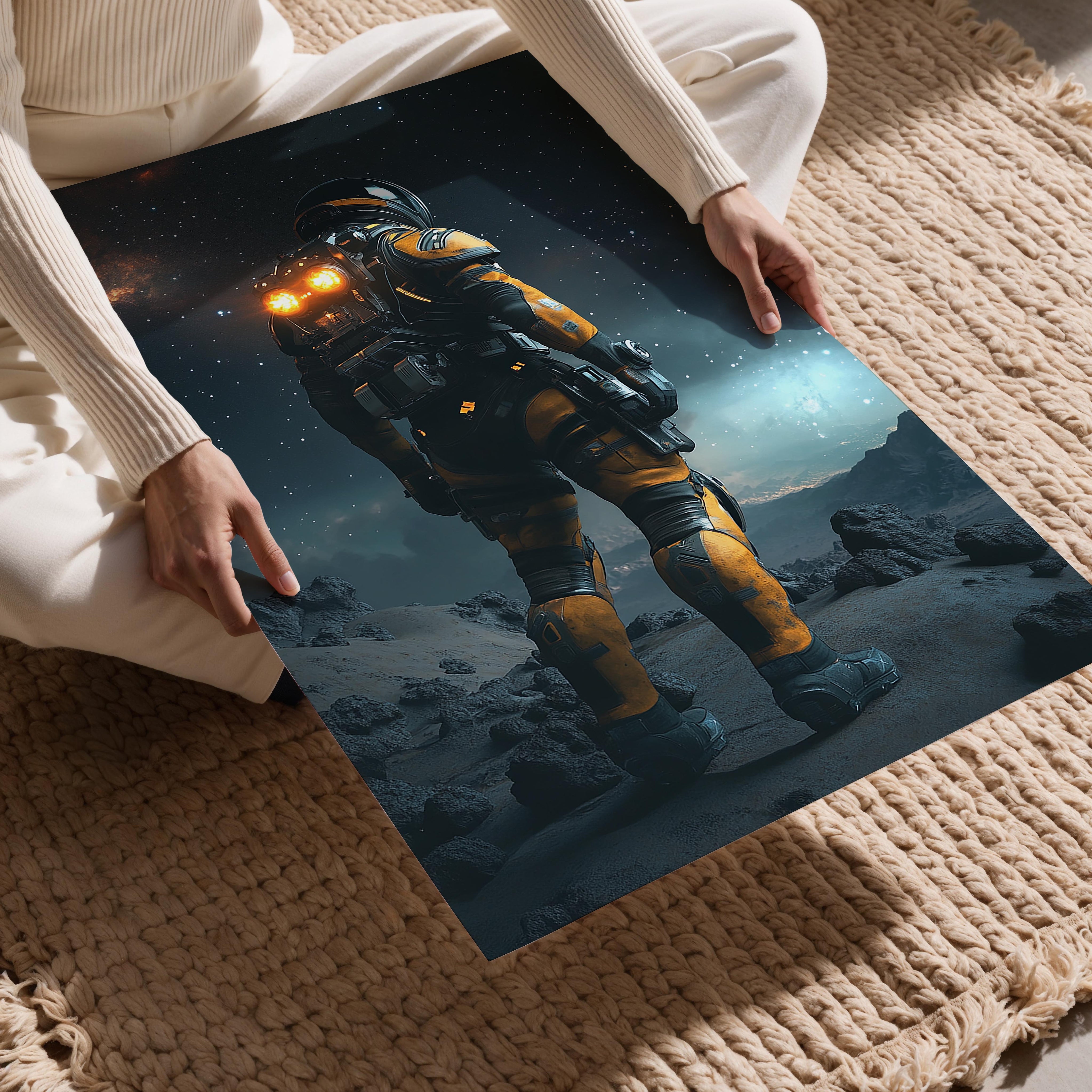 A futuristic astronaut stands on a rugged alien surface under a starry sky, surrounded by the vastness of space. The glowing lights from their suit create a contrast against the rocky terrain, symbolizing the relentless human spirit to explore the unknown. This captivating visual captures the essence of science fiction adventure, evoking a sense of wonder about what lies beyond our planet. With detailed textures and a cosmic backdrop, the image serves as a tribute to the unyielding curiosity of humankind. It’s an ideal representation for futuristic themes, space exploration, or technological advancement.