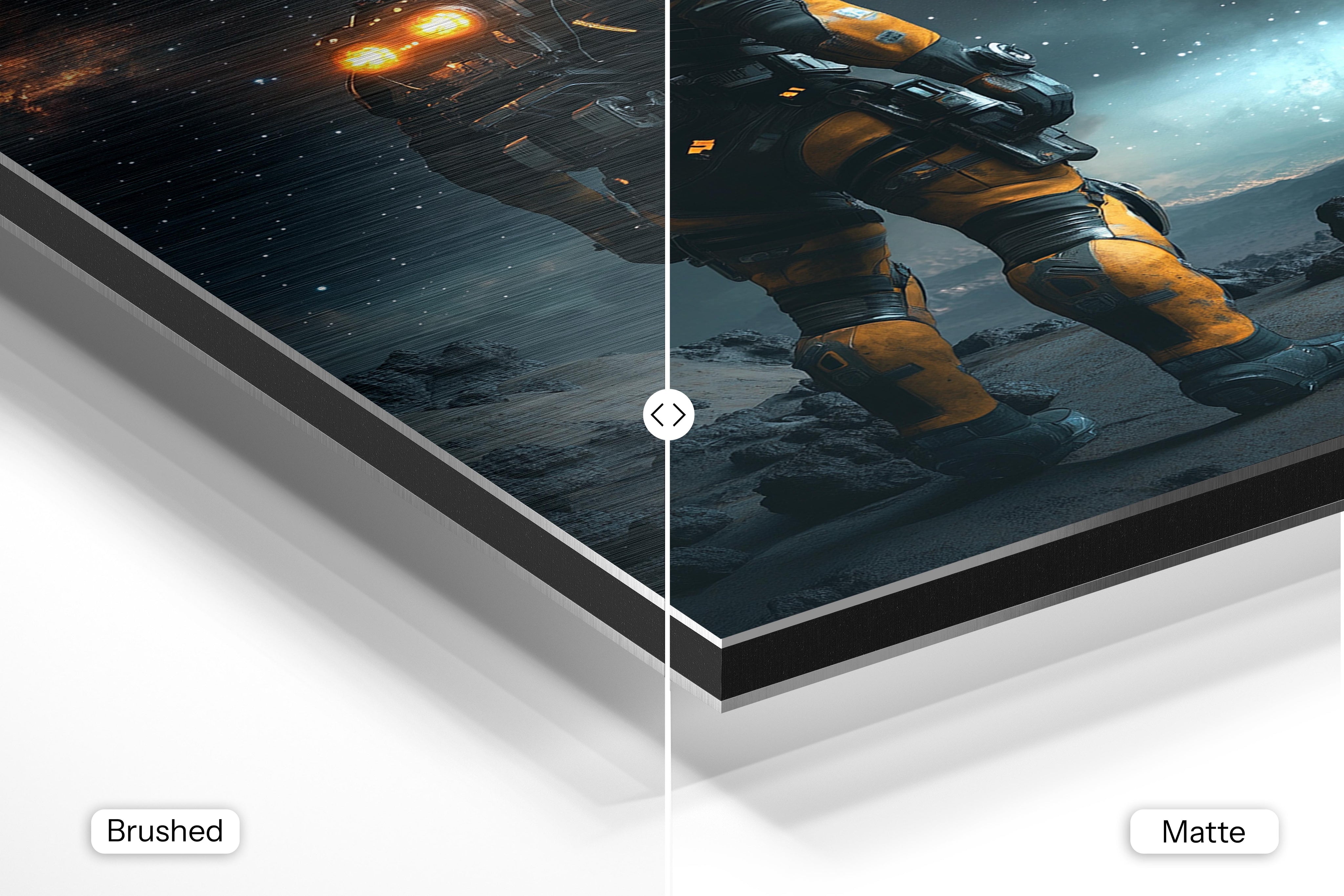 - Brushed Aluminum, on the other hand, features a raw metallic texture with visible brush strokes. Whites and highlights in your image let the silver surface show through, adding a dramatic, shimmering effect. Ideal for black-and-white images, minimalist designs, or abstract art, it creates a bold, industrial vibe with a modern edge.