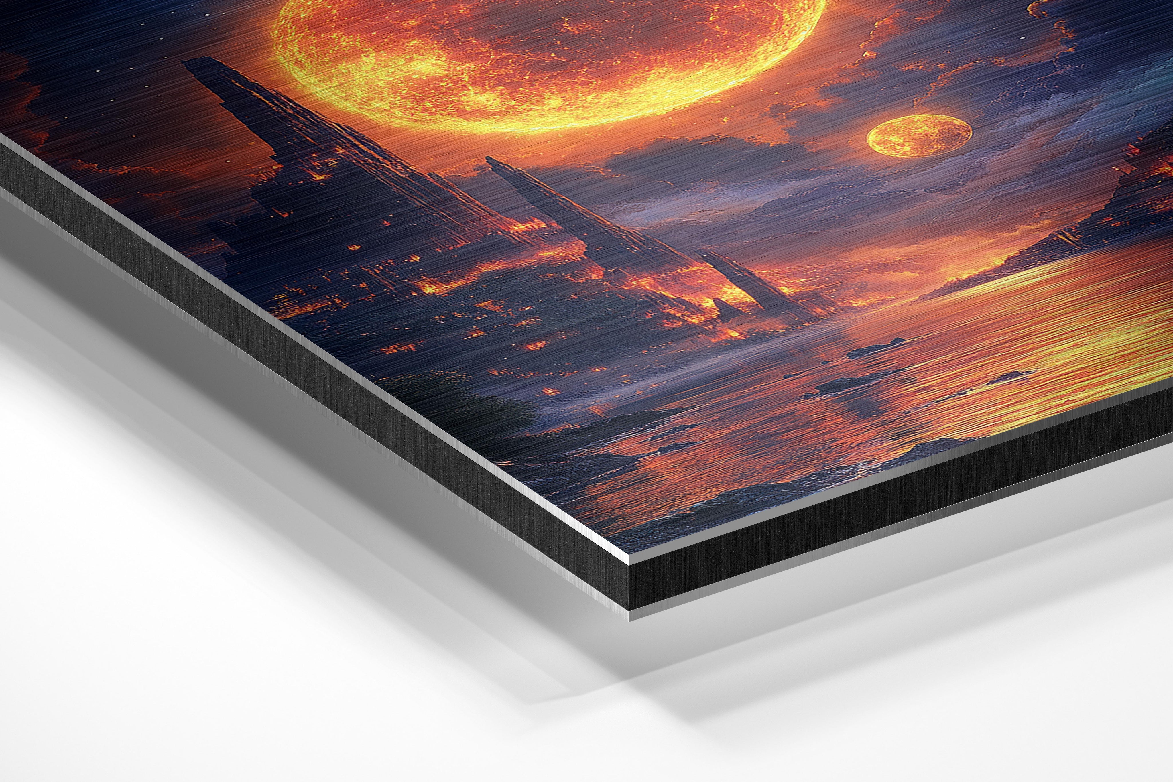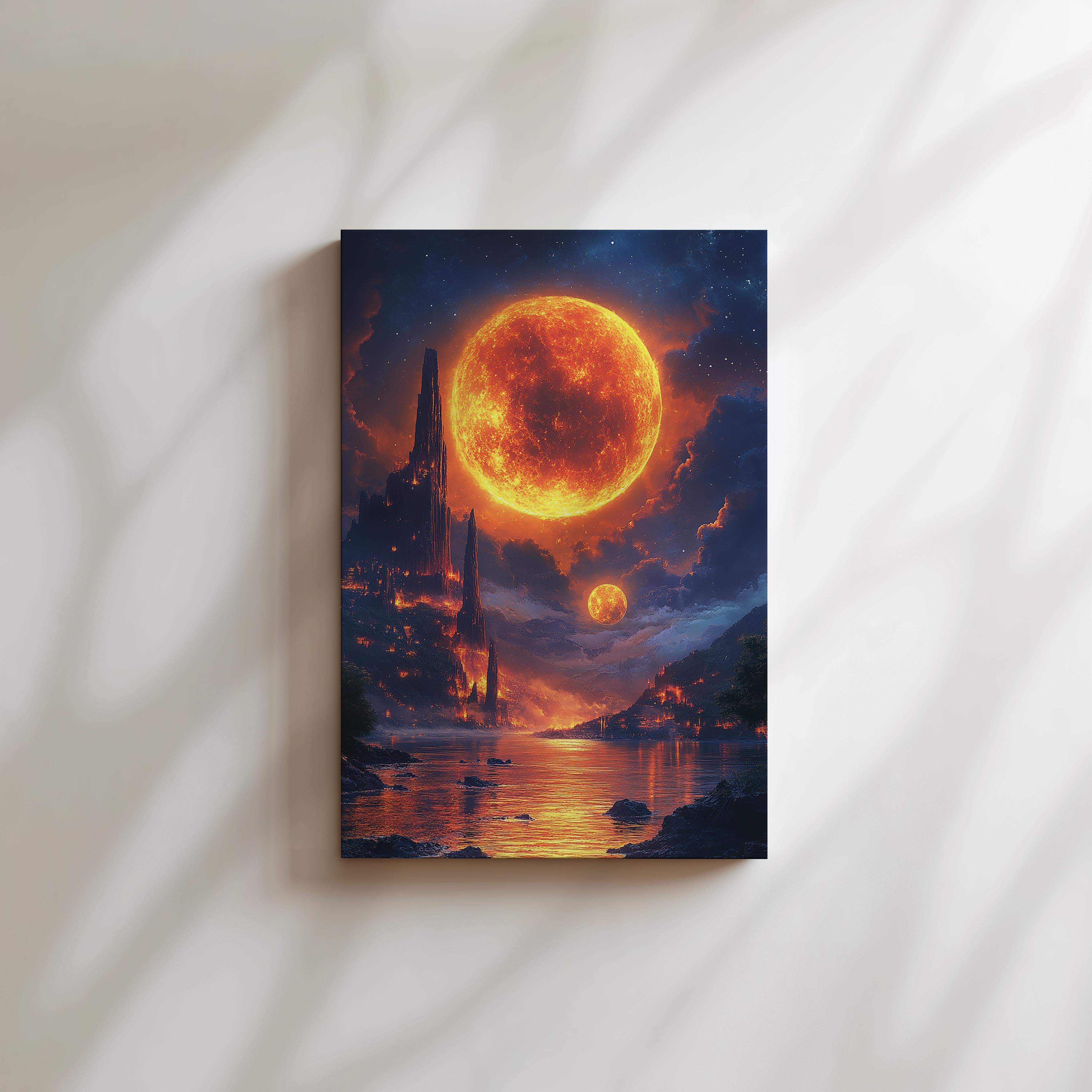 A city burns under the intense glow of twin suns, creating a dramatic contrast between civilization and nature’s overwhelming power. The towering flames reflect the chaos and destruction, while the twin suns dominate the skyline with their fiery brilliance. This apocalyptic scene highlights the fragility of human structures in the face of cosmic forces. The image’s vibrant colors and intricate details draw viewers into a world of turmoil and resilience. It’s a striking visual that speaks to themes of survival, destruction, and the ever-changing relationship between humanity and its environment, perfect for speculative or futuristic storytelling.