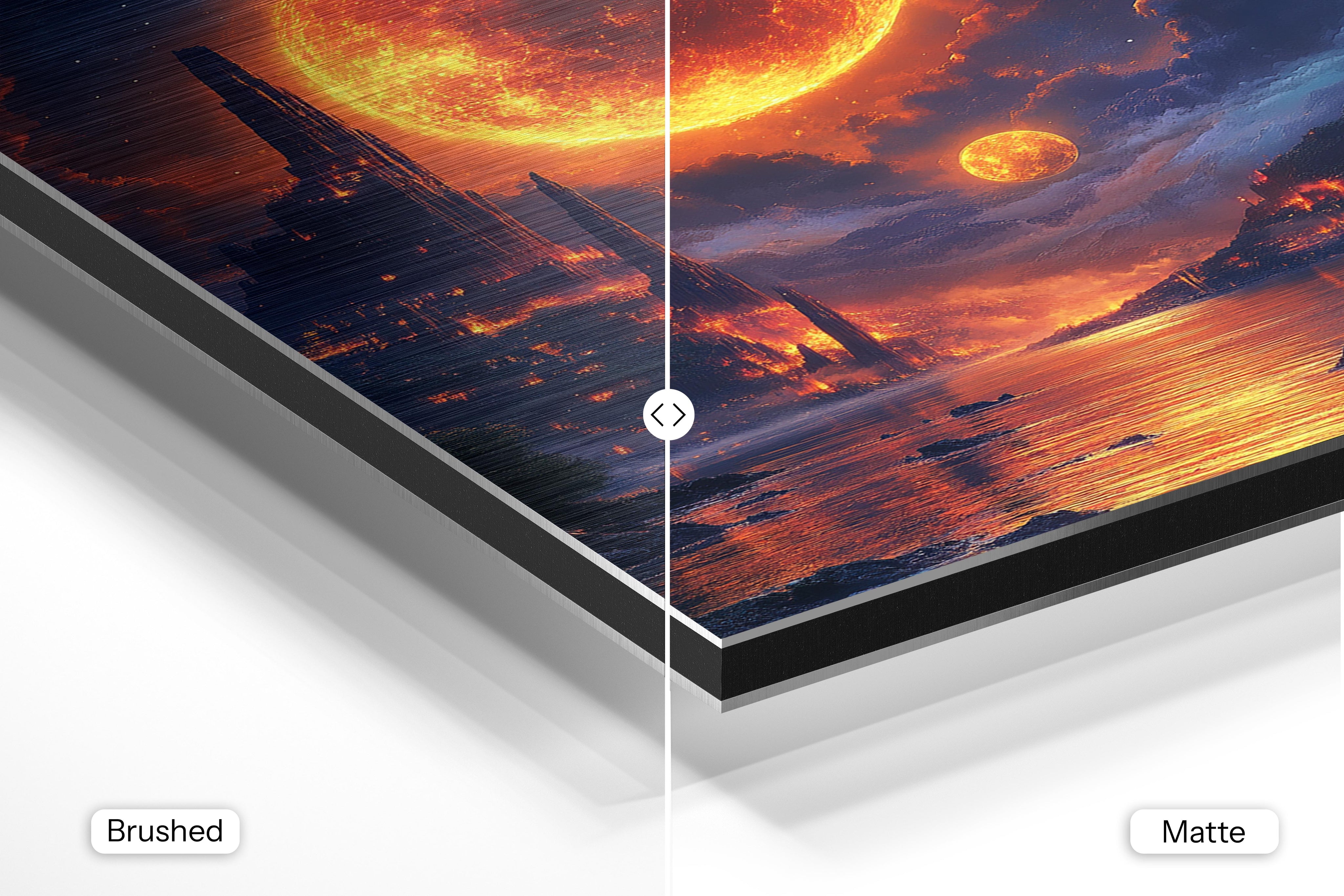 - Brushed Aluminum, on the other hand, features a raw metallic texture with visible brush strokes. Whites and highlights in your image let the silver surface show through, adding a dramatic, shimmering effect. Ideal for black-and-white images, minimalist designs, or abstract art, it creates a bold, industrial vibe with a modern edge.