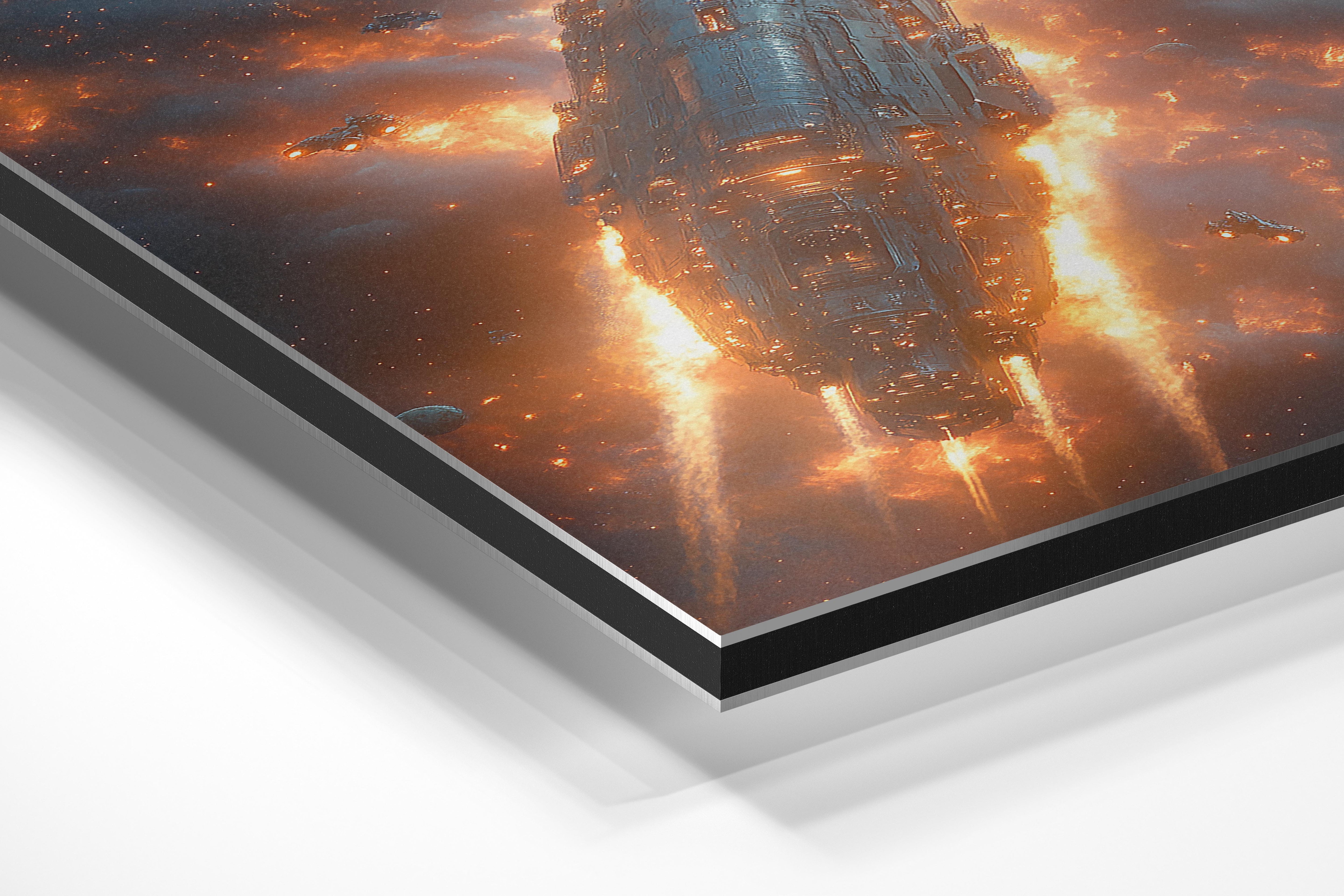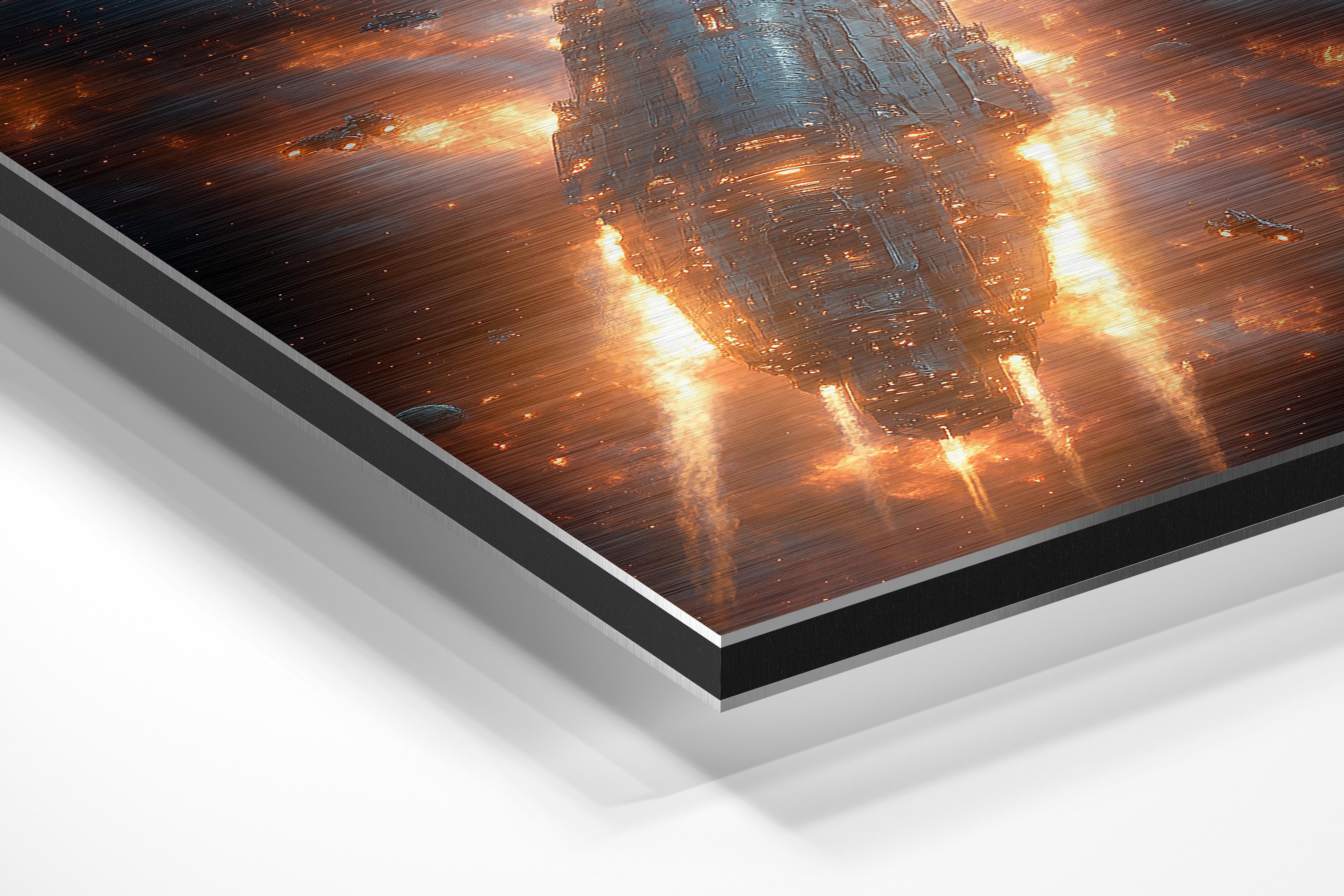 A massive starship, engulfed in flames, hurtles through a space battlefield, leaving behind a trail of destruction. The golden glow of the fire contrasts against the dark void of space, creating an intense, cinematic effect. The dynamic energy in this piece conveys a sense of adventure and heroism, making it perfect for a sci-fi lover’s collection. Whether hung in a home office or a high-tech entertainment space, this artwork ignites a sense of intergalactic drama and wonder.