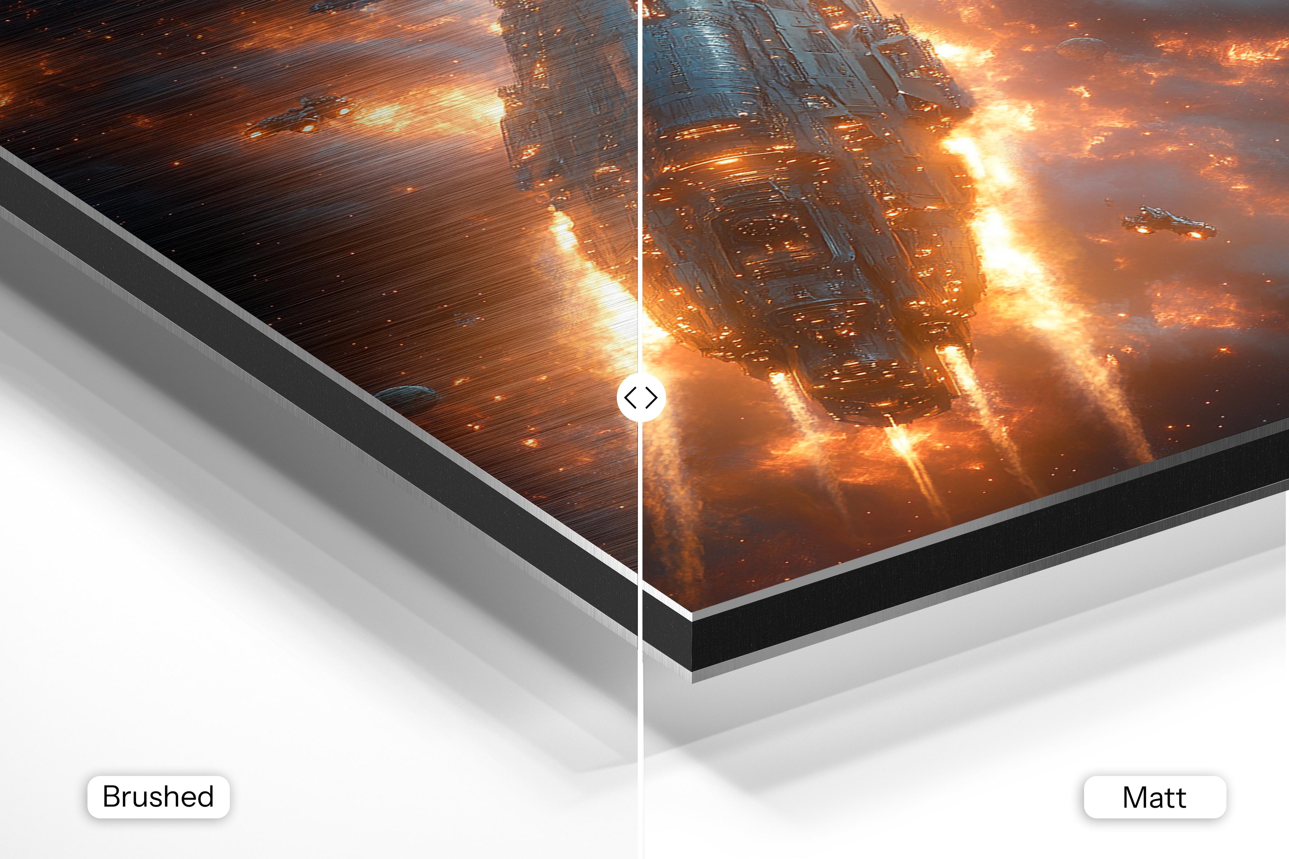 - Brushed Aluminum, on the other hand, features a raw metallic texture with visible brush strokes. Whites and highlights in your image let the silver surface show through, adding a dramatic, shimmering effect. Ideal for black-and-white images, minimalist designs, or abstract art, it creates a bold, industrial vibe with a modern edge.