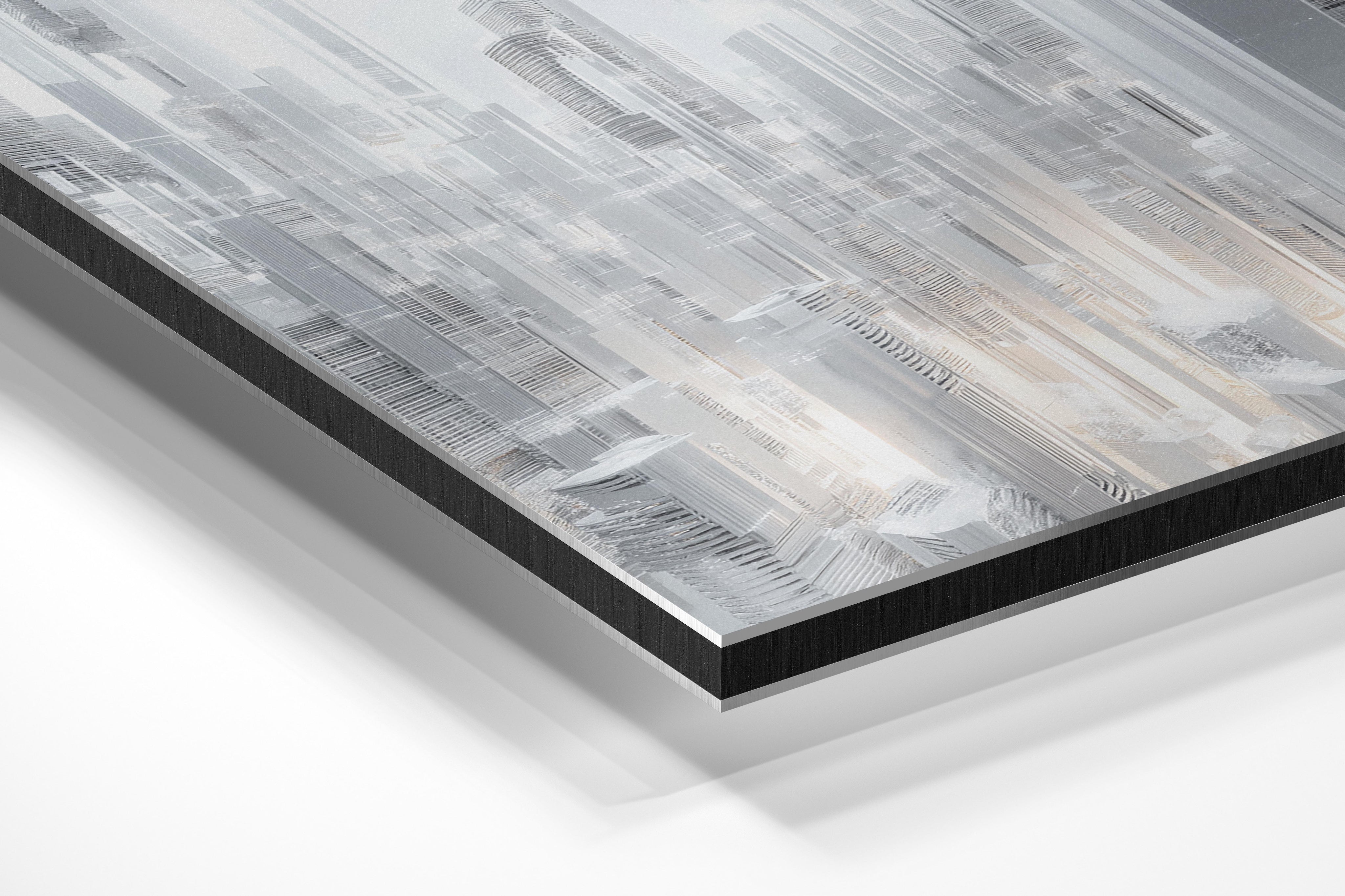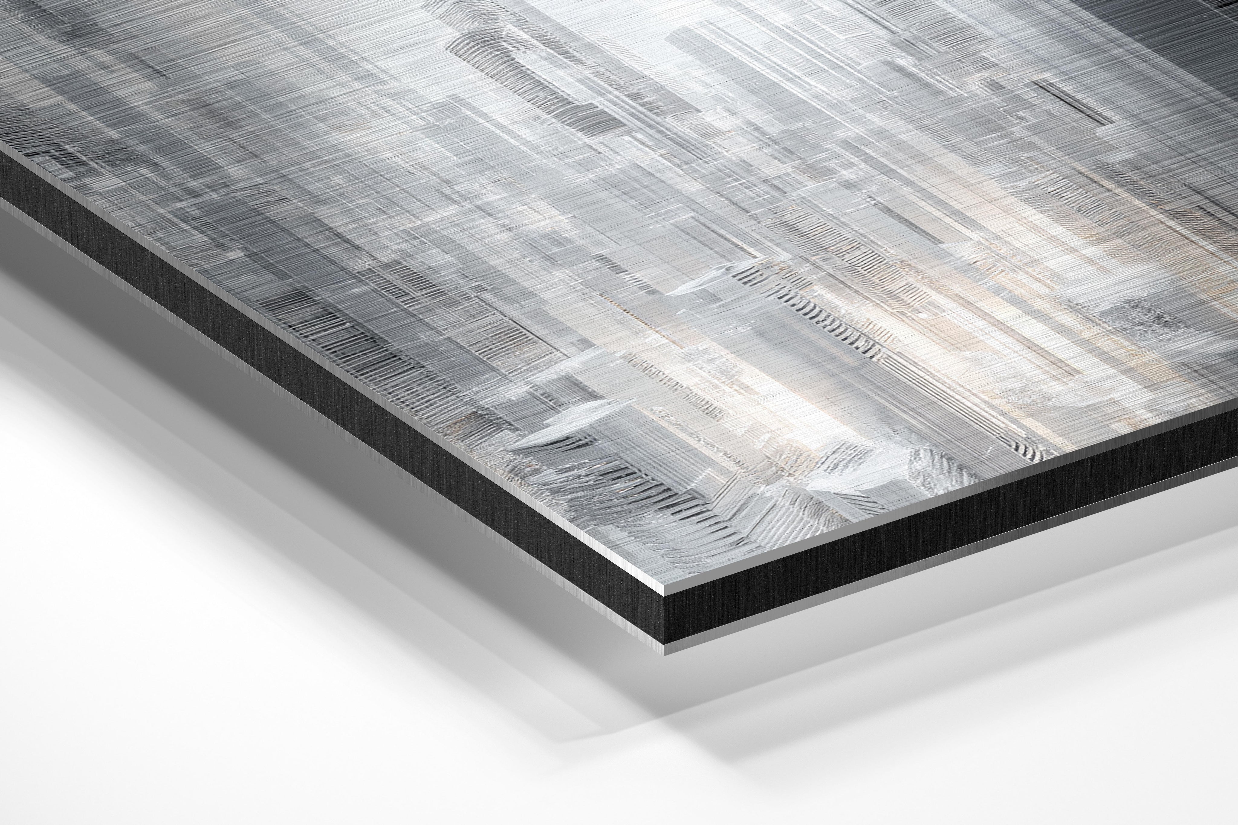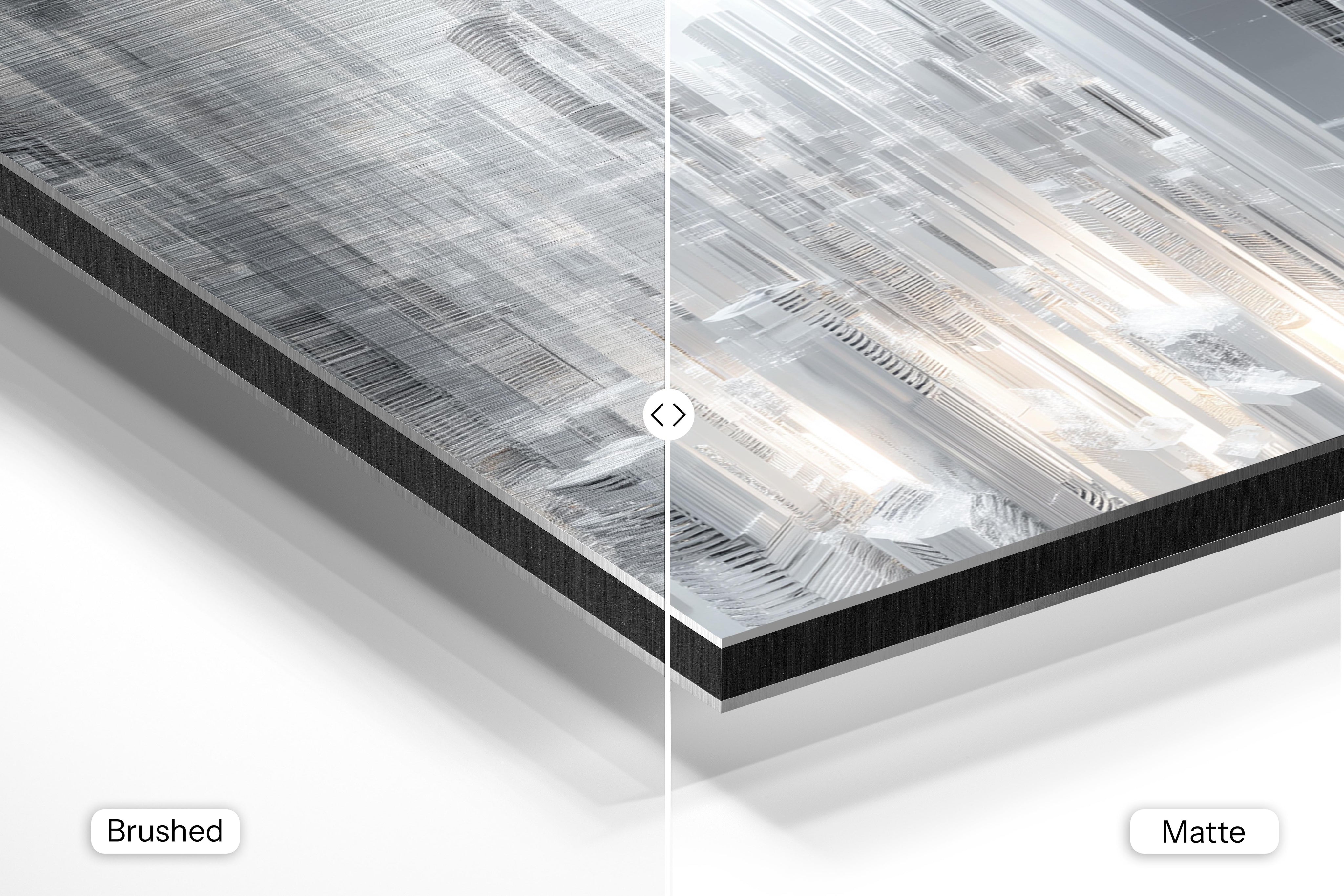 - Brushed Aluminum, on the other hand, features a raw metallic texture with visible brush strokes. Whites and highlights in your image let the silver surface show through, adding a dramatic, shimmering effect. Ideal for black-and-white images, minimalist designs, or abstract art, it creates a bold, industrial vibe with a modern edge.