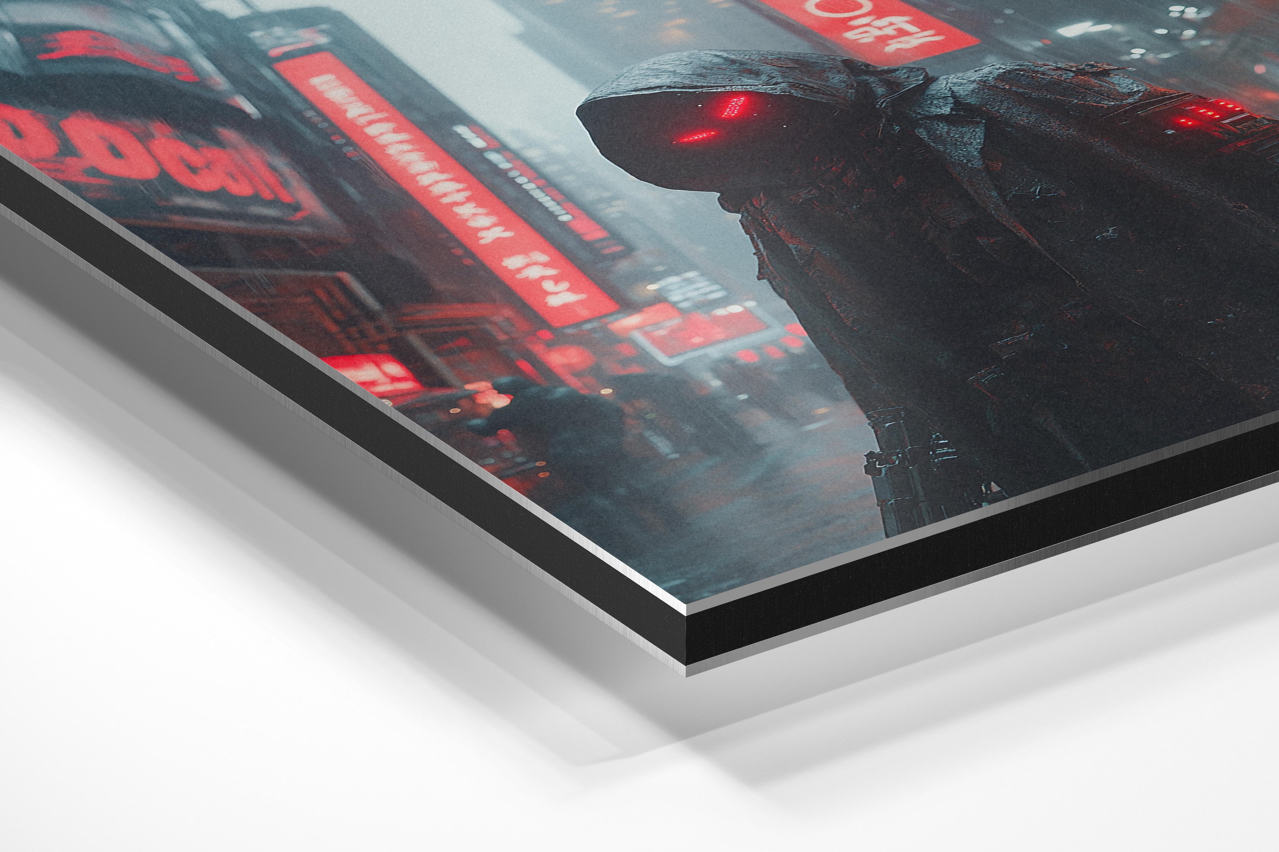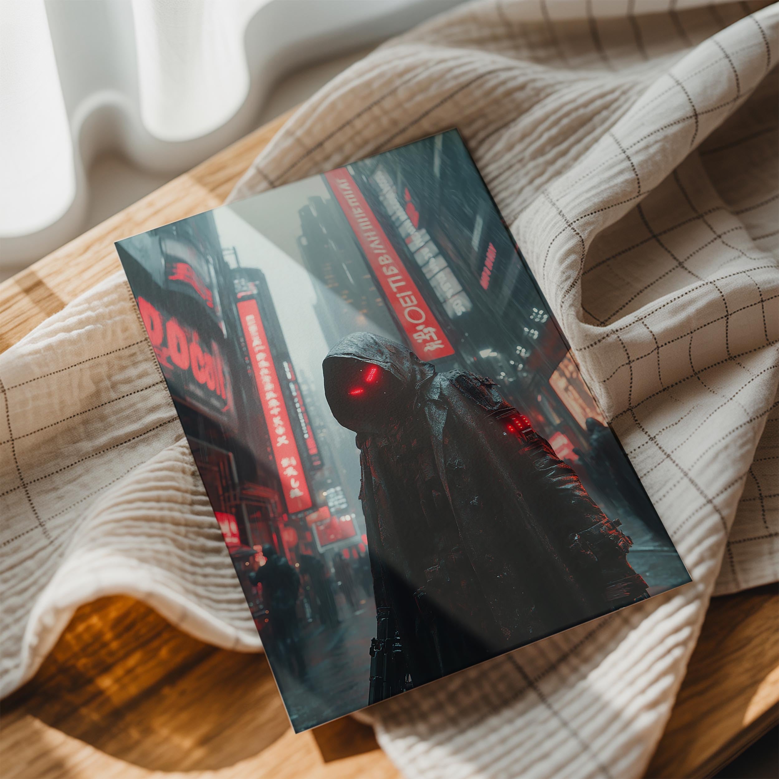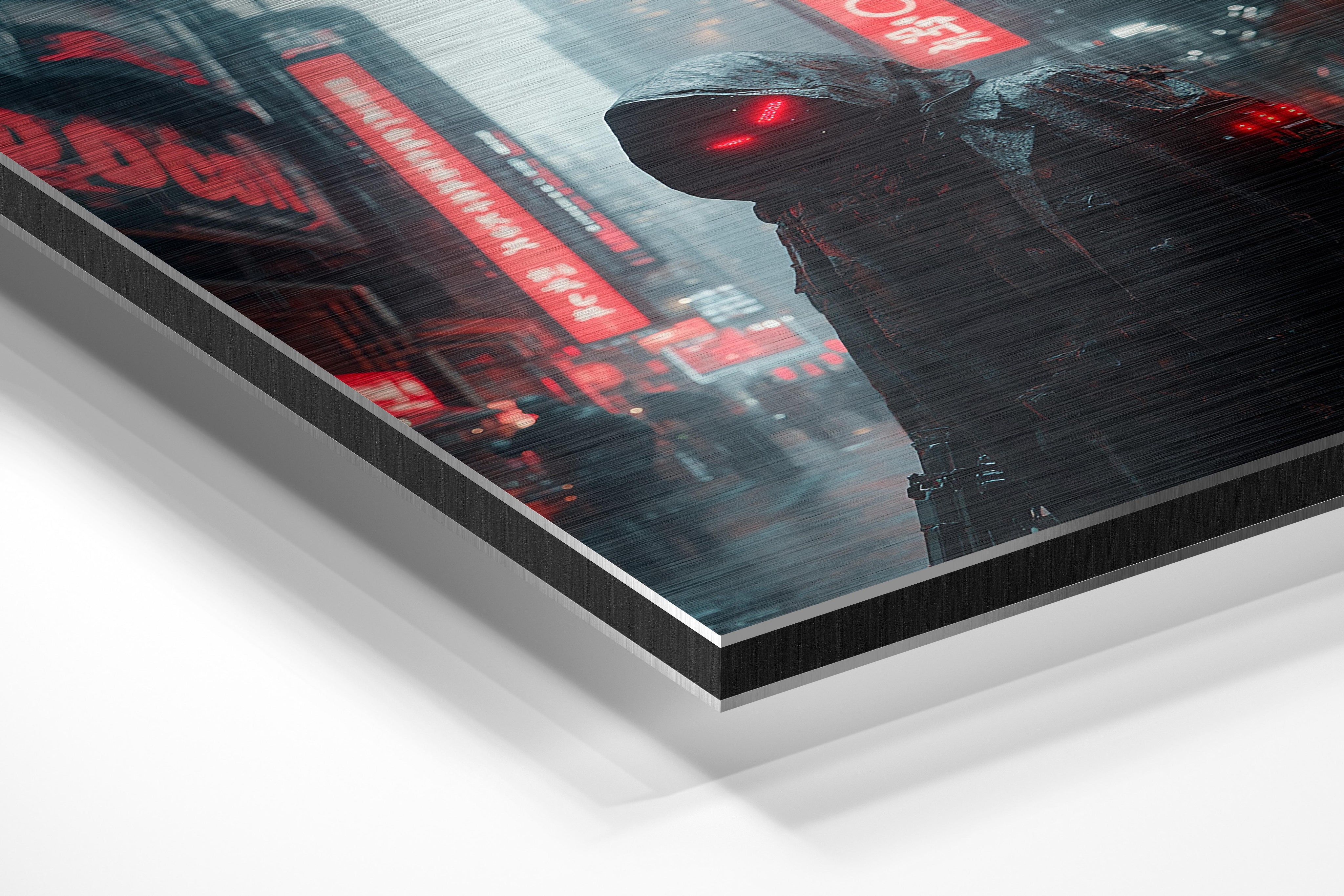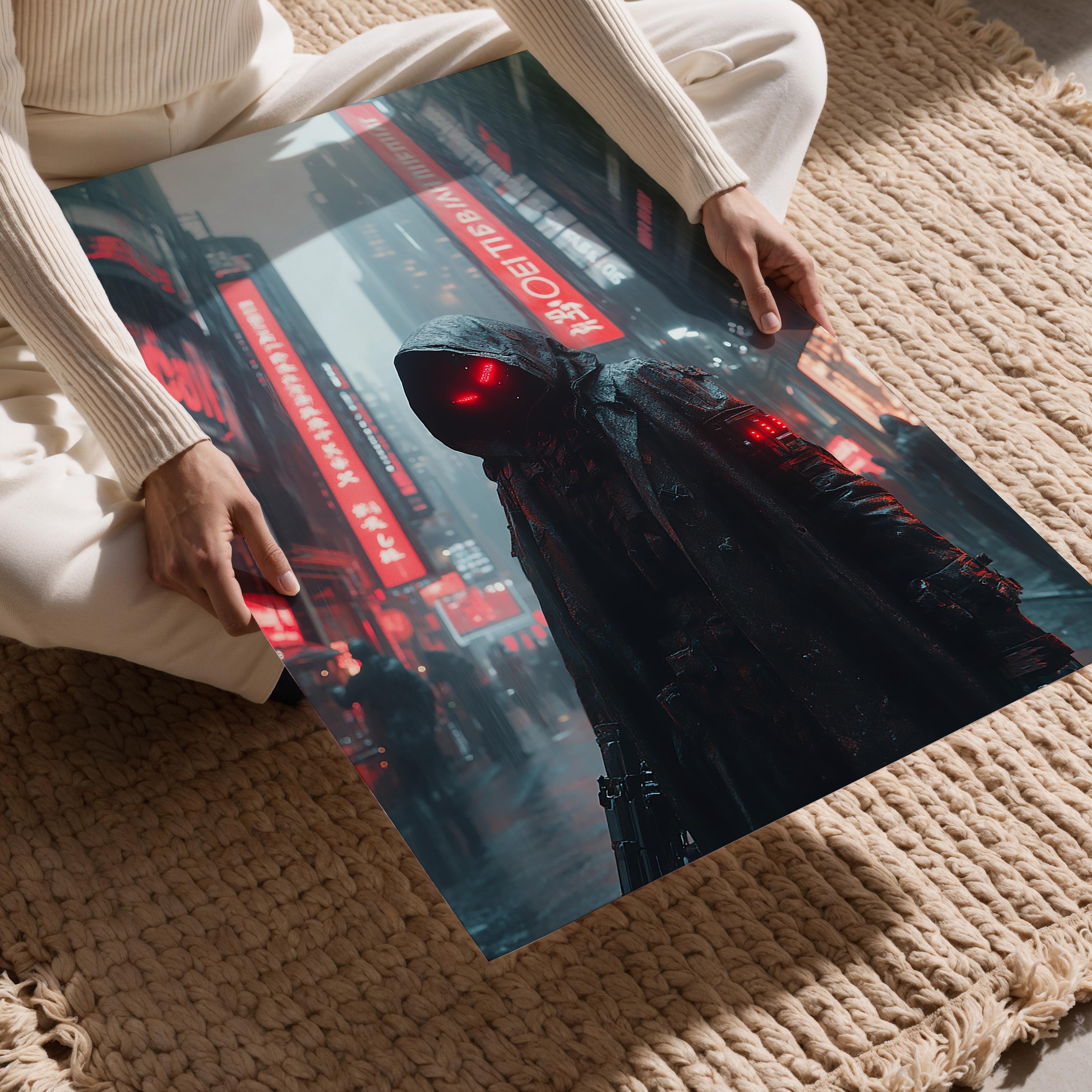 A hooded figure stands in a cyberpunk cityscape, glowing red eyes piercing through the misty rain. The neon billboards and urban sprawl behind him suggest a world of high-tech surveillance and mystery. The character’s concealed identity and imposing stance add an air of intrigue, making this a perfect piece for fans of futuristic dystopian themes. It would suit a contemporary apartment or an industrial-styled office, adding a bold and thought-provoking presence.