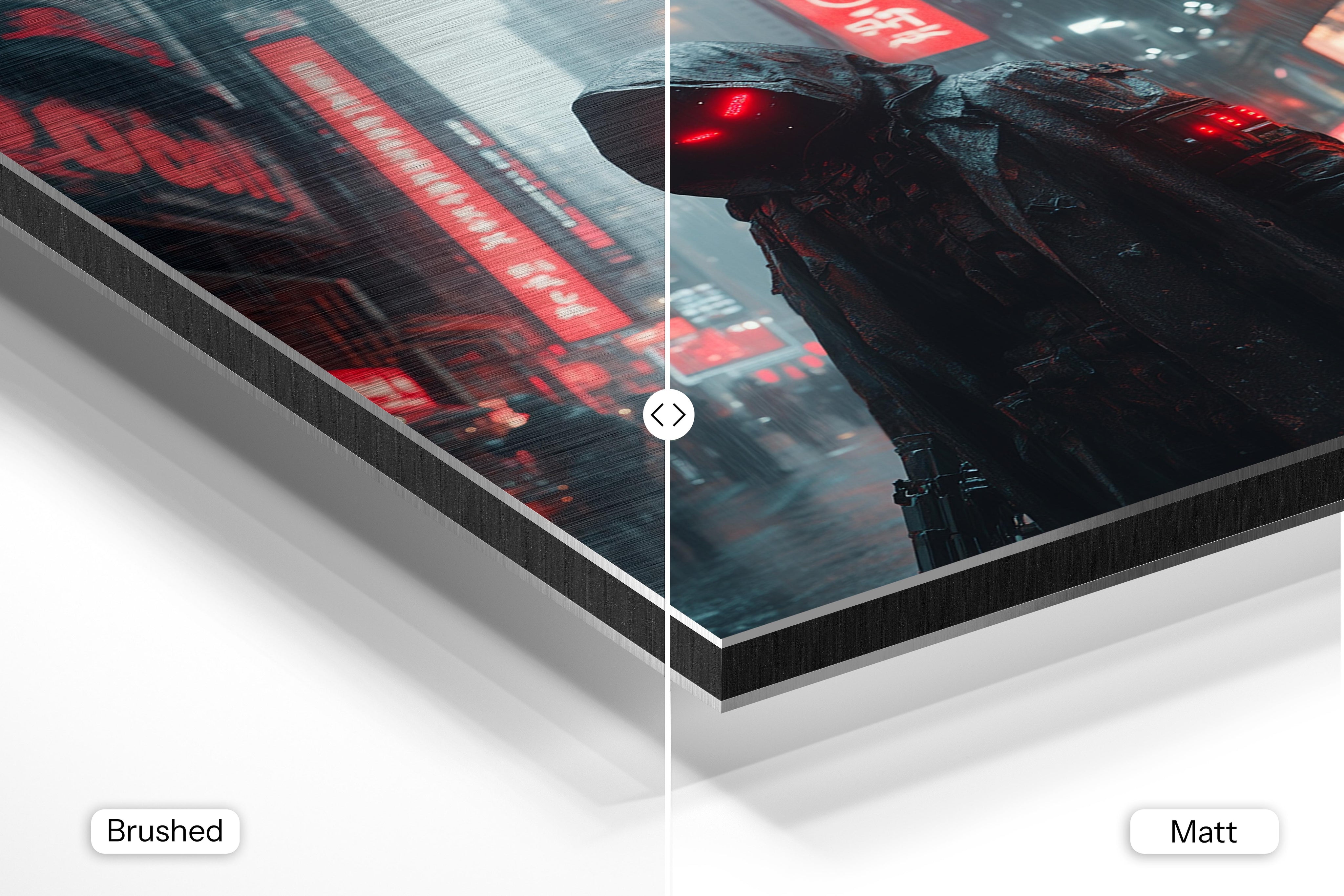 - Brushed Aluminum, on the other hand, features a raw metallic texture with visible brush strokes. Whites and highlights in your image let the silver surface show through, adding a dramatic, shimmering effect. Ideal for black-and-white images, minimalist designs, or abstract art, it creates a bold, industrial vibe with a modern edge.