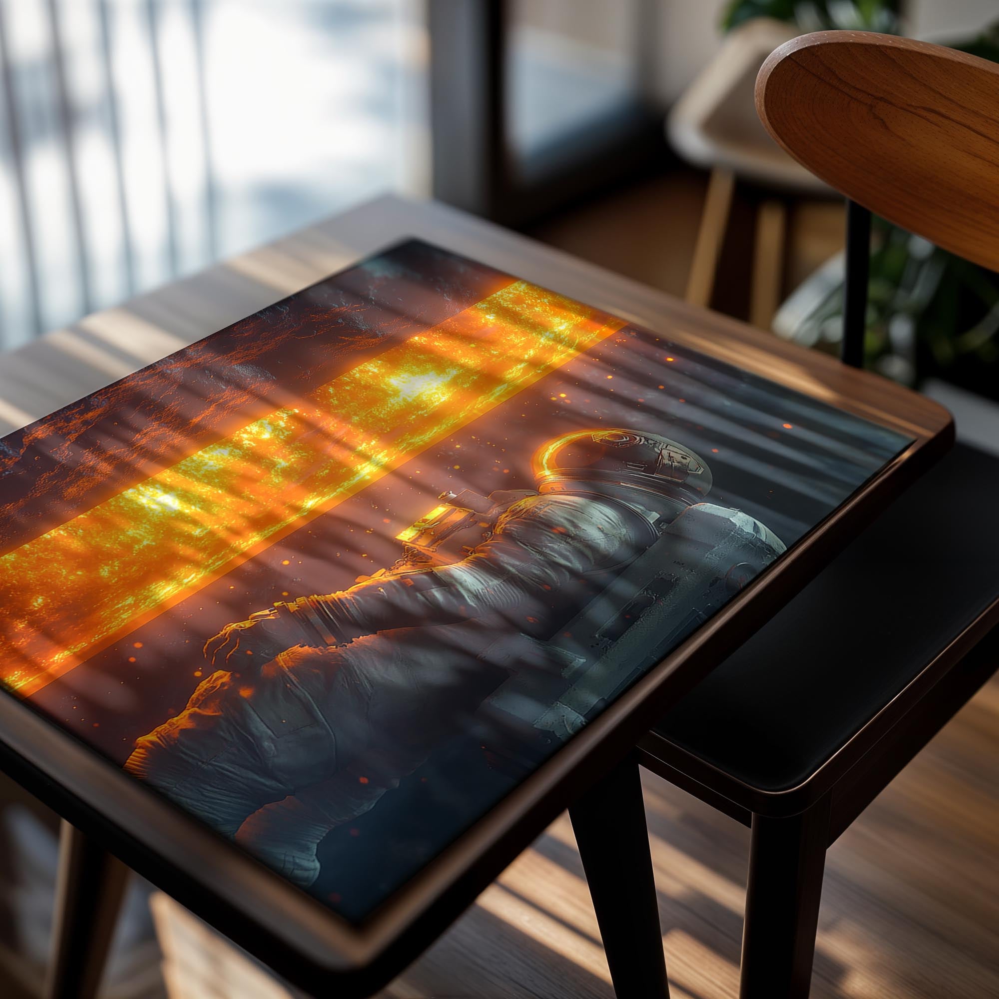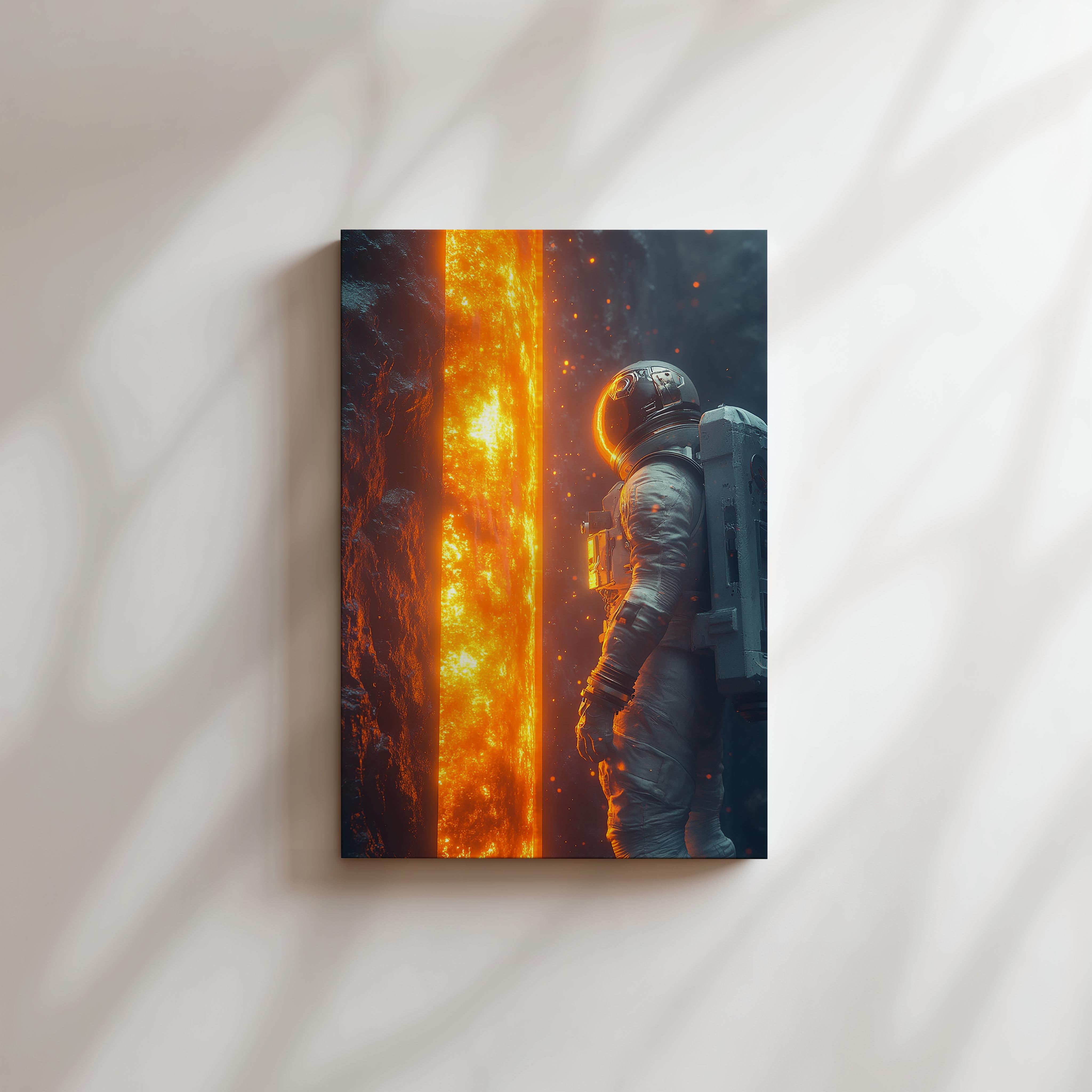 A lone astronaut examines a vertical fissure of radiant orange energy, standing on jagged rocks that accentuate the perilous environment. The glowing energy from the rift casts reflections on the astronaut’s suit, creating a dynamic interplay of light and shadow. This image conveys the dangers and wonders of interstellar exploration, highlighting resilience in the face of otherworldly challenges. It invites viewers to imagine the scientific breakthroughs and potential threats lurking on distant worlds. With its intense colors and dramatic composition, this visual perfectly encapsulates the spirit of adventure and discovery, ideal for themes related to space and innovation.