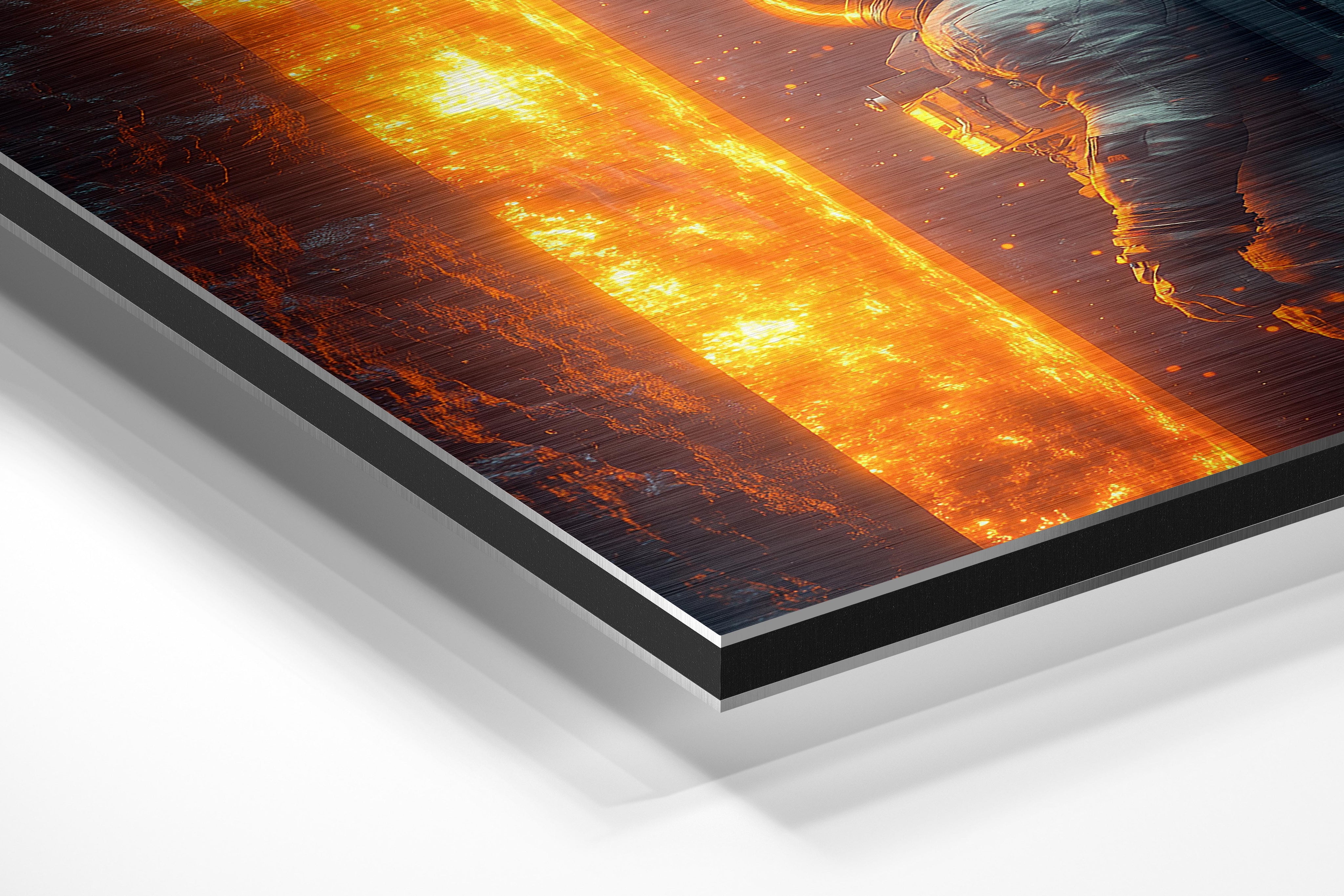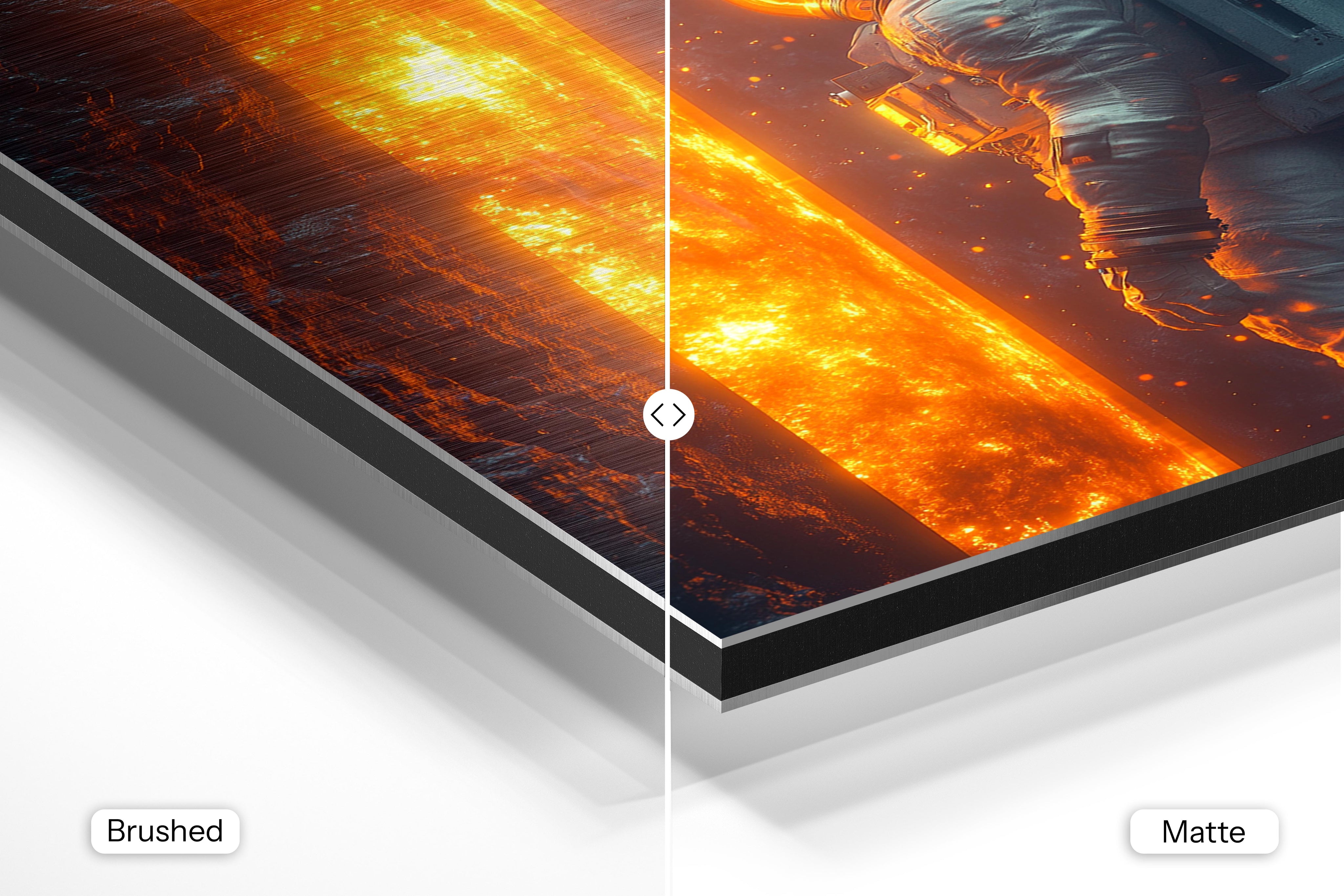 - Brushed Aluminum, on the other hand, features a raw metallic texture with visible brush strokes. Whites and highlights in your image let the silver surface show through, adding a dramatic, shimmering effect. Ideal for black-and-white images, minimalist designs, or abstract art, it creates a bold, industrial vibe with a modern edge.