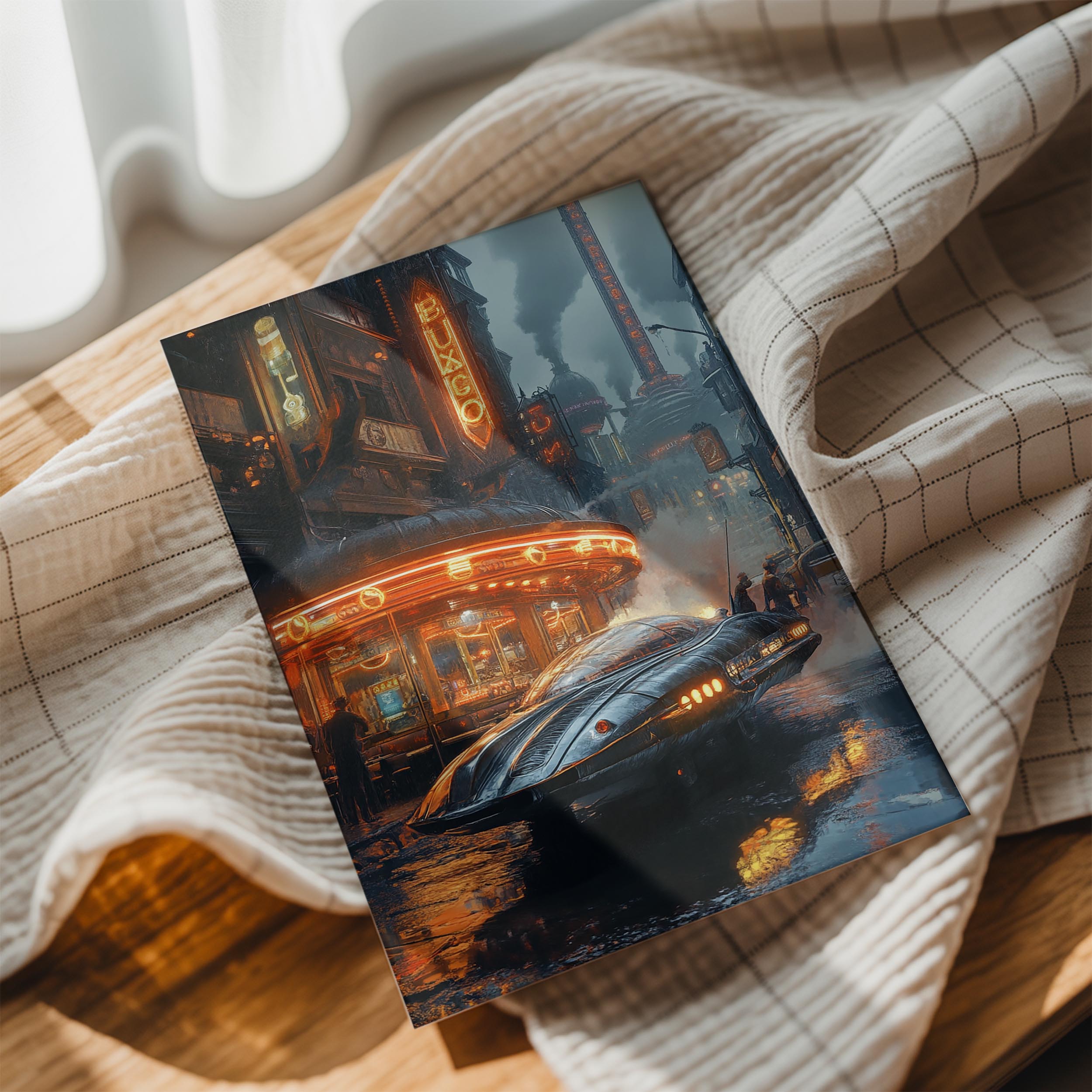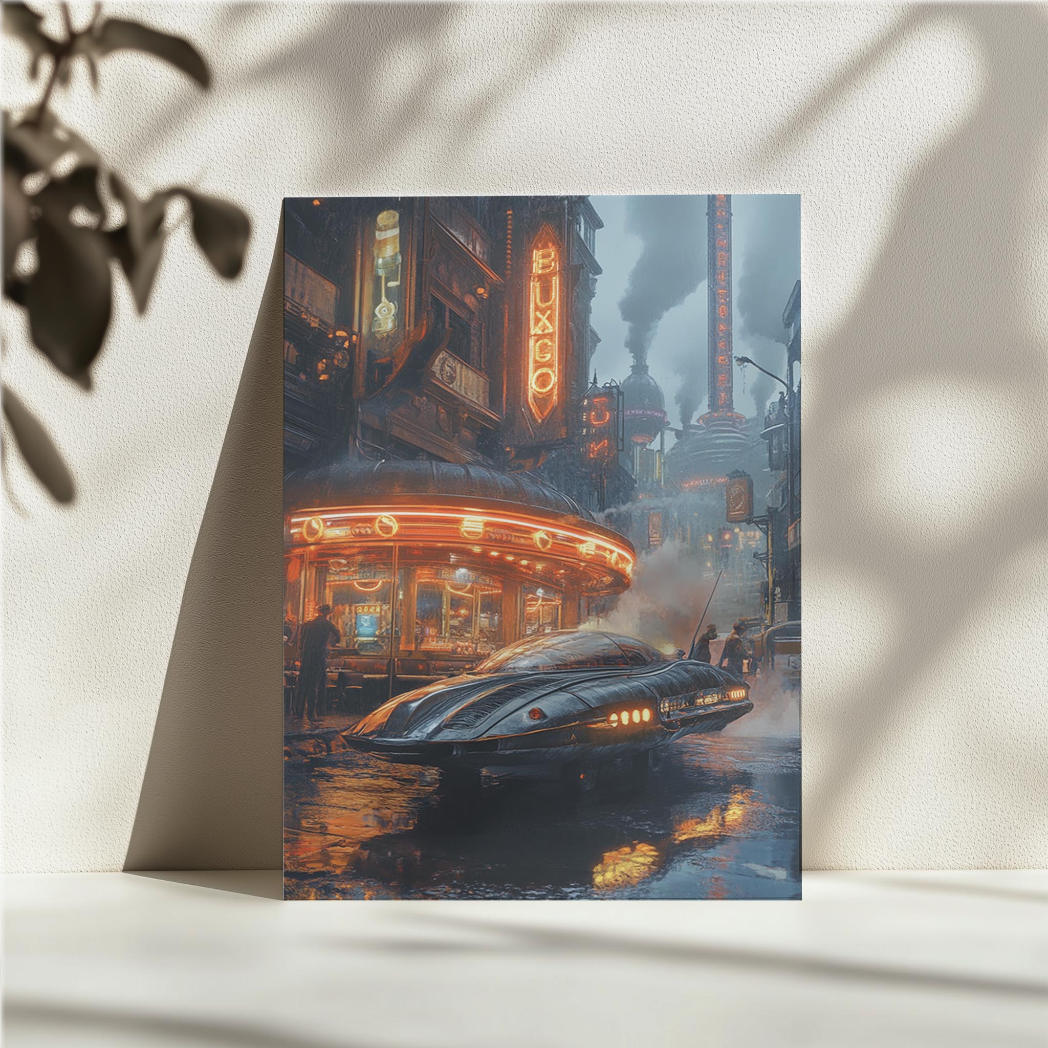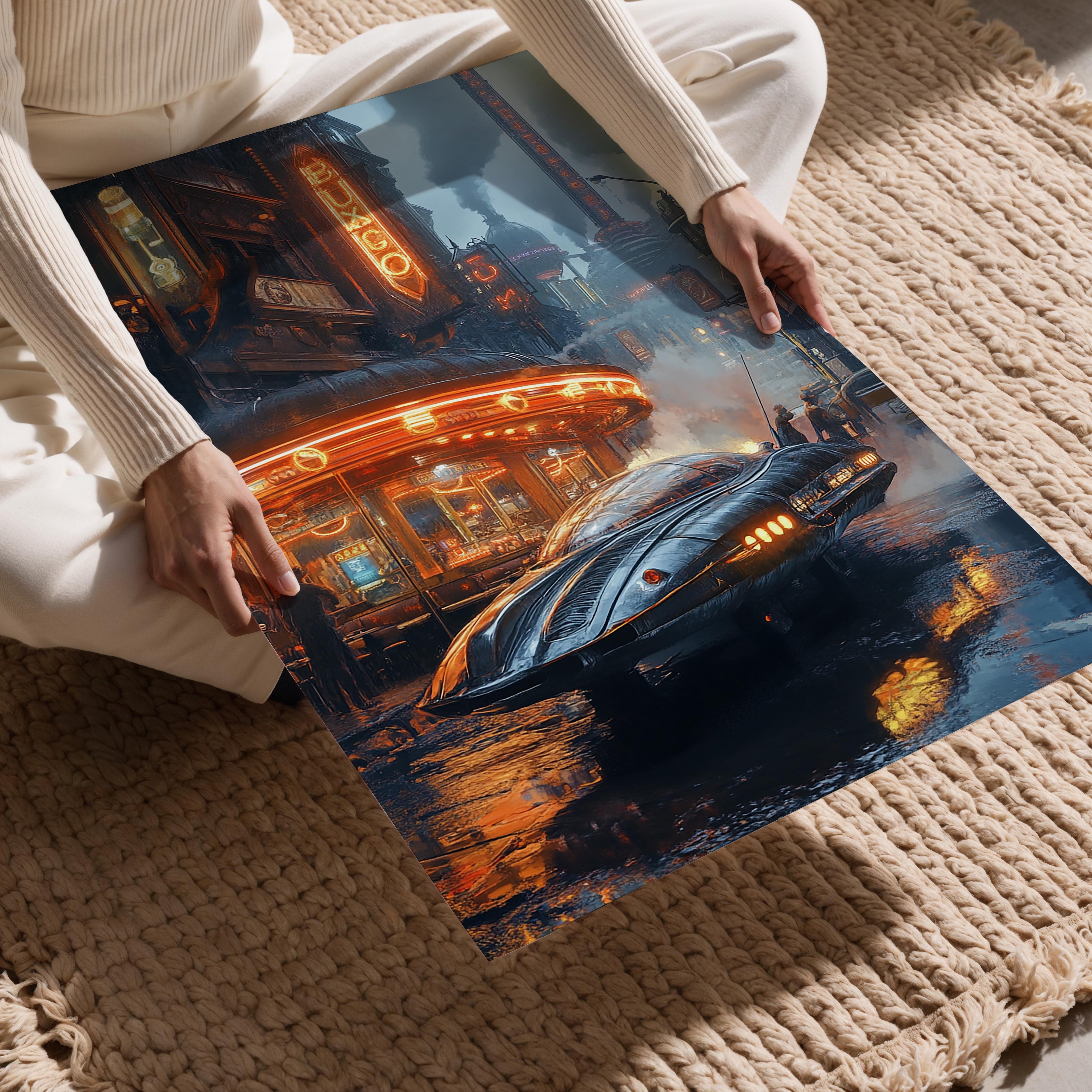 A futuristic hovercar cruising through a bustling, neon-lit cityscape. The design merges innovative engineering with retro-futuristic elements, creating a unique aesthetic that appeals to enthusiasts of advanced transportation concepts. The glowing lights and sleek shape of the vehicle perfectly complement the dynamic urban background, making it an ideal representation of futuristic mobility.