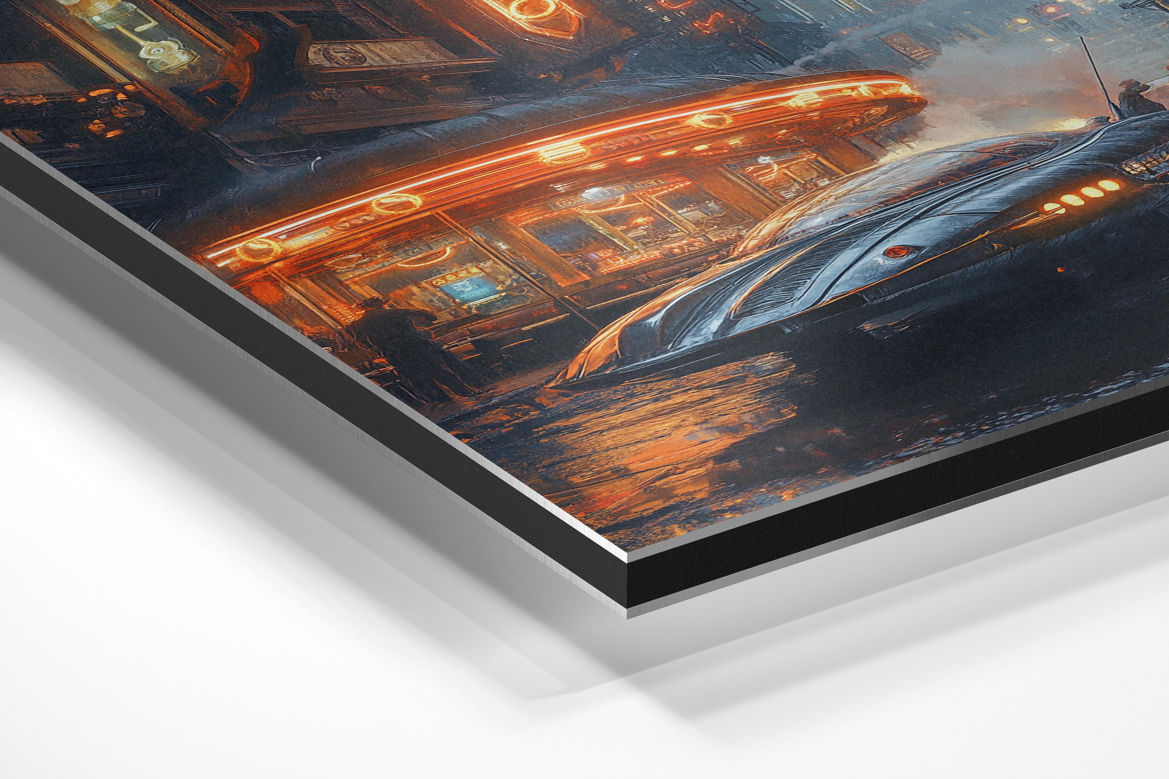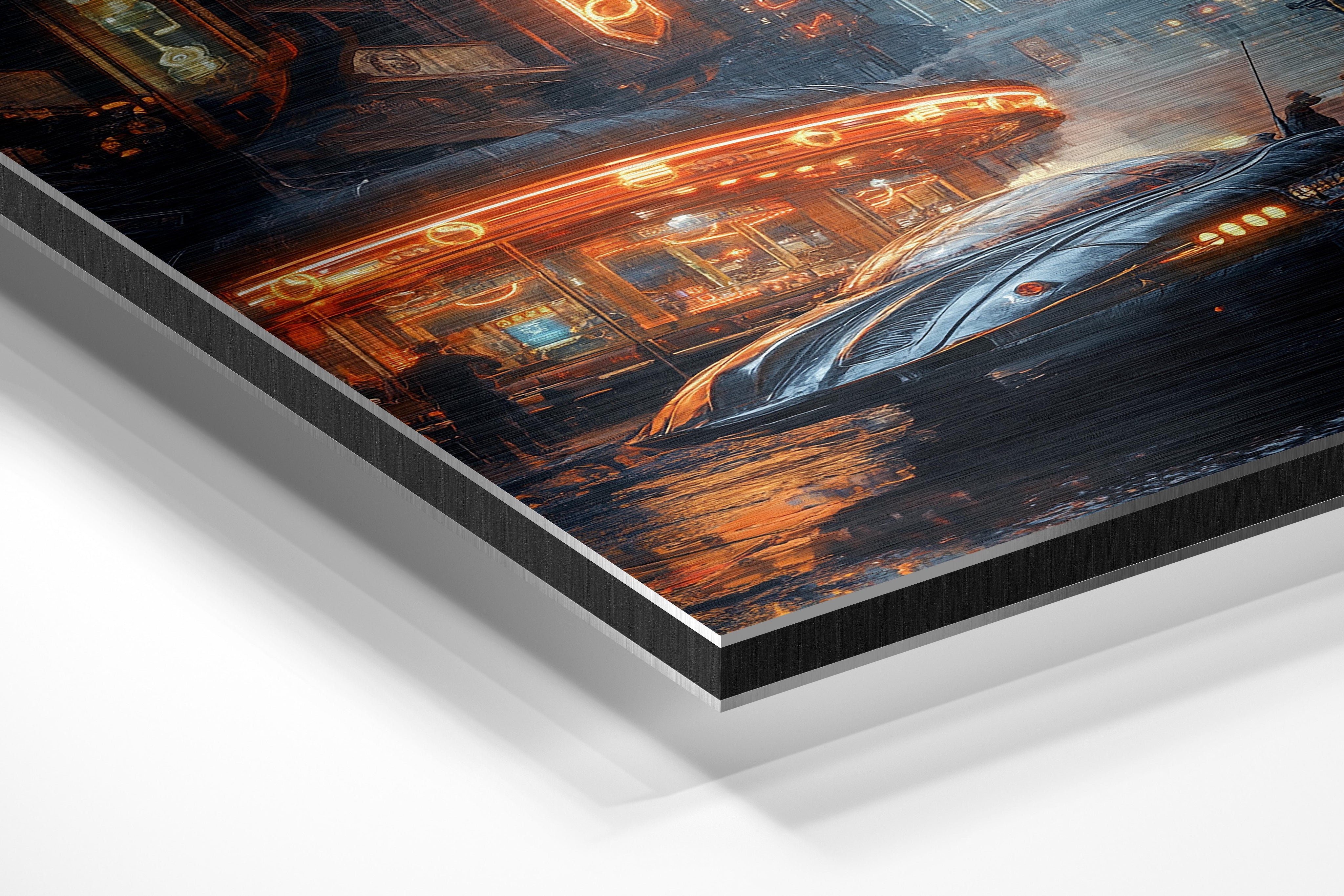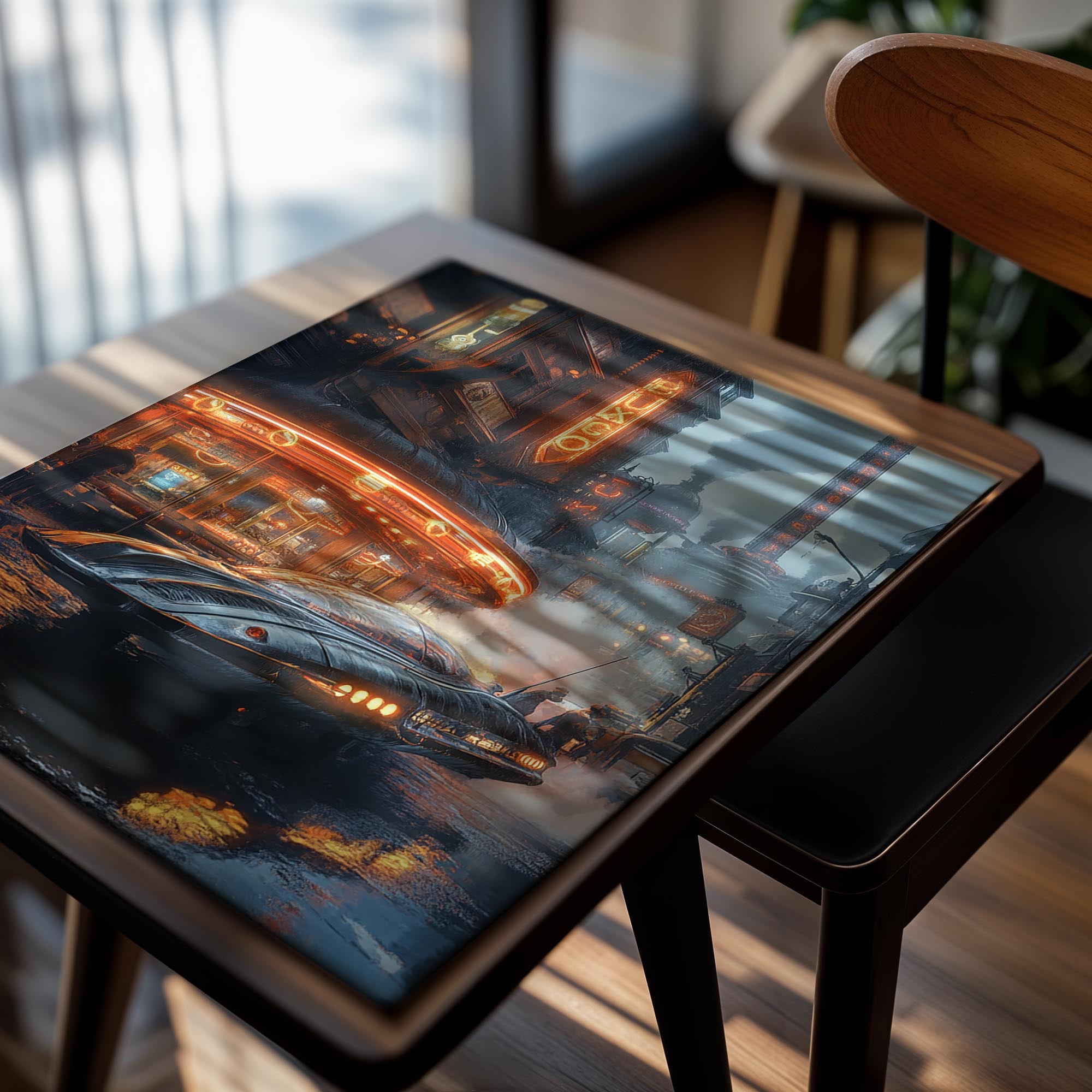 A futuristic hovercar cruising through a bustling, neon-lit cityscape. The design merges innovative engineering with retro-futuristic elements, creating a unique aesthetic that appeals to enthusiasts of advanced transportation concepts. The glowing lights and sleek shape of the vehicle perfectly complement the dynamic urban background, making it an ideal representation of futuristic mobility.