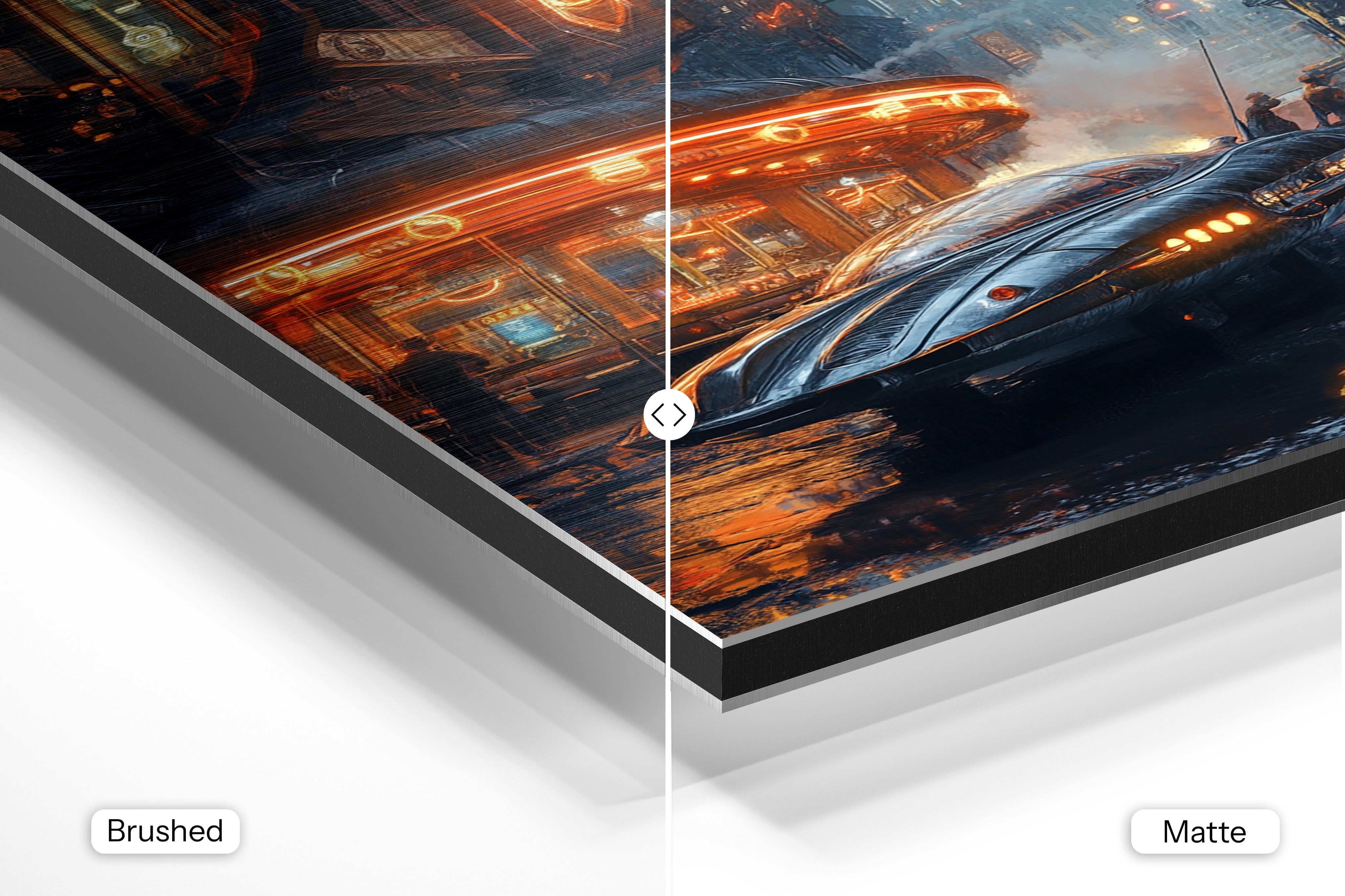 - Brushed Aluminum, on the other hand, features a raw metallic texture with visible brush strokes. Whites and highlights in your image let the silver surface show through, adding a dramatic, shimmering effect. Ideal for black-and-white images, minimalist designs, or abstract art, it creates a bold, industrial vibe with a modern edge.