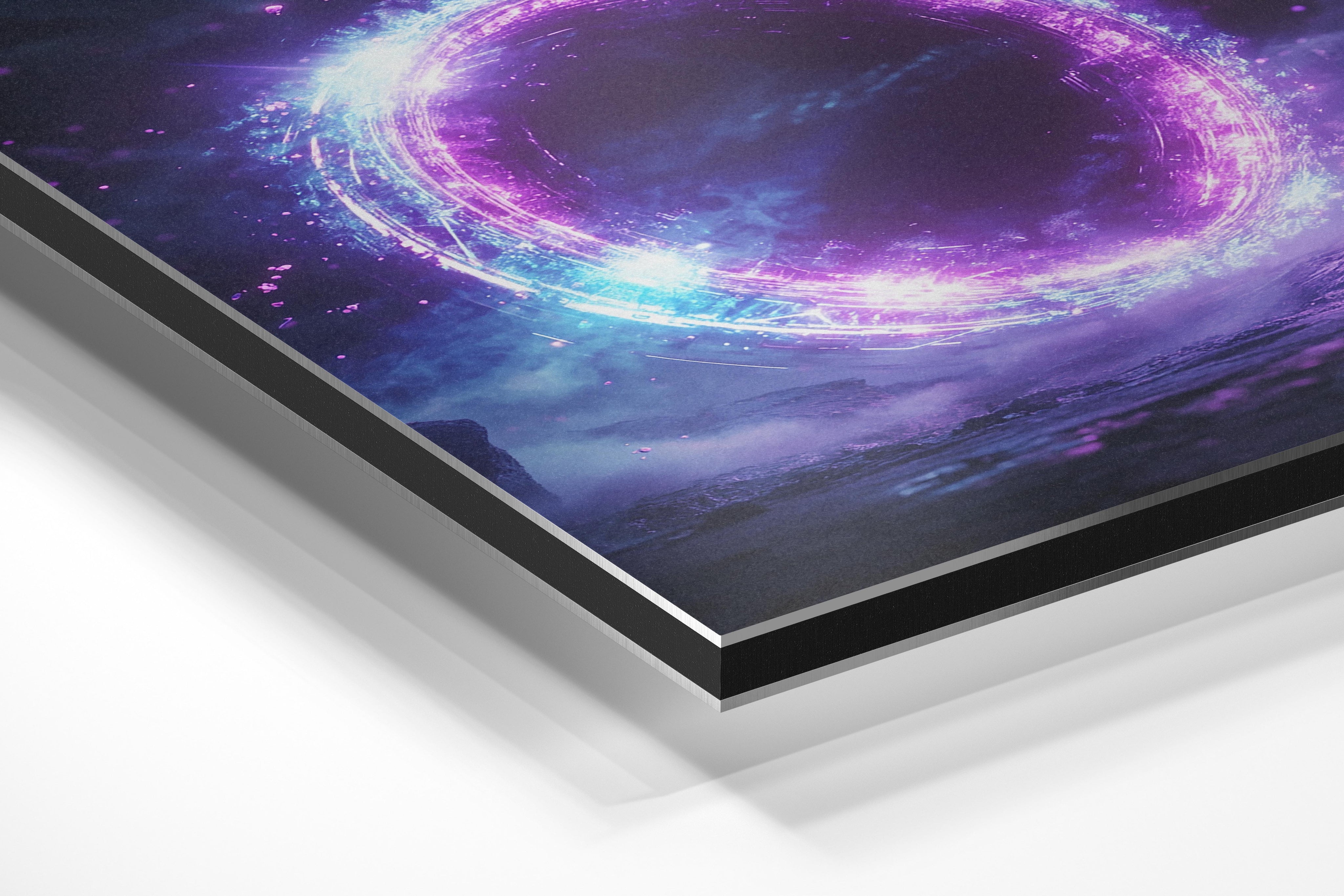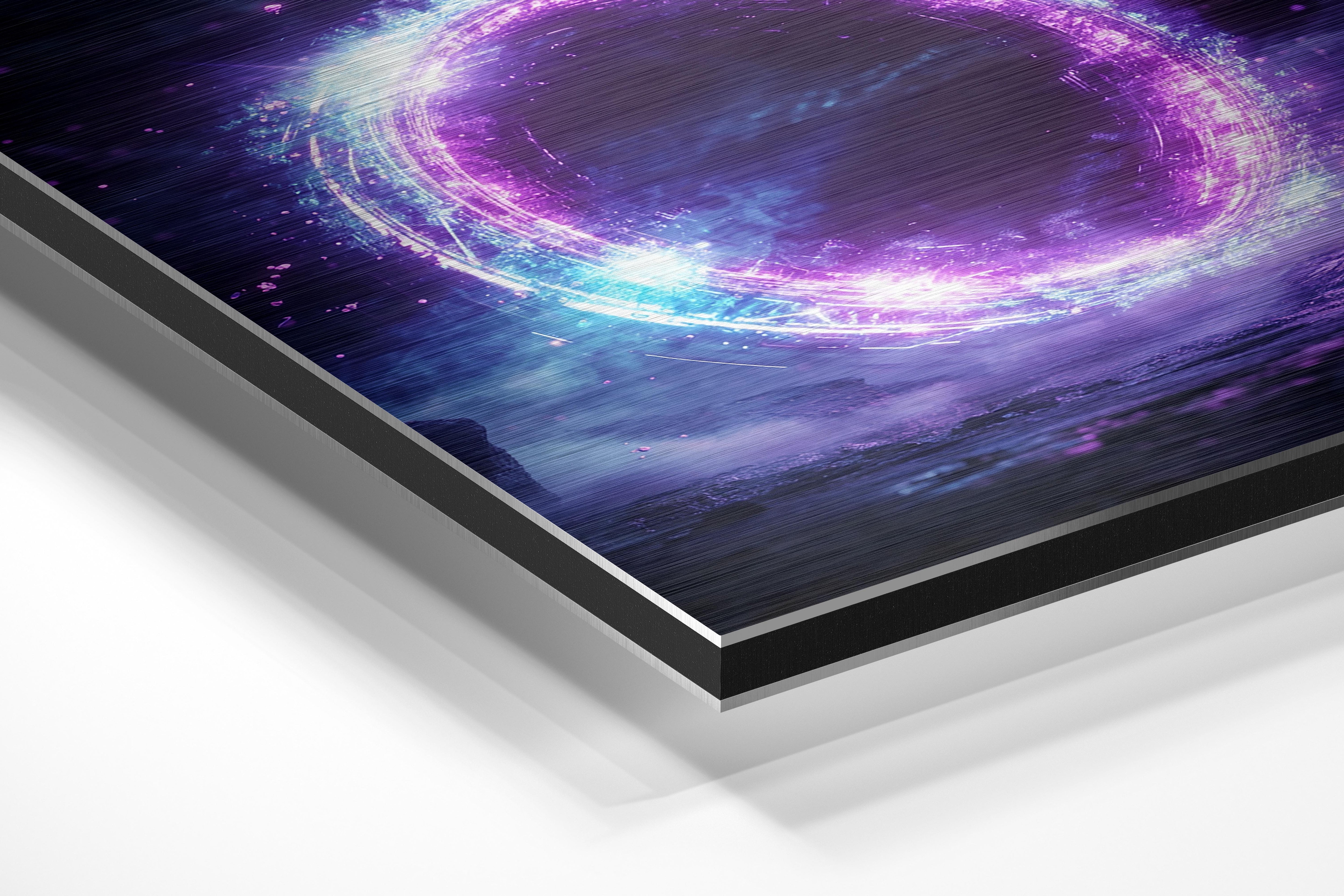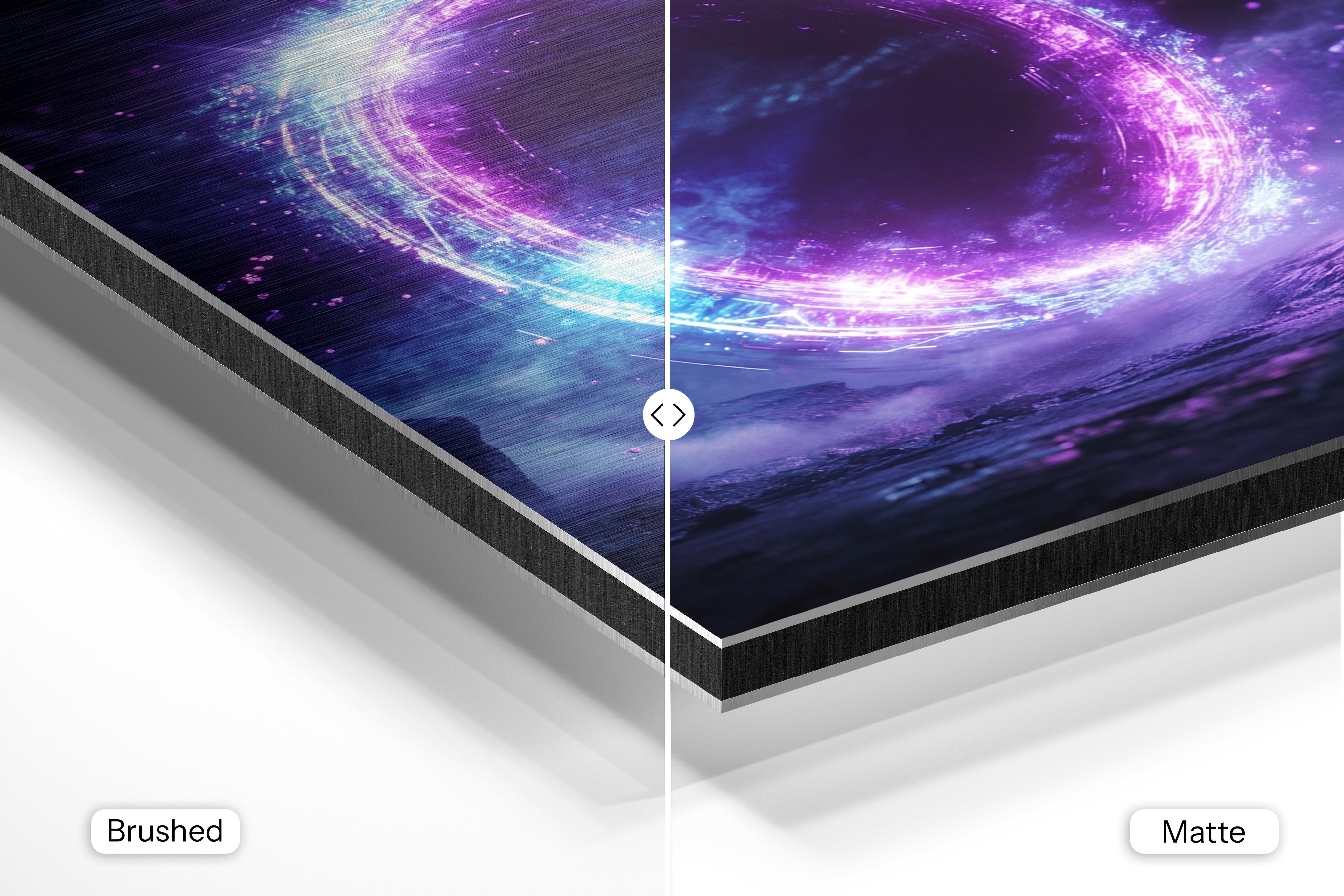 - Brushed Aluminum, on the other hand, features a raw metallic texture with visible brush strokes. Whites and highlights in your image let the silver surface show through, adding a dramatic, shimmering effect. Ideal for black-and-white images, minimalist designs, or abstract art, it creates a bold, industrial vibe with a modern edge.