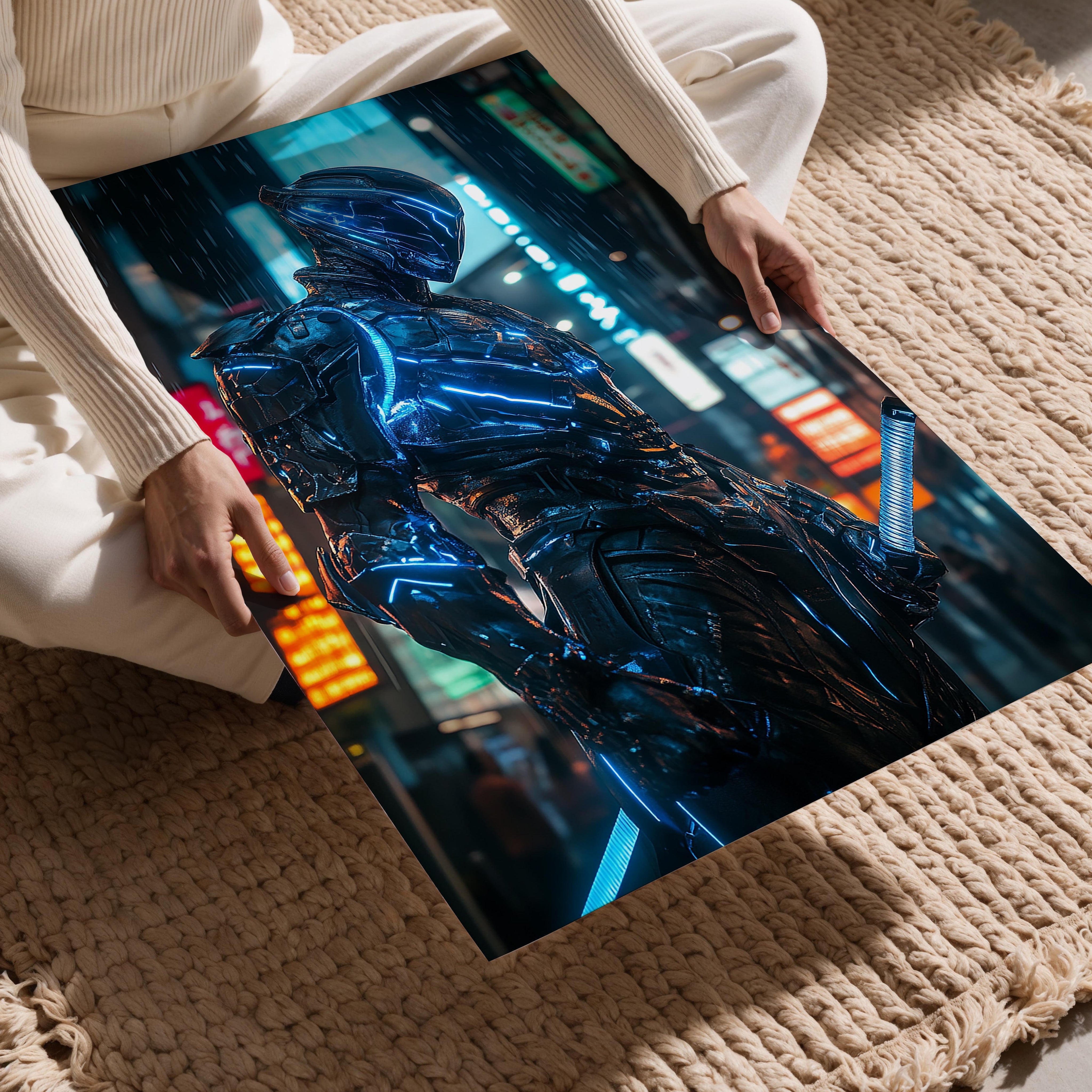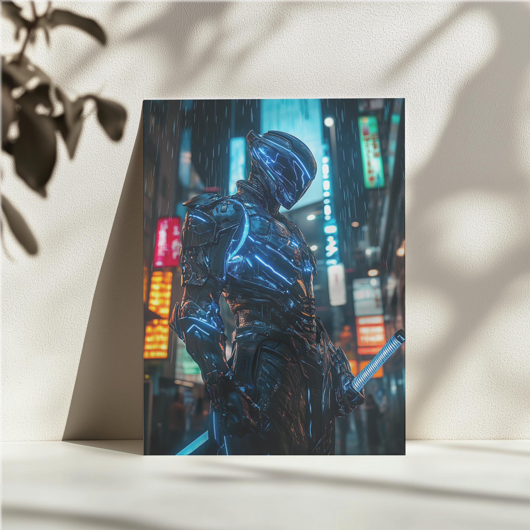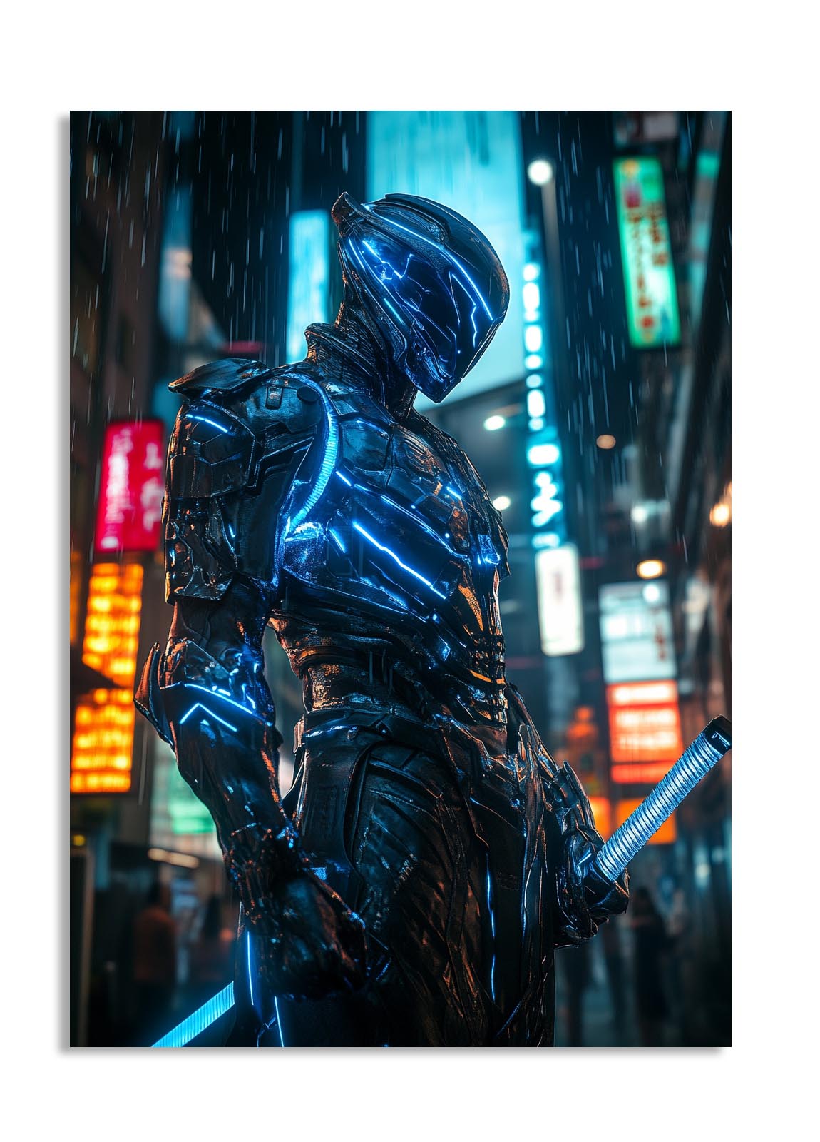 A sleek, cyber-enhanced warrior in an illuminated suit of armor, standing in a rain-soaked metropolis filled with glowing billboards. His katana pulses with electric energy, emphasizing his high-tech prowess. The deep blues and stark neon contrasts evoke a futuristic noir aesthetic, perfect for a gaming room or a high-energy workspace. The figure’s strong, confident stance suggests a guardian of the night, adding an aura of strength and intrigue.