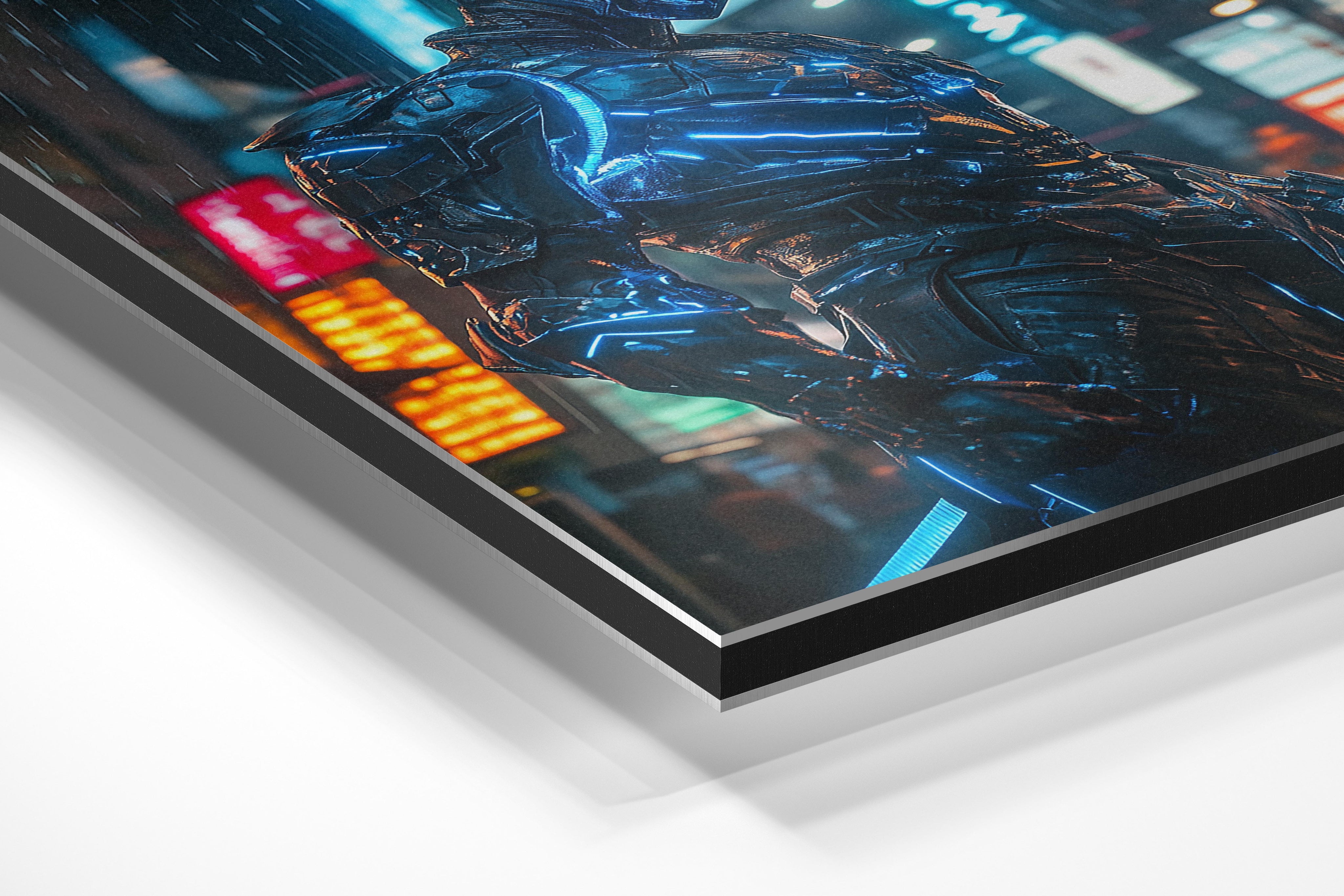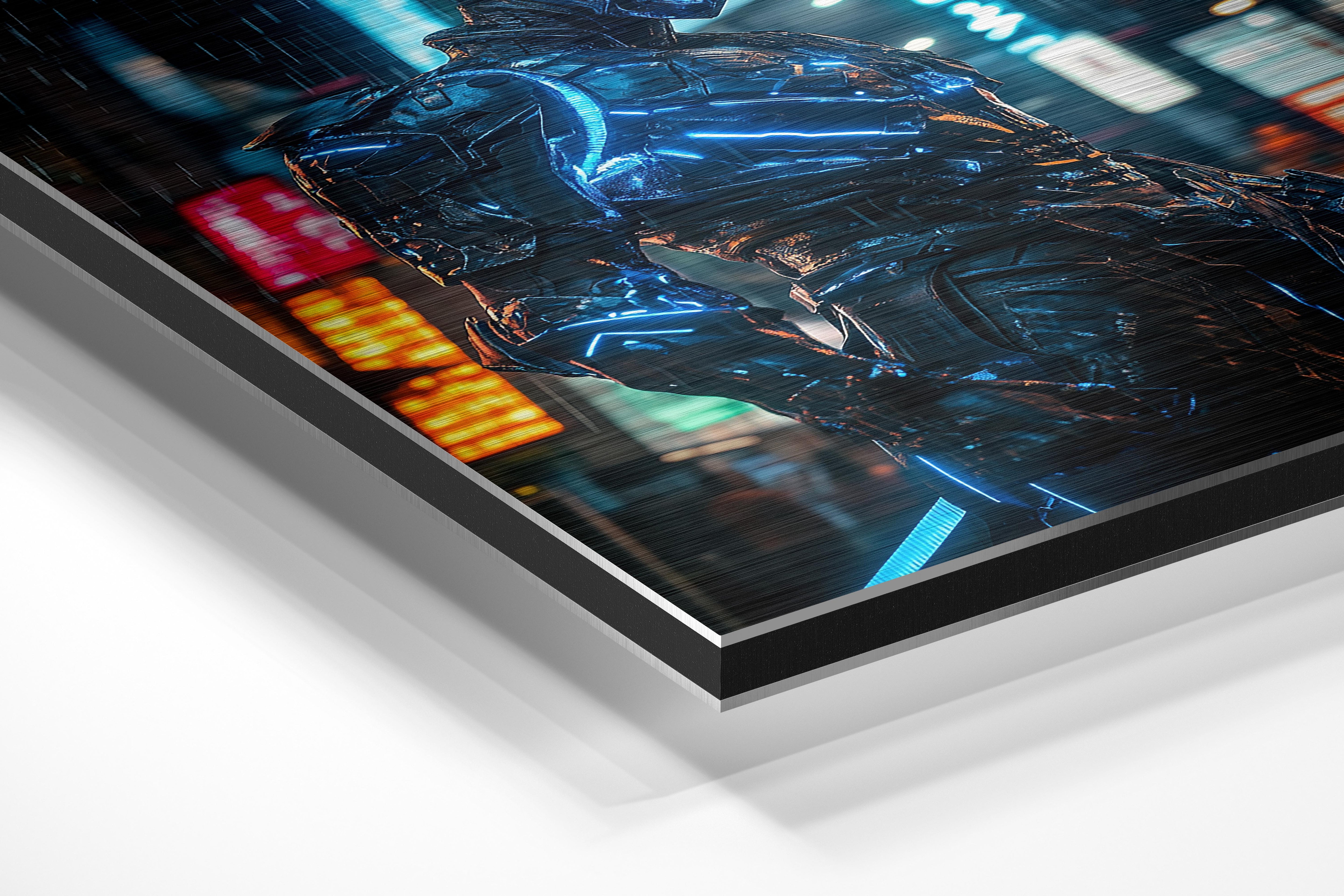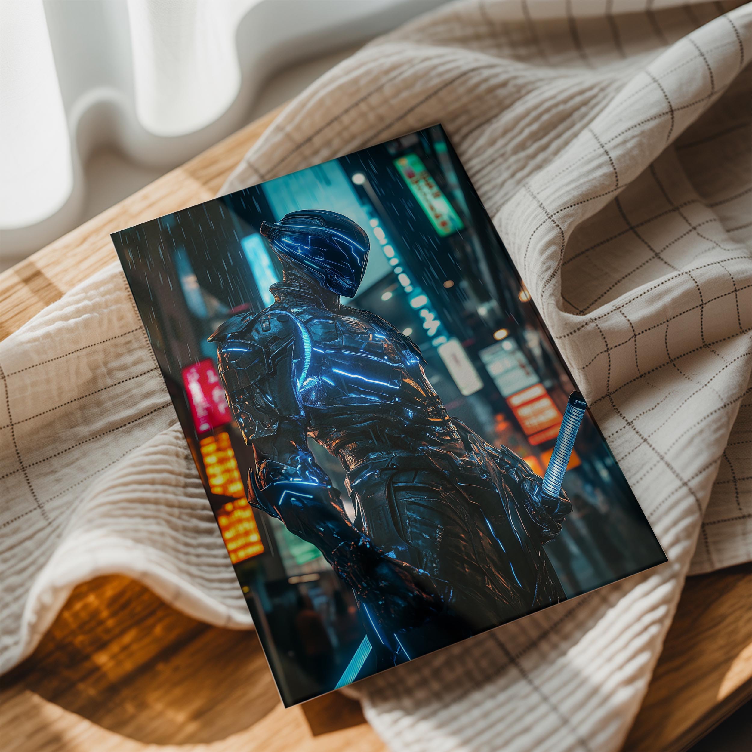 A sleek, cyber-enhanced warrior in an illuminated suit of armor, standing in a rain-soaked metropolis filled with glowing billboards. His katana pulses with electric energy, emphasizing his high-tech prowess. The deep blues and stark neon contrasts evoke a futuristic noir aesthetic, perfect for a gaming room or a high-energy workspace. The figure’s strong, confident stance suggests a guardian of the night, adding an aura of strength and intrigue.
