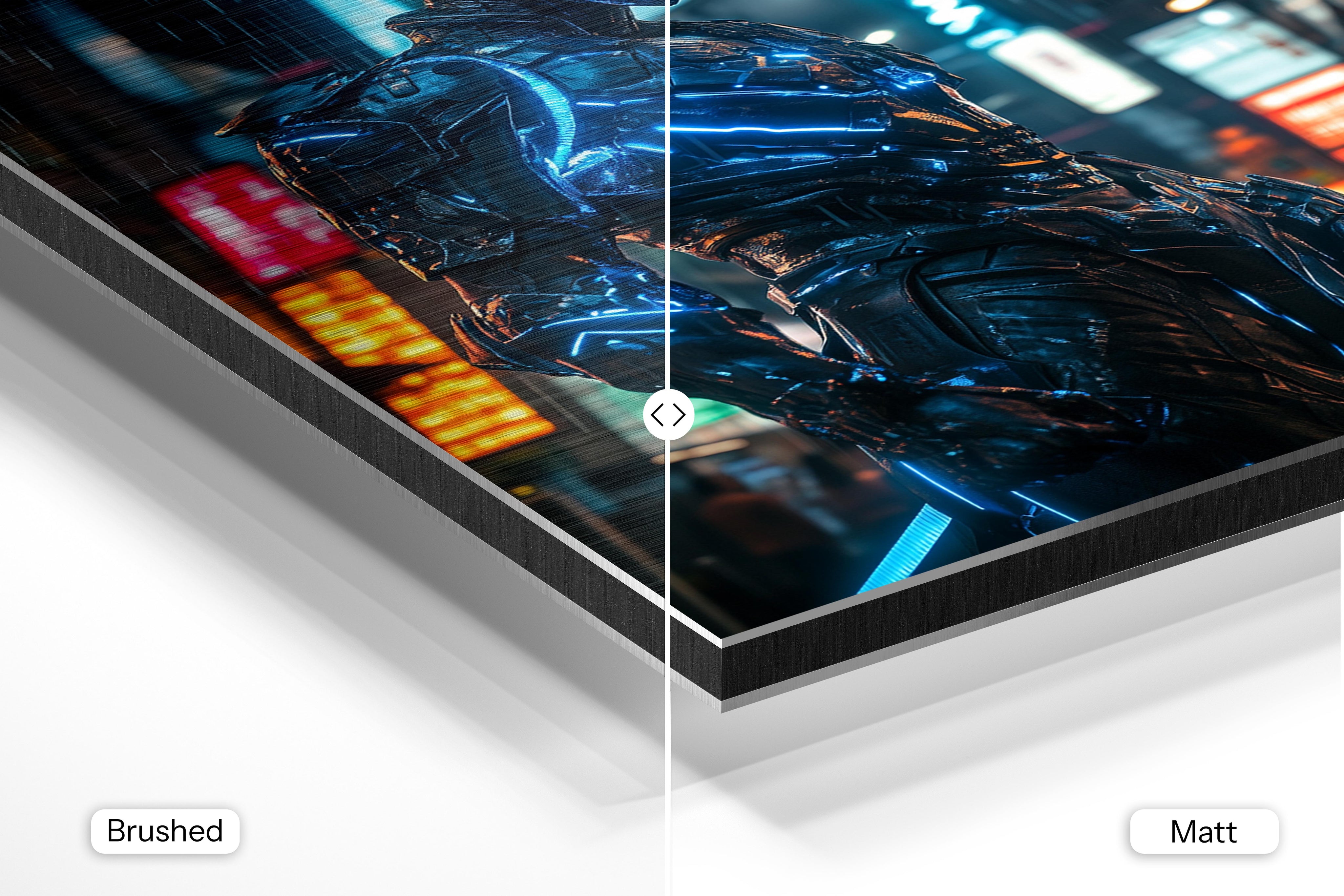 - Brushed Aluminum, on the other hand, features a raw metallic texture with visible brush strokes. Whites and highlights in your image let the silver surface show through, adding a dramatic, shimmering effect. Ideal for black-and-white images, minimalist designs, or abstract art, it creates a bold, industrial vibe with a modern edge.