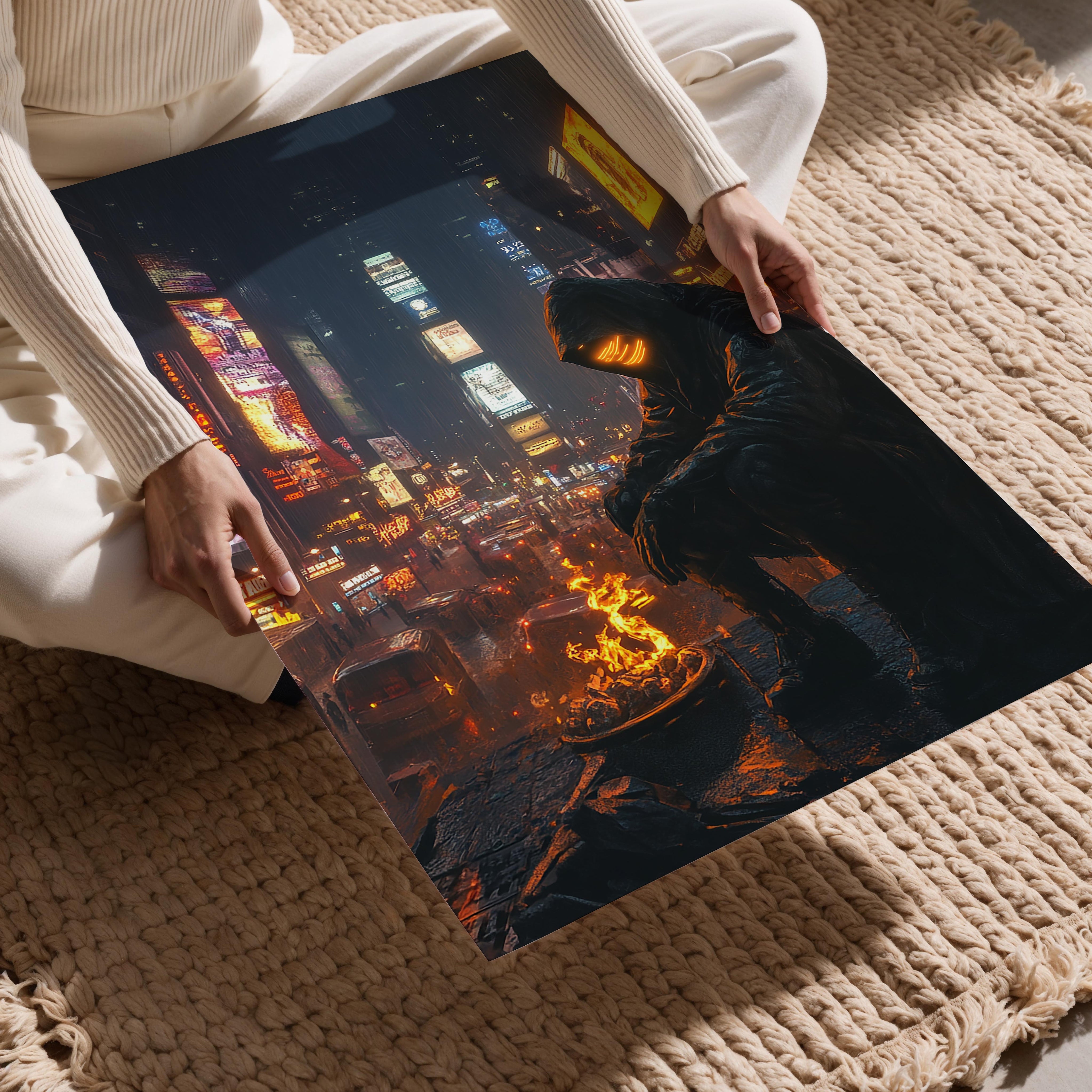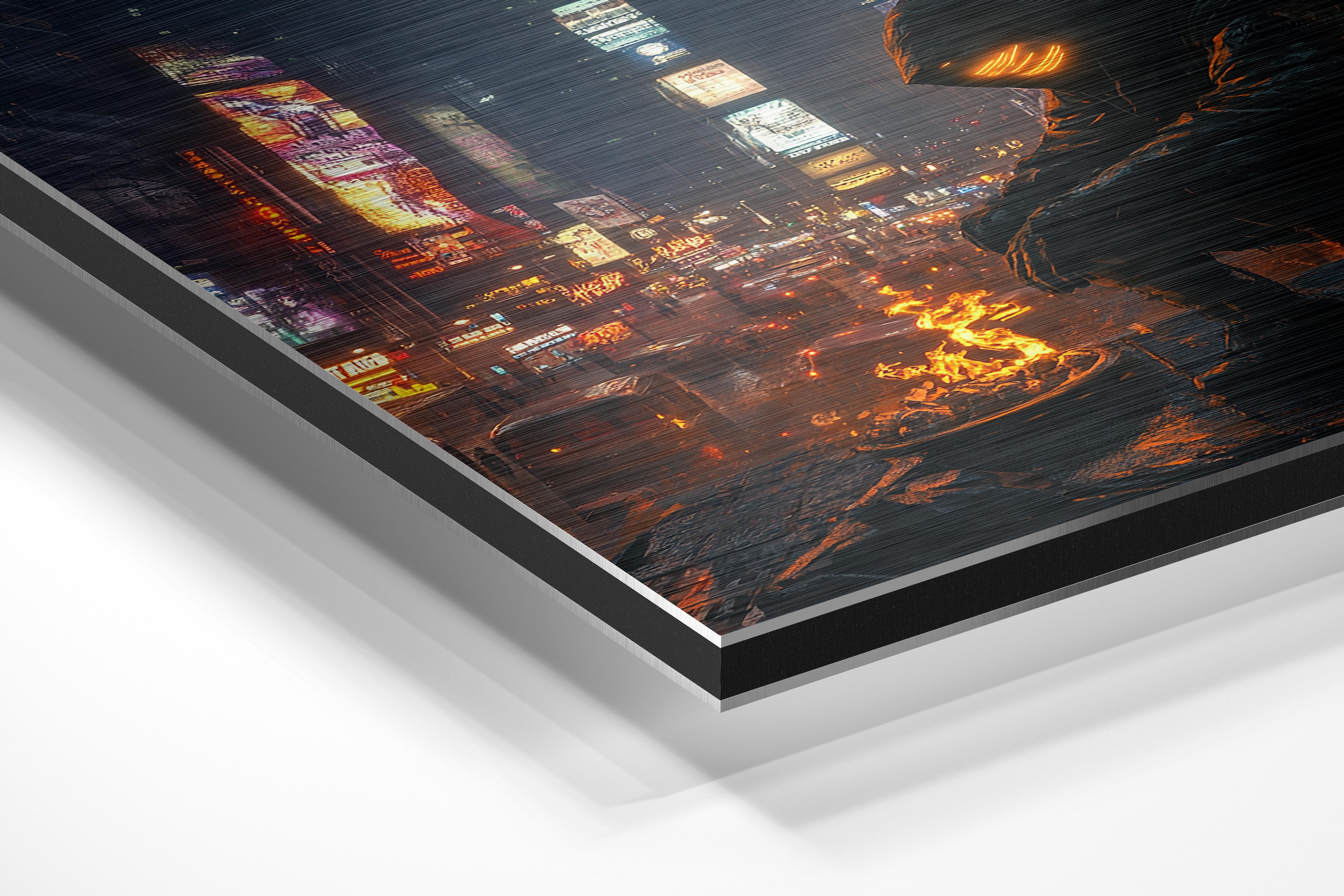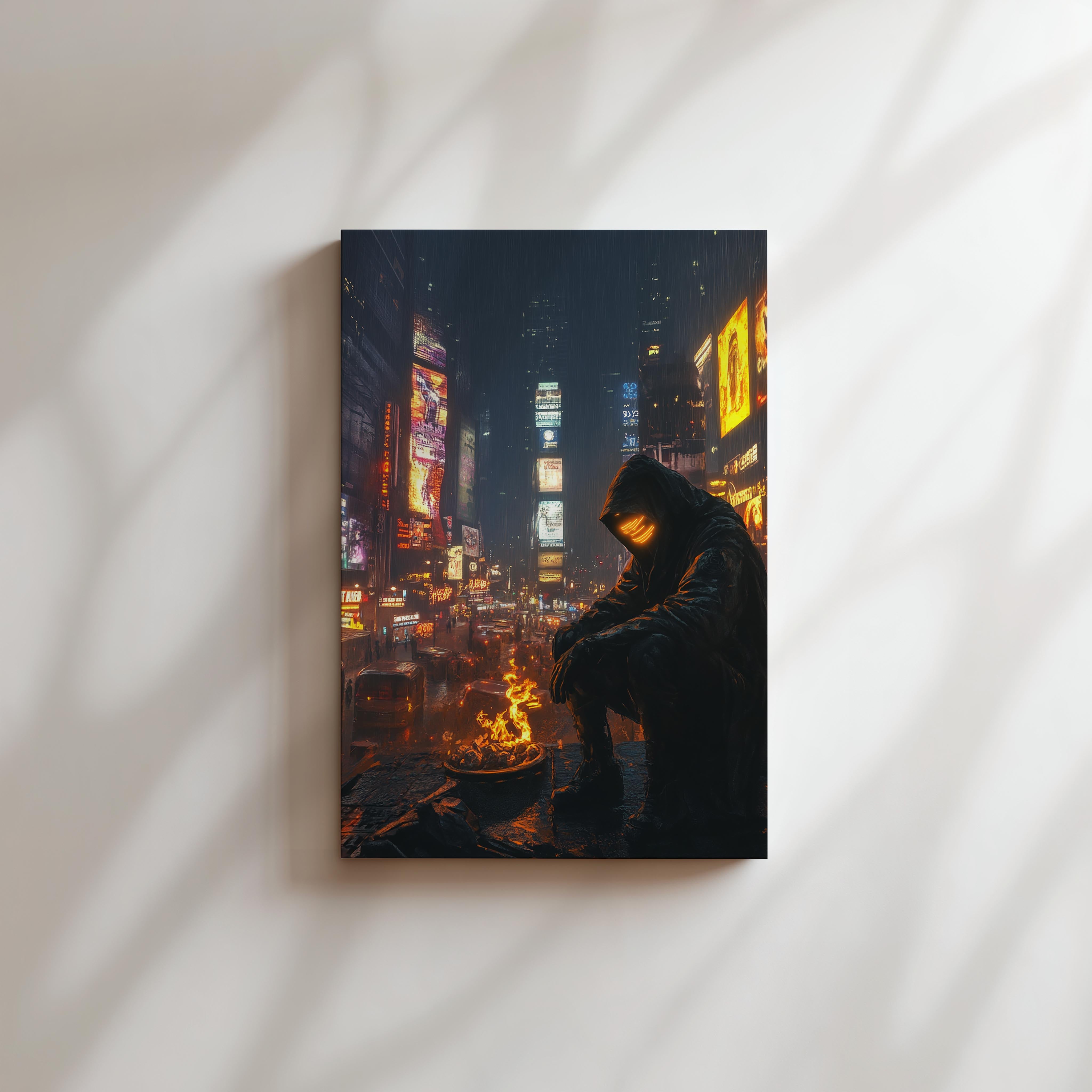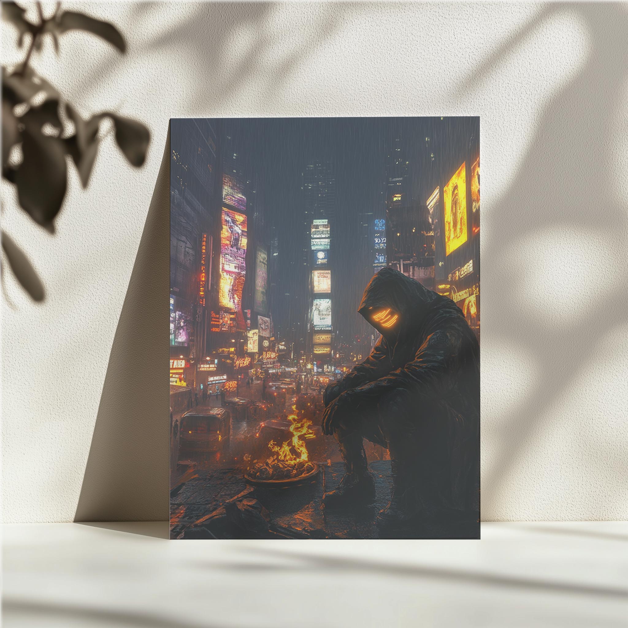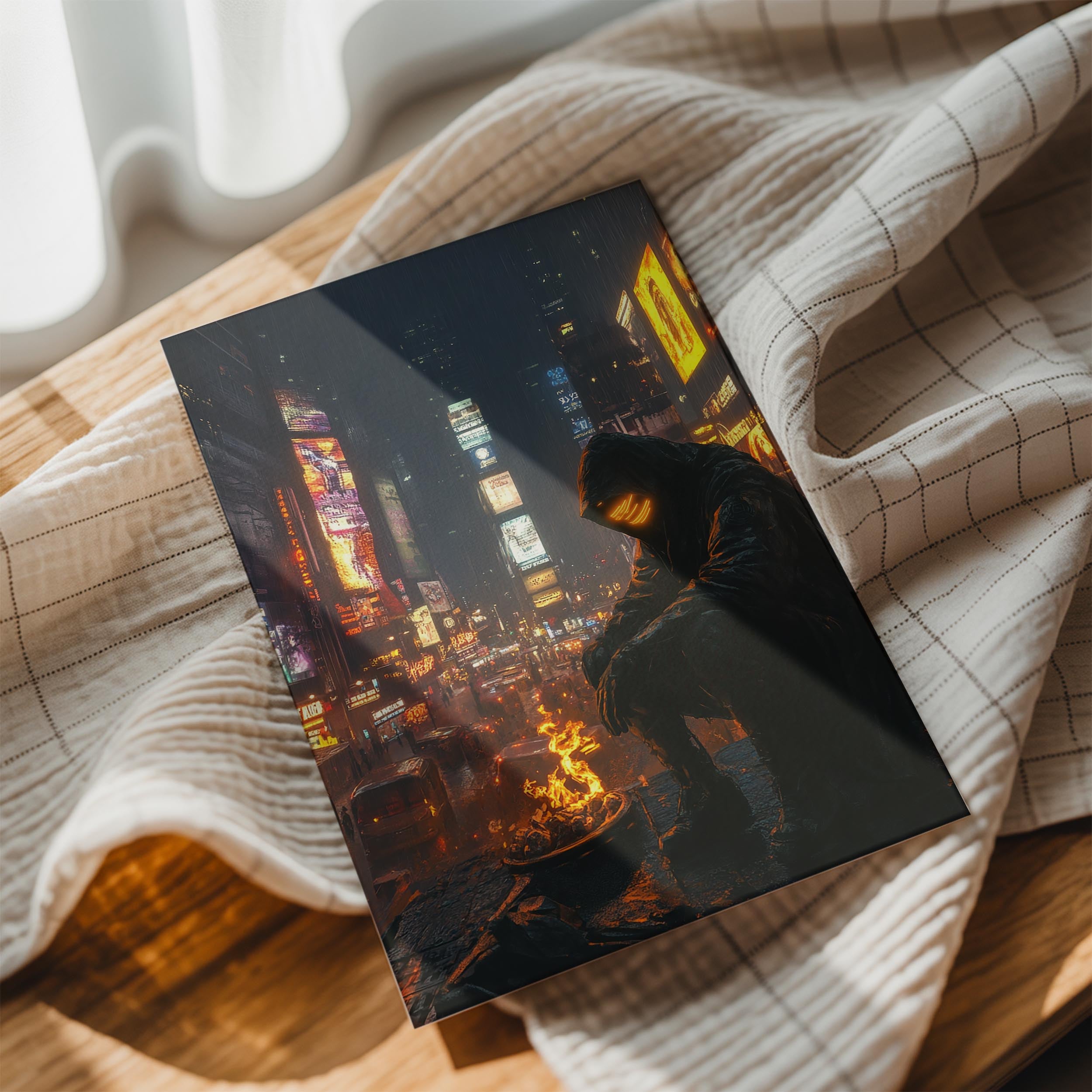 A lone hooded figure crouches atop a high-rise in a dystopian city, illuminated by neon lights and the warm glow of a street fire. The rain and dark atmosphere add a sense of solitude and mystery, making this a perfect visual for those drawn to cyberpunk themes. The striking balance between the bright cityscape and the hidden figure creates a compelling composition, making this piece an eye-catching addition to a modern, edgy interior space.