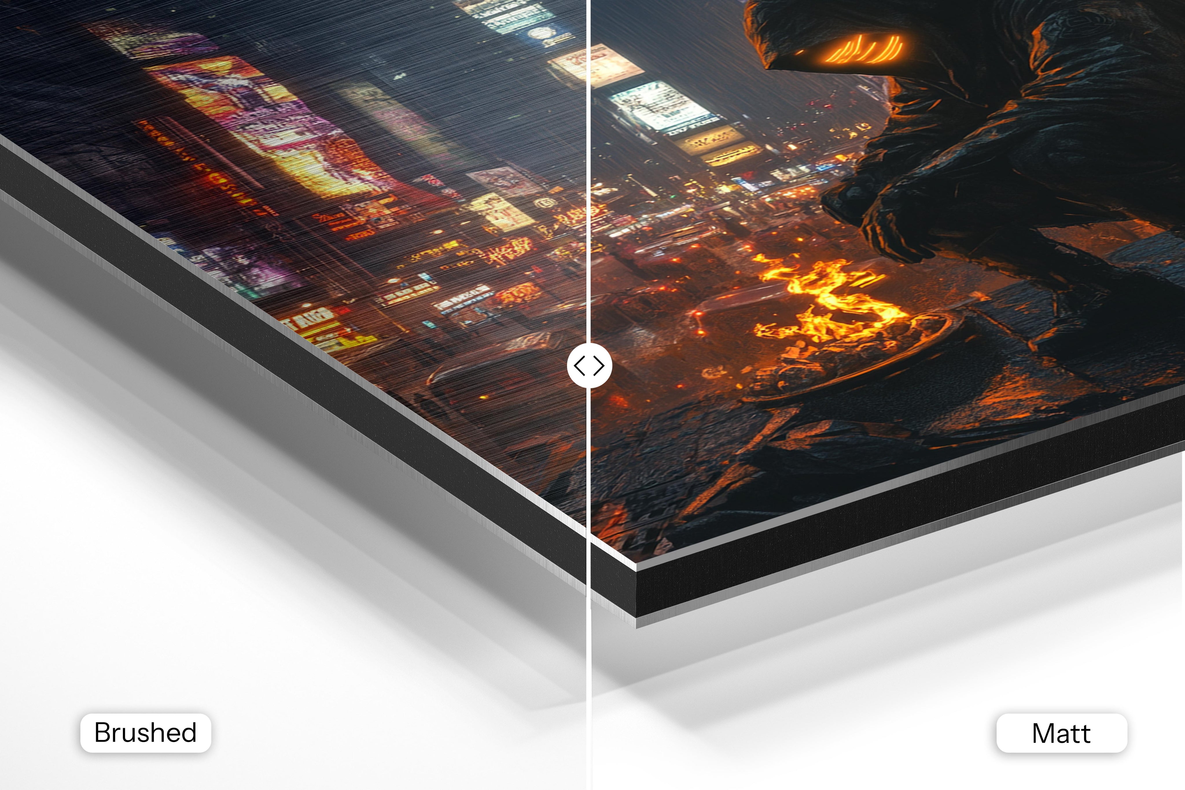 - Brushed Aluminum, on the other hand, features a raw metallic texture with visible brush strokes. Whites and highlights in your image let the silver surface show through, adding a dramatic, shimmering effect. Ideal for black-and-white images, minimalist designs, or abstract art, it creates a bold, industrial vibe with a modern edge.