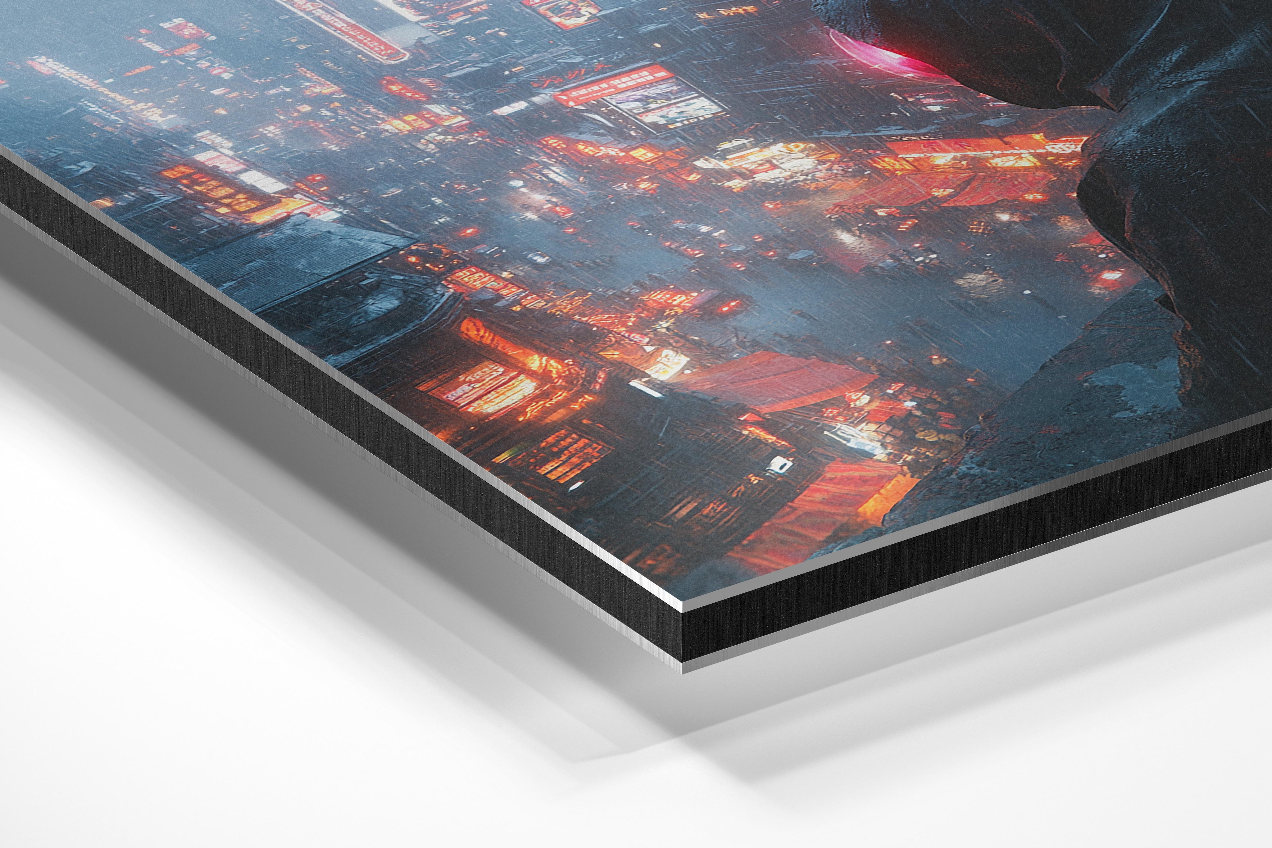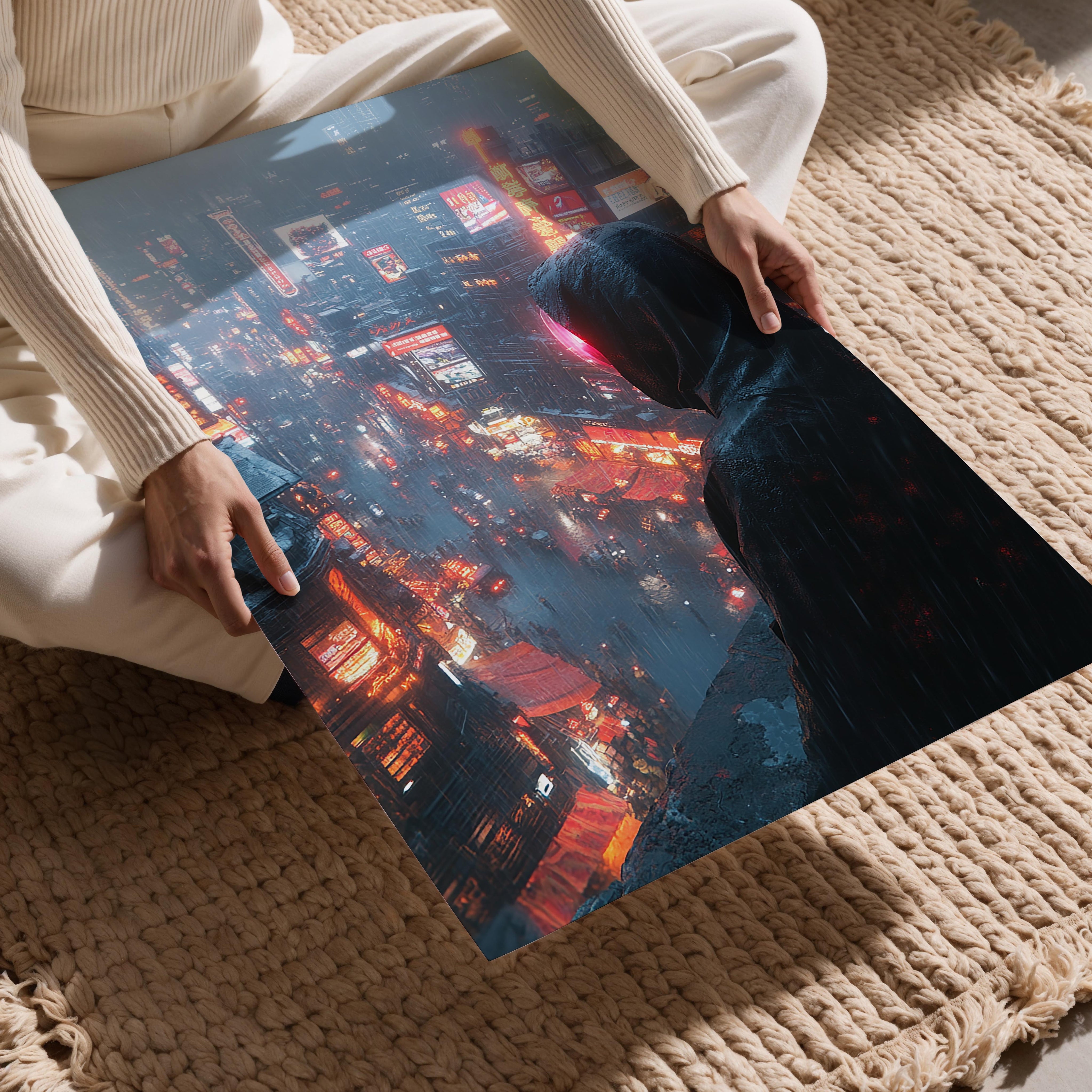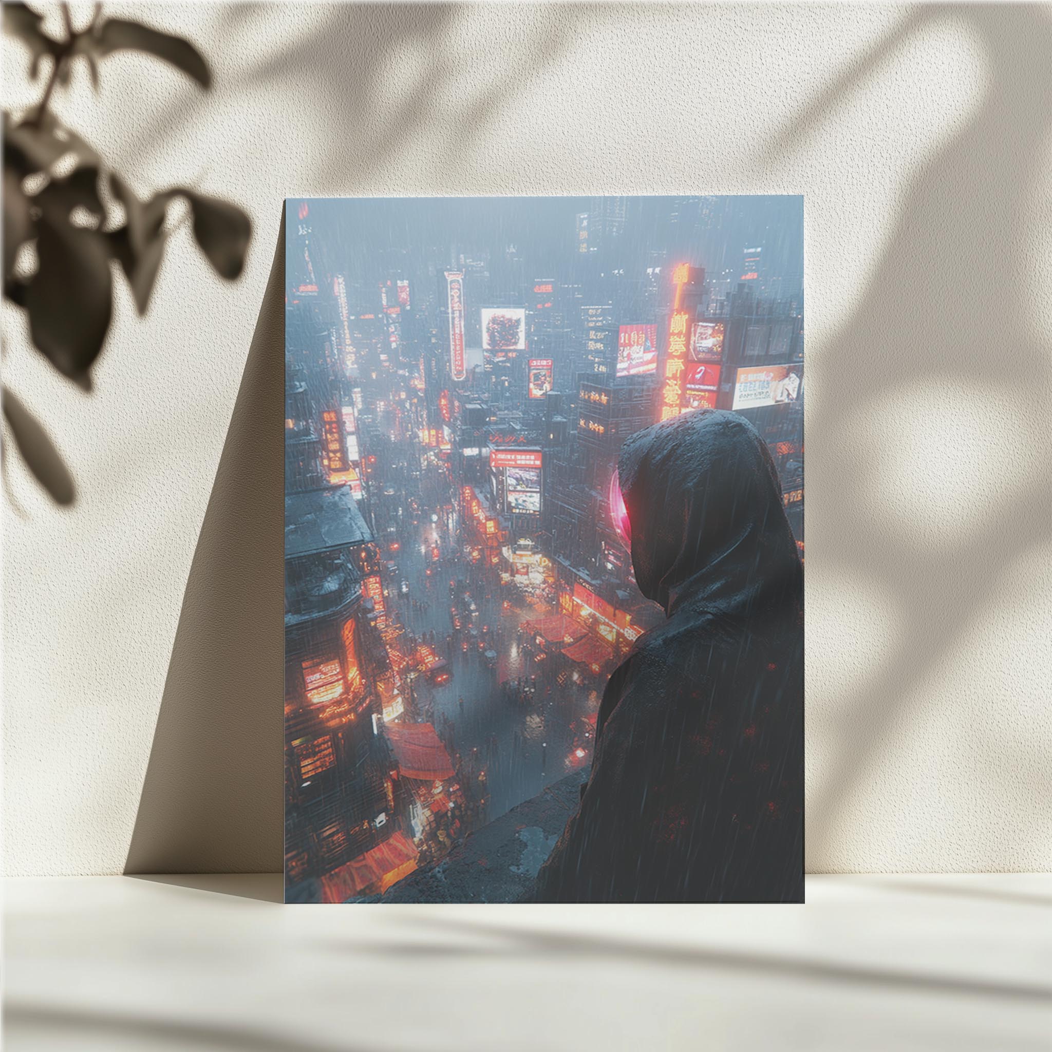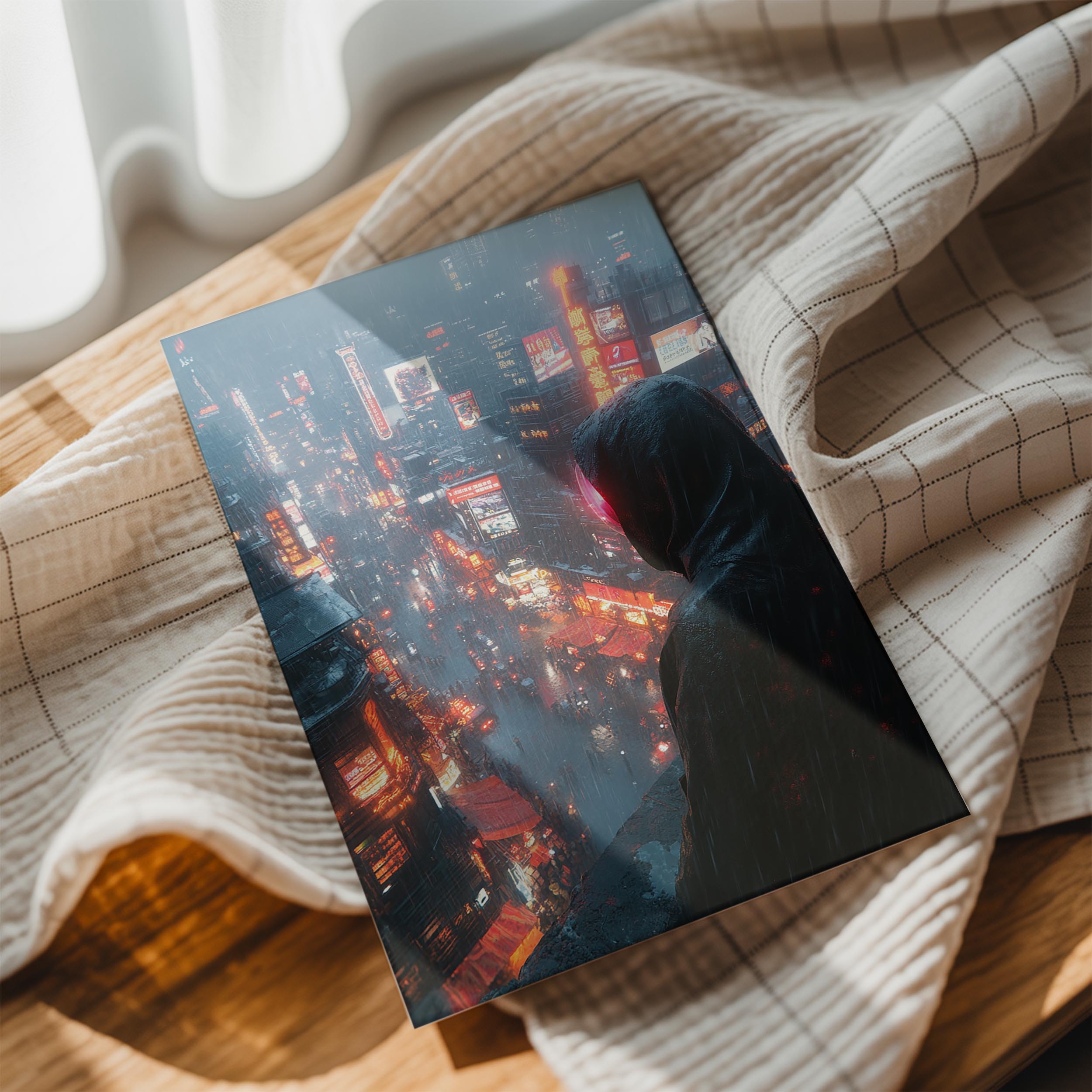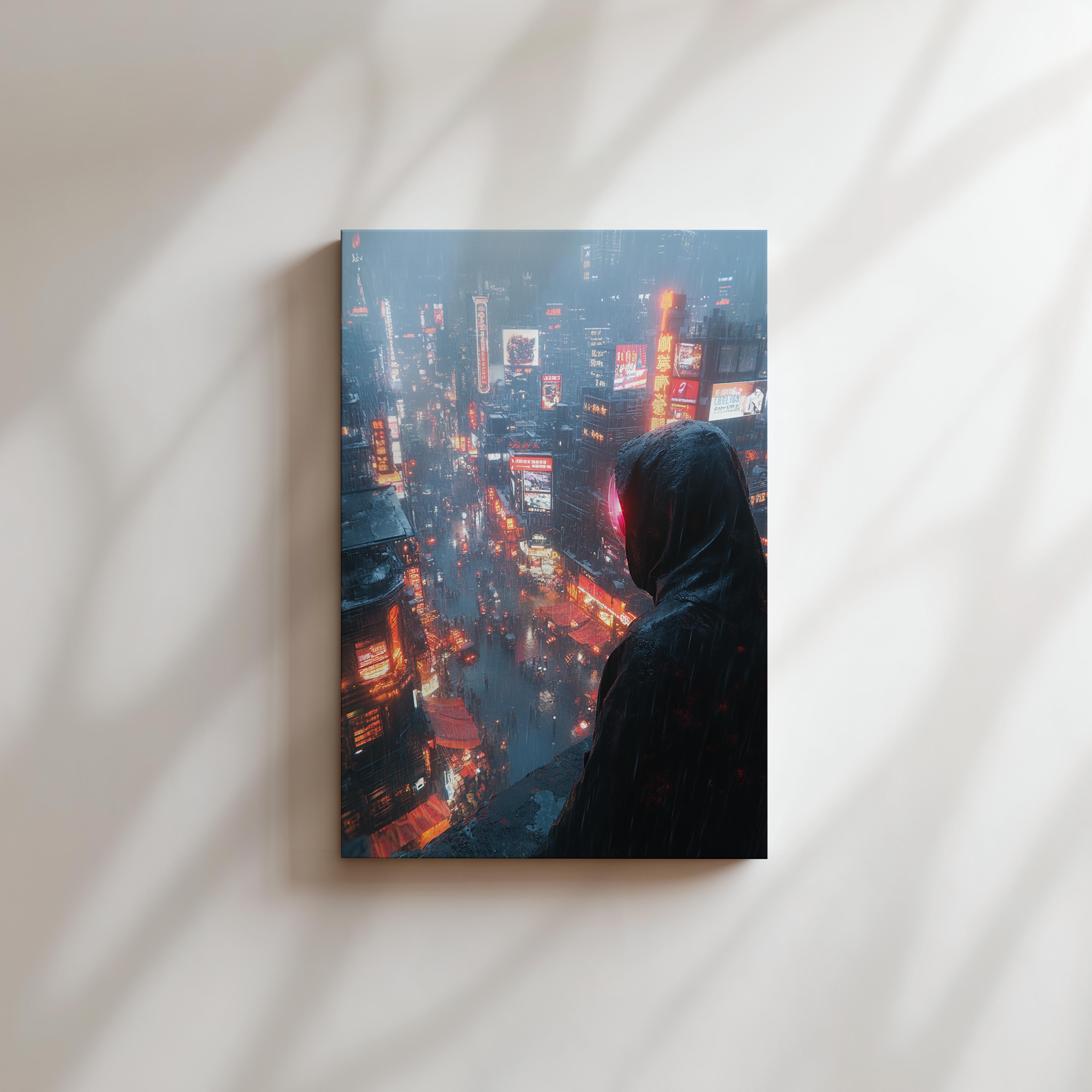 A cyberpunk city stretches below as a hooded figure watches from above, their glowing red visor reflecting the neon lights. The rainfall enhances the noir aesthetic, creating a sense of mystery and tension. This image conveys the feeling of being both a predator and an observer, perfect for a high-tech workspace or an urban-themed art collection. Its dramatic composition and cinematic lighting make it a standout piece that captures the spirit of a futuristic metropolis.