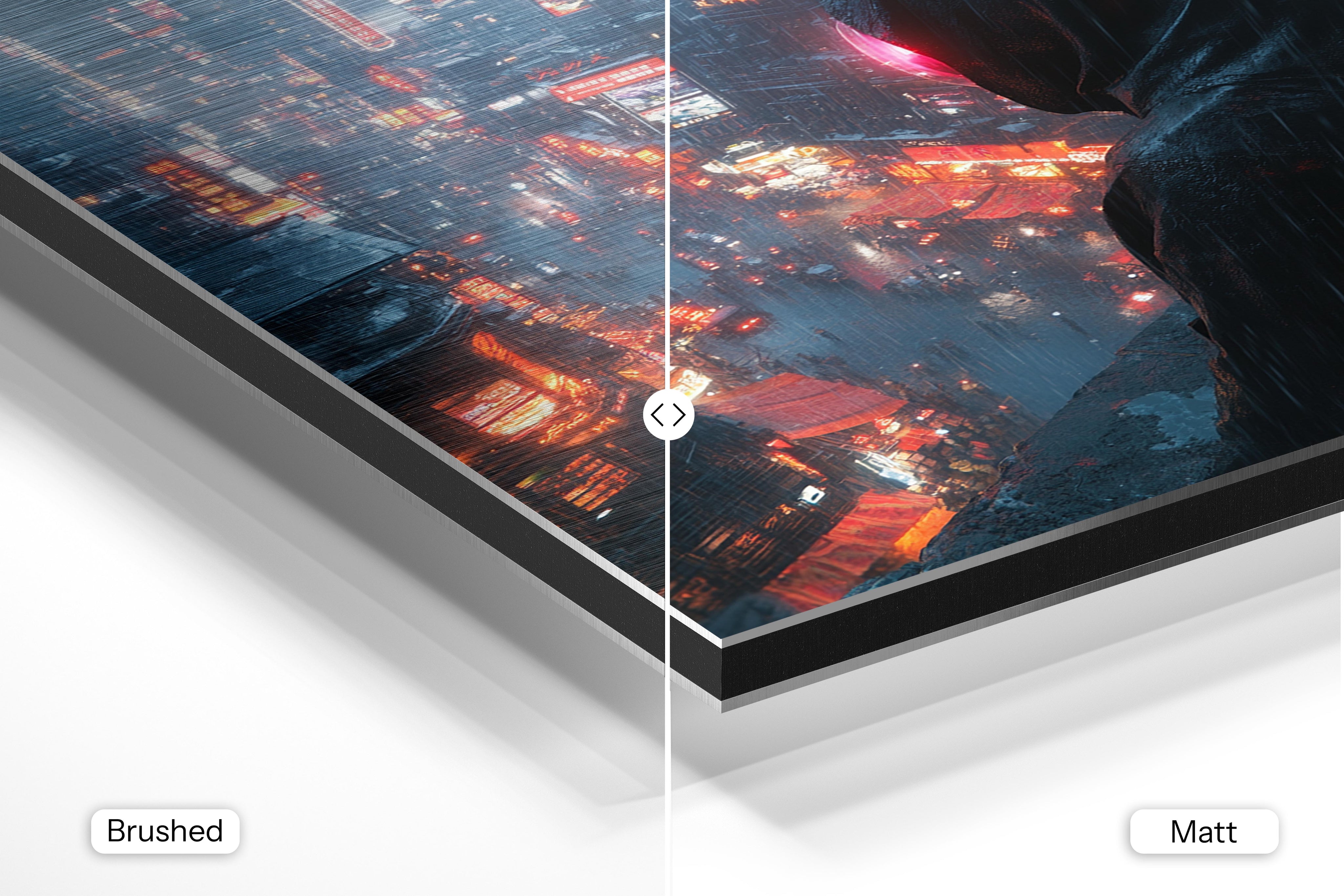 - Brushed Aluminum, on the other hand, features a raw metallic texture with visible brush strokes. Whites and highlights in your image let the silver surface show through, adding a dramatic, shimmering effect. Ideal for black-and-white images, minimalist designs, or abstract art, it creates a bold, industrial vibe with a modern edge.