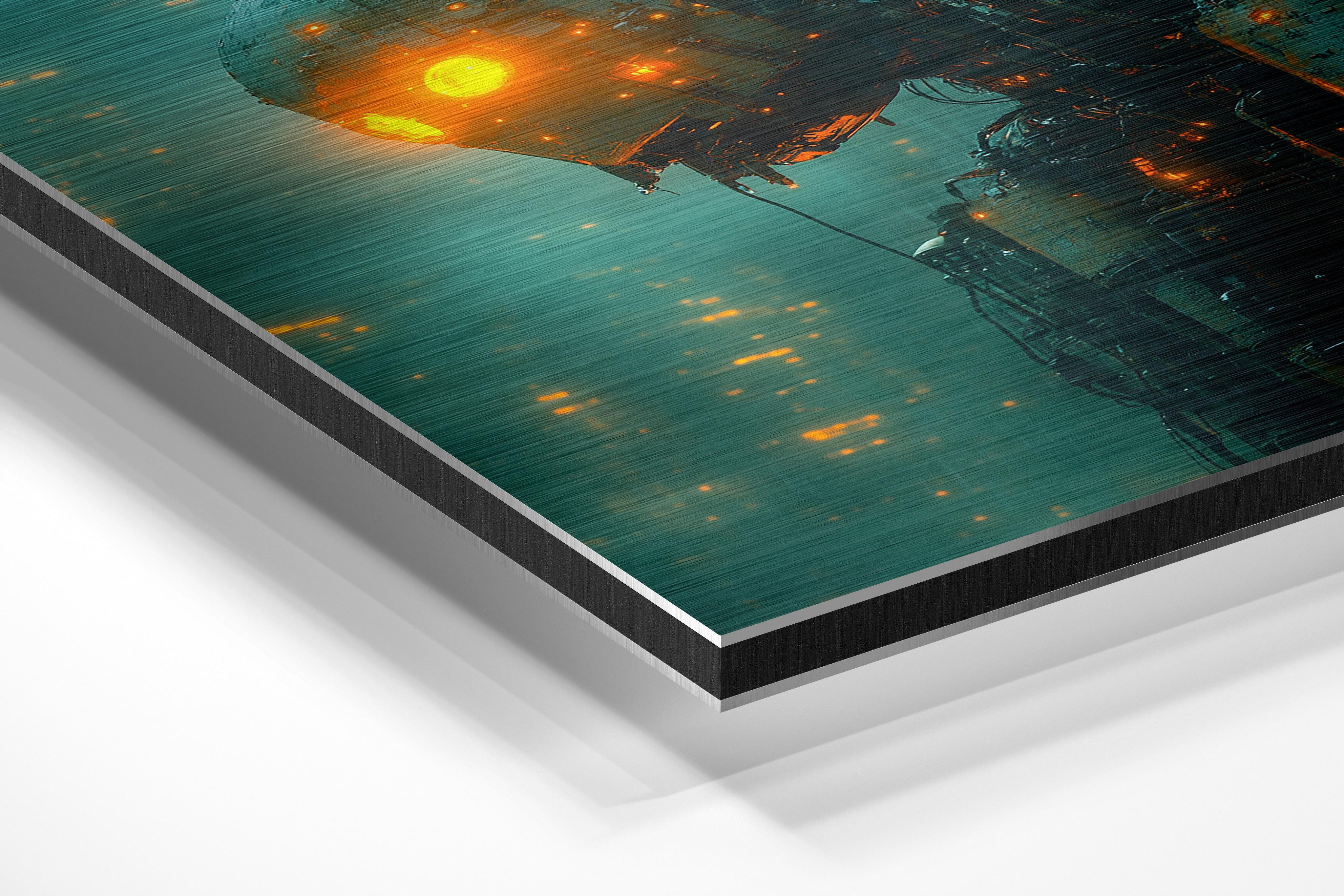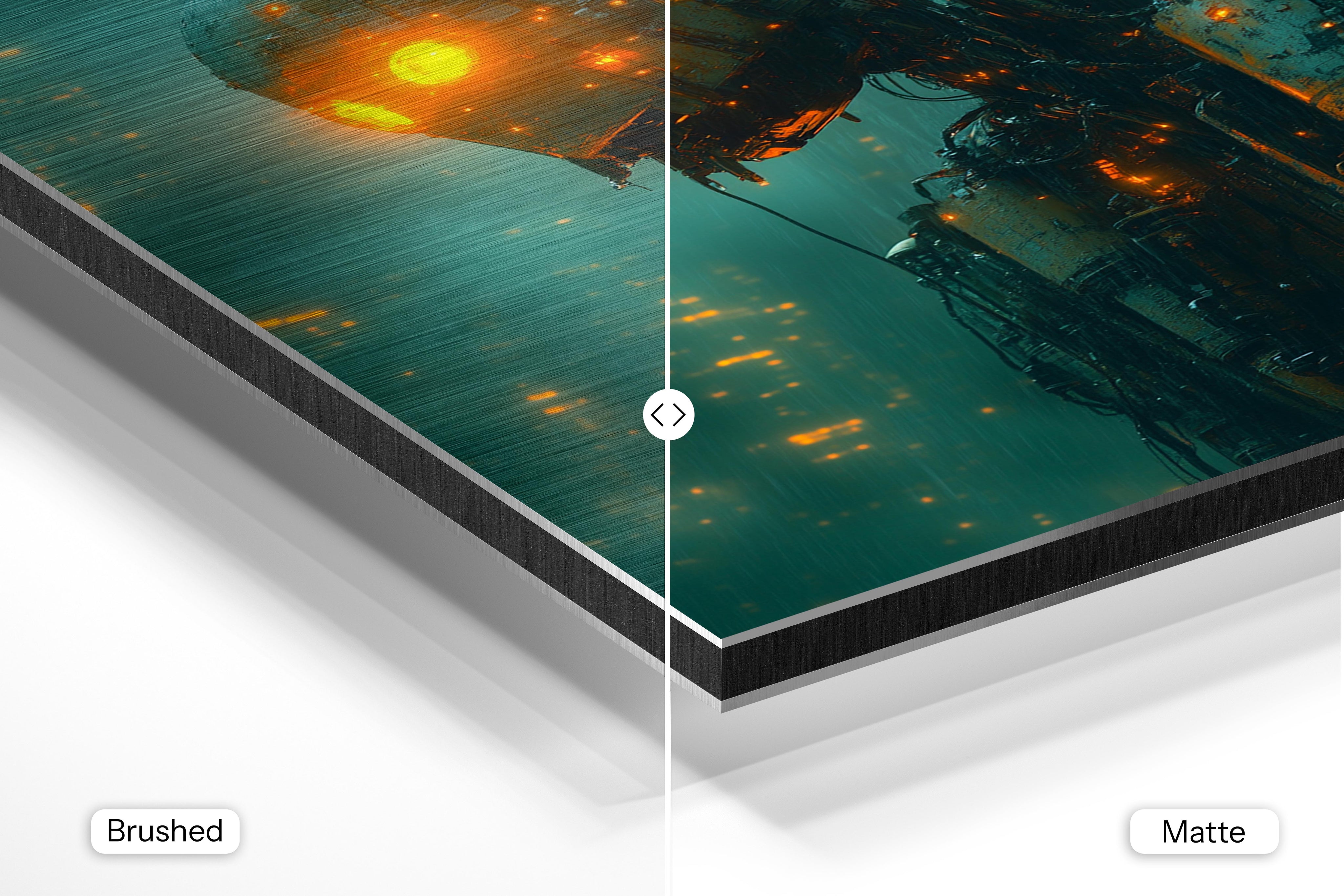 - Brushed Aluminum, on the other hand, features a raw metallic texture with visible brush strokes. Whites and highlights in your image let the silver surface show through, adding a dramatic, shimmering effect. Ideal for black-and-white images, minimalist designs, or abstract art, it creates a bold, industrial vibe with a modern edge.