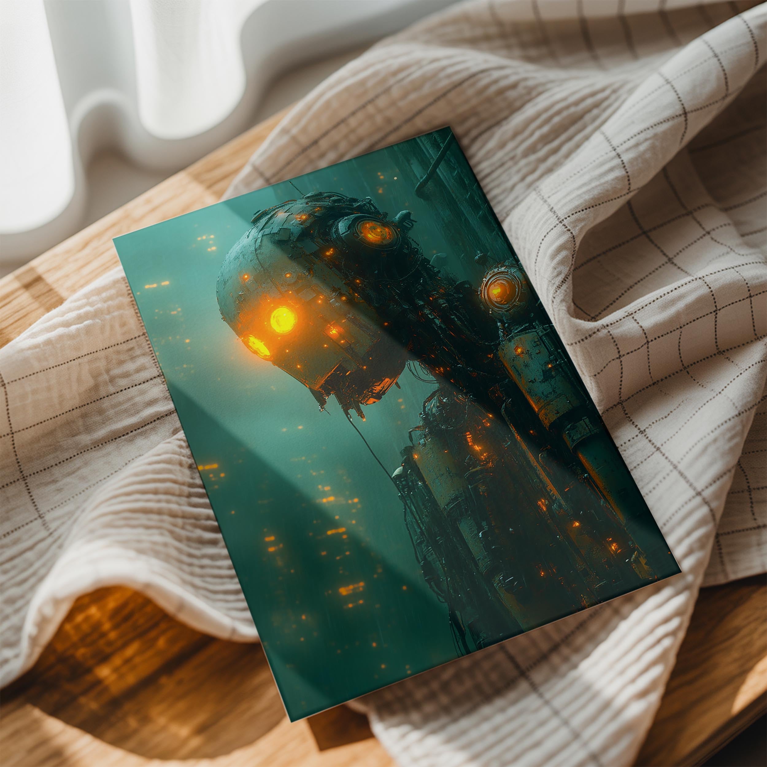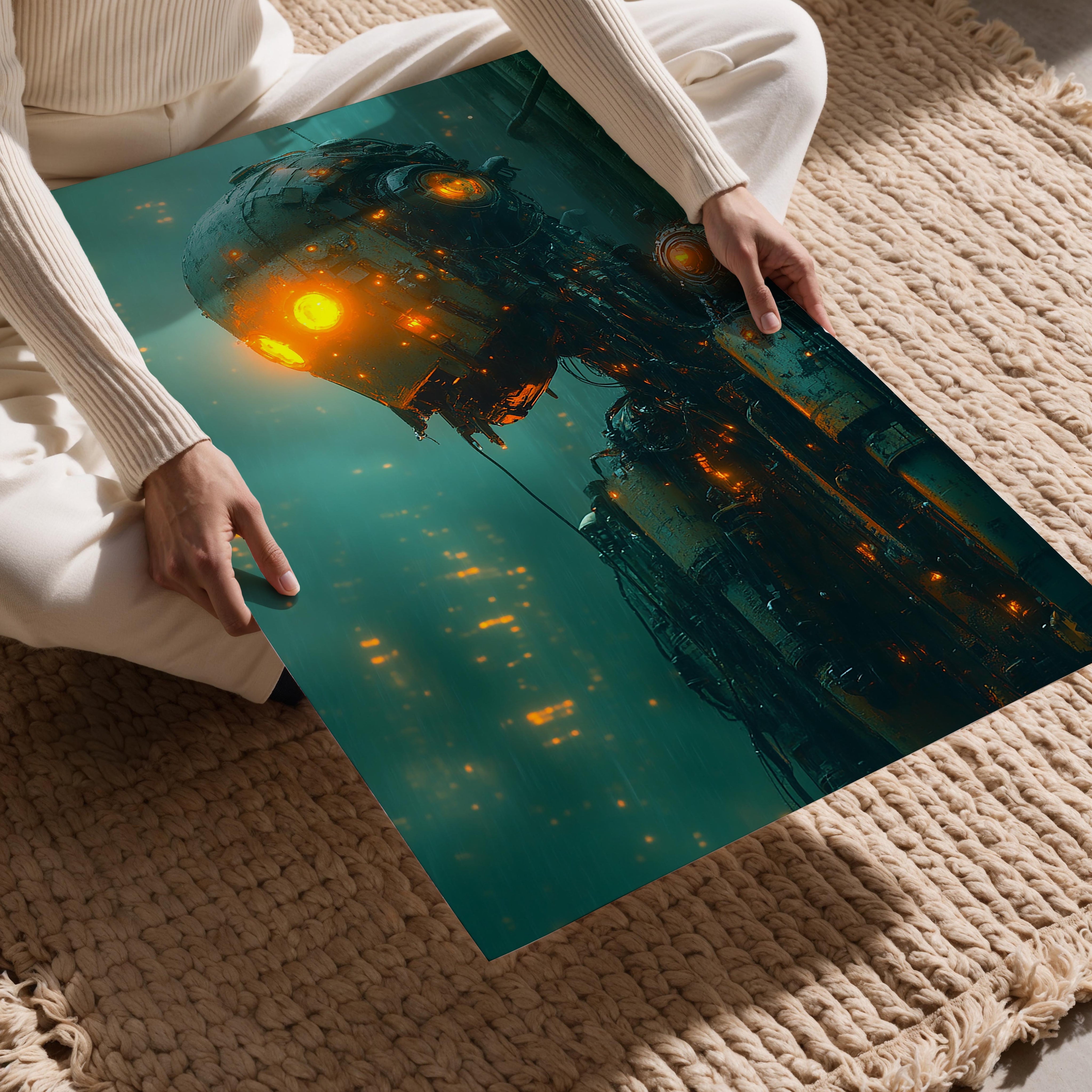 An evocative portrait of a rusted, humanoid robot standing in a rain-soaked urban environment. The glowing orange eyes convey a sense of emotion and purpose, contrasting with the worn and weathered exterior of the robot. This image explores themes of decay, resilience, and humanity in a technological world. Perfect for dystopian narratives, sci-fi storytelling, or explorations of artificial intelligence, the intricate details and atmospheric lighting make it a standout visual. Its balance of grit and sentiment captivates audiences, evoking thought and curiosity.