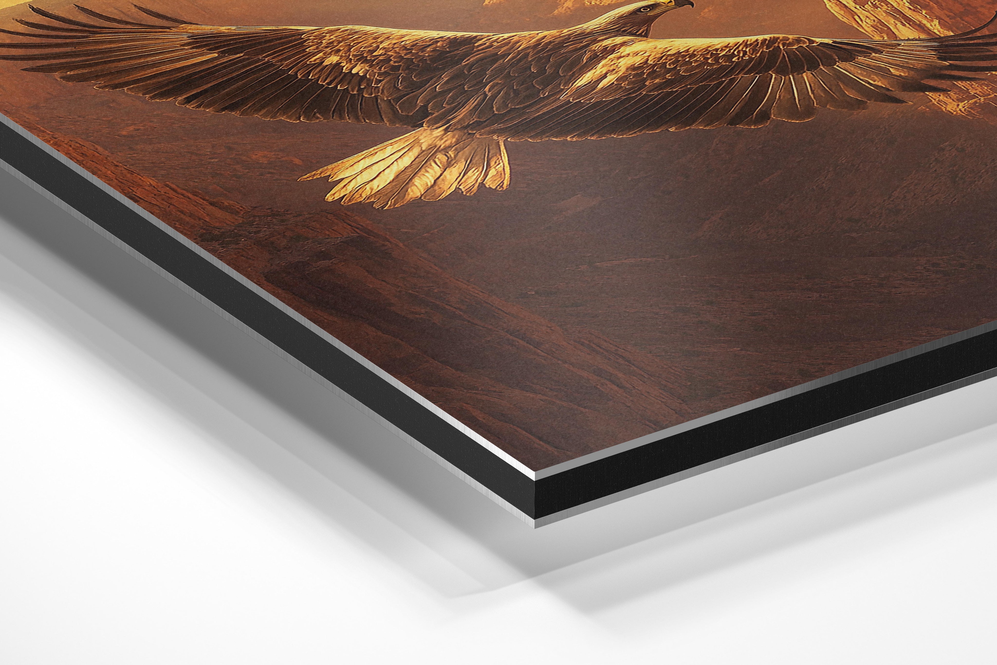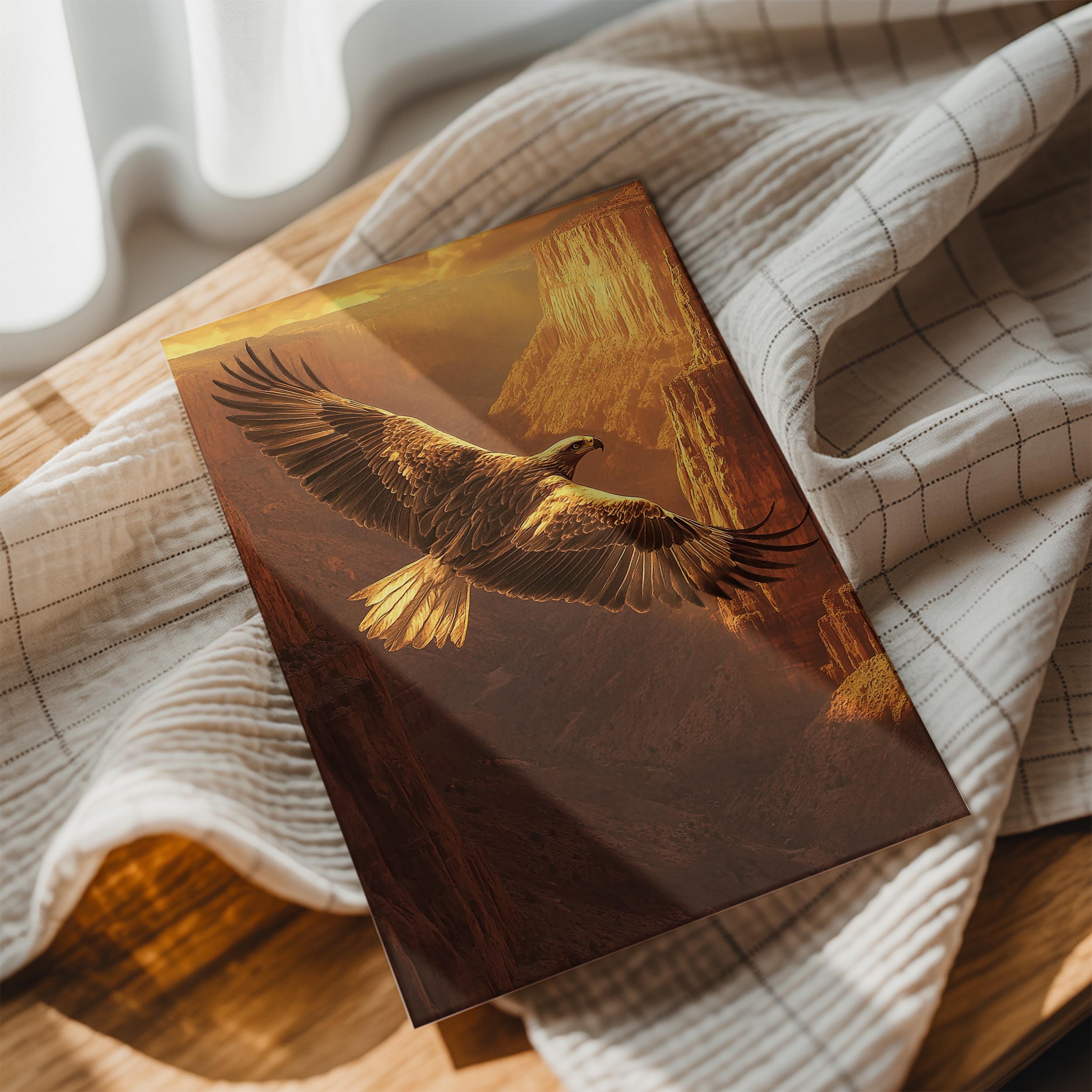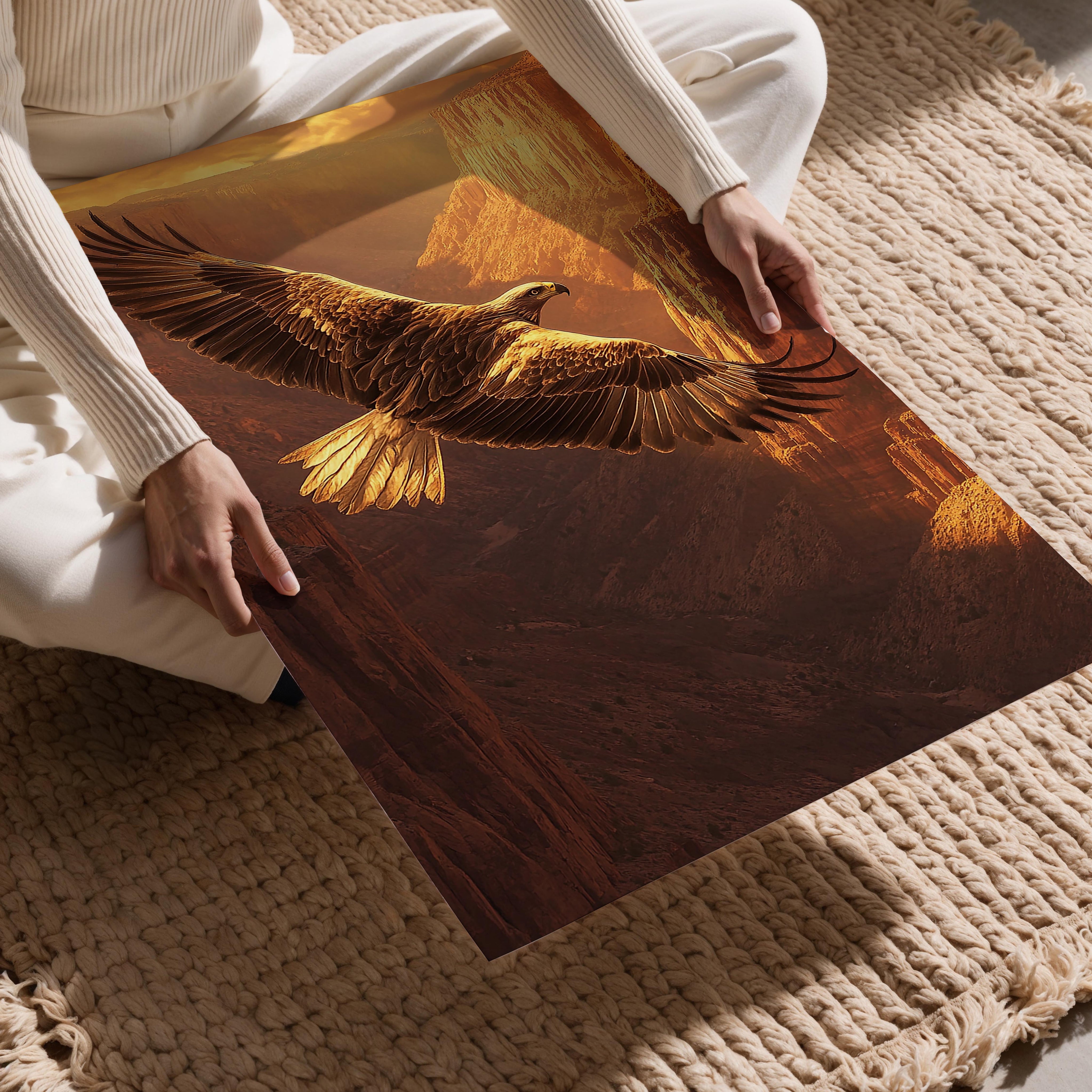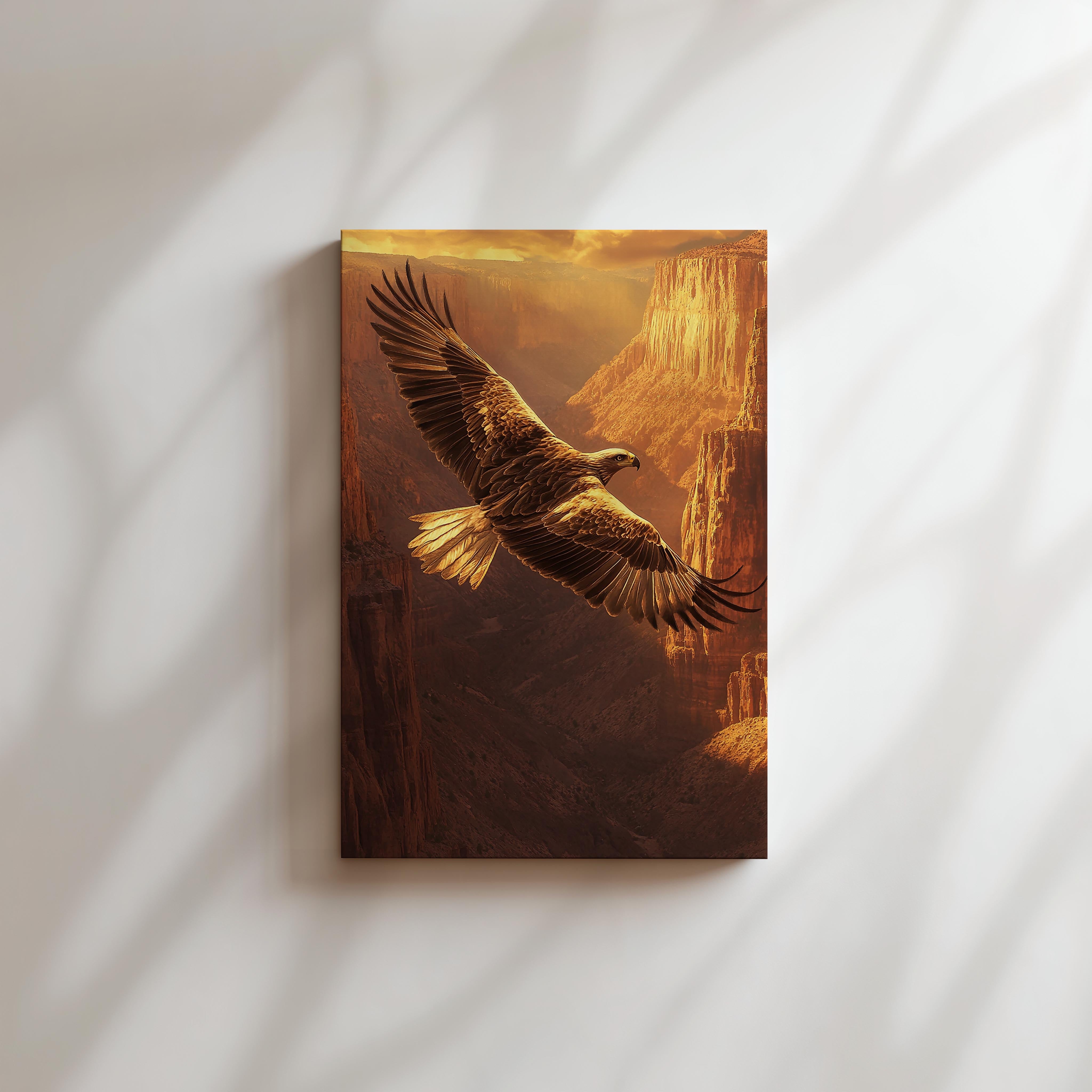 A majestic golden eagle soars through a dramatic canyon landscape at sunset, its powerful wings outstretched against the warm hues of the sky. The canyon’s rugged cliffs provide a striking backdrop, emphasizing the eagle’s grace and strength. This image captures the essence of freedom, resilience, and the grandeur of the natural world. Ideal for themes of exploration, independence, or wildlife conservation, it inspires awe and admiration for one of nature’s most iconic creatures.