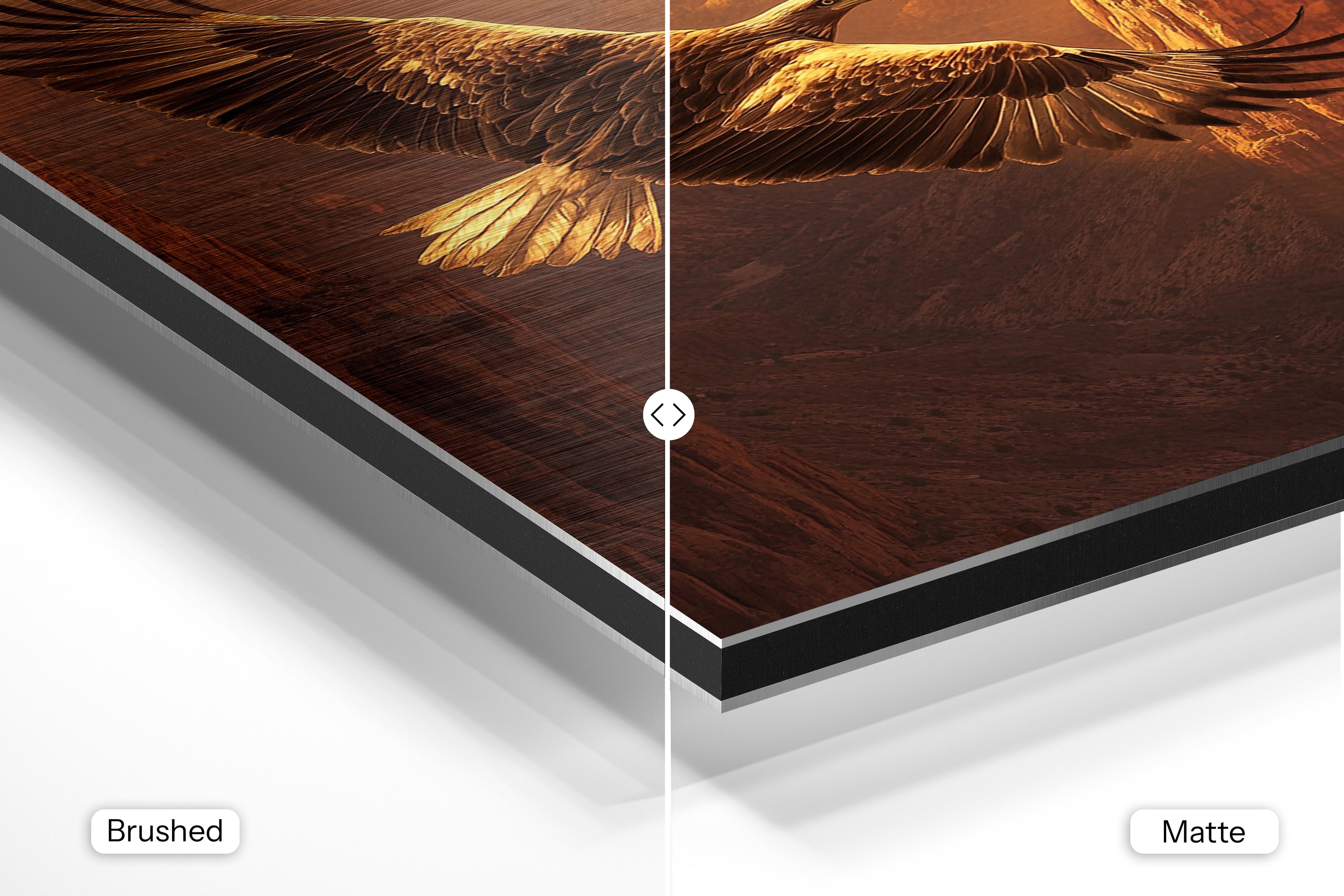 - Brushed Aluminum, on the other hand, features a raw metallic texture with visible brush strokes. Whites and highlights in your image let the silver surface show through, adding a dramatic, shimmering effect. Ideal for black-and-white images, minimalist designs, or abstract art, it creates a bold, industrial vibe with a modern edge.
