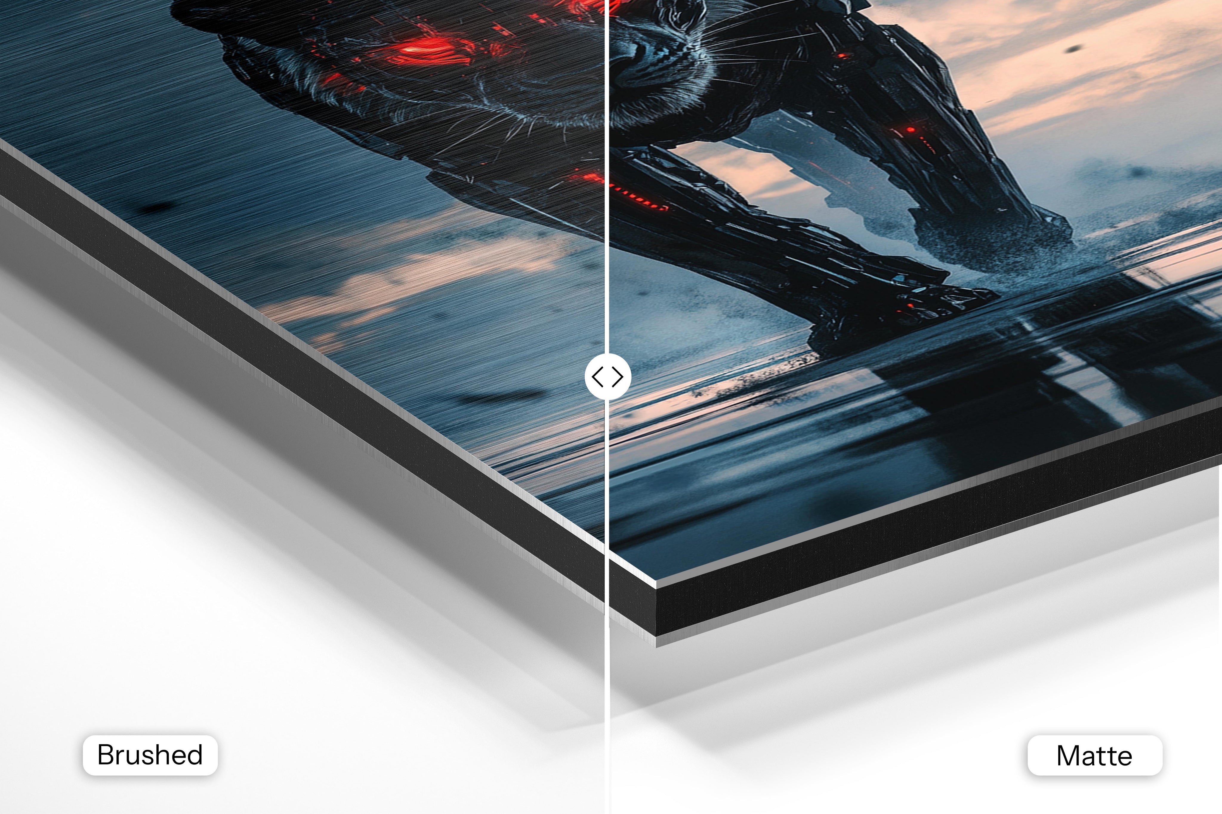 - Brushed Aluminum, on the other hand, features a raw metallic texture with visible brush strokes. Whites and highlights in your image let the silver surface show through, adding a dramatic, shimmering effect. Ideal for black-and-white images, minimalist designs, or abstract art, it creates a bold, industrial vibe with a modern edge.