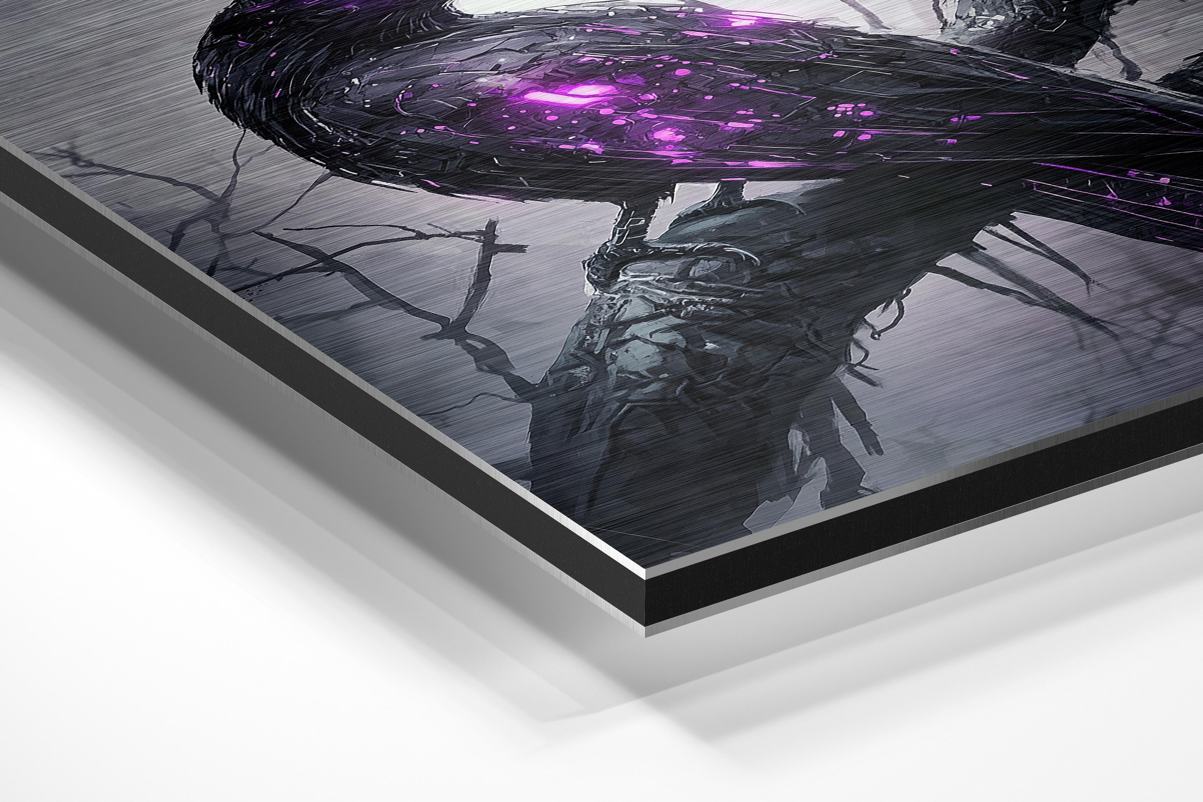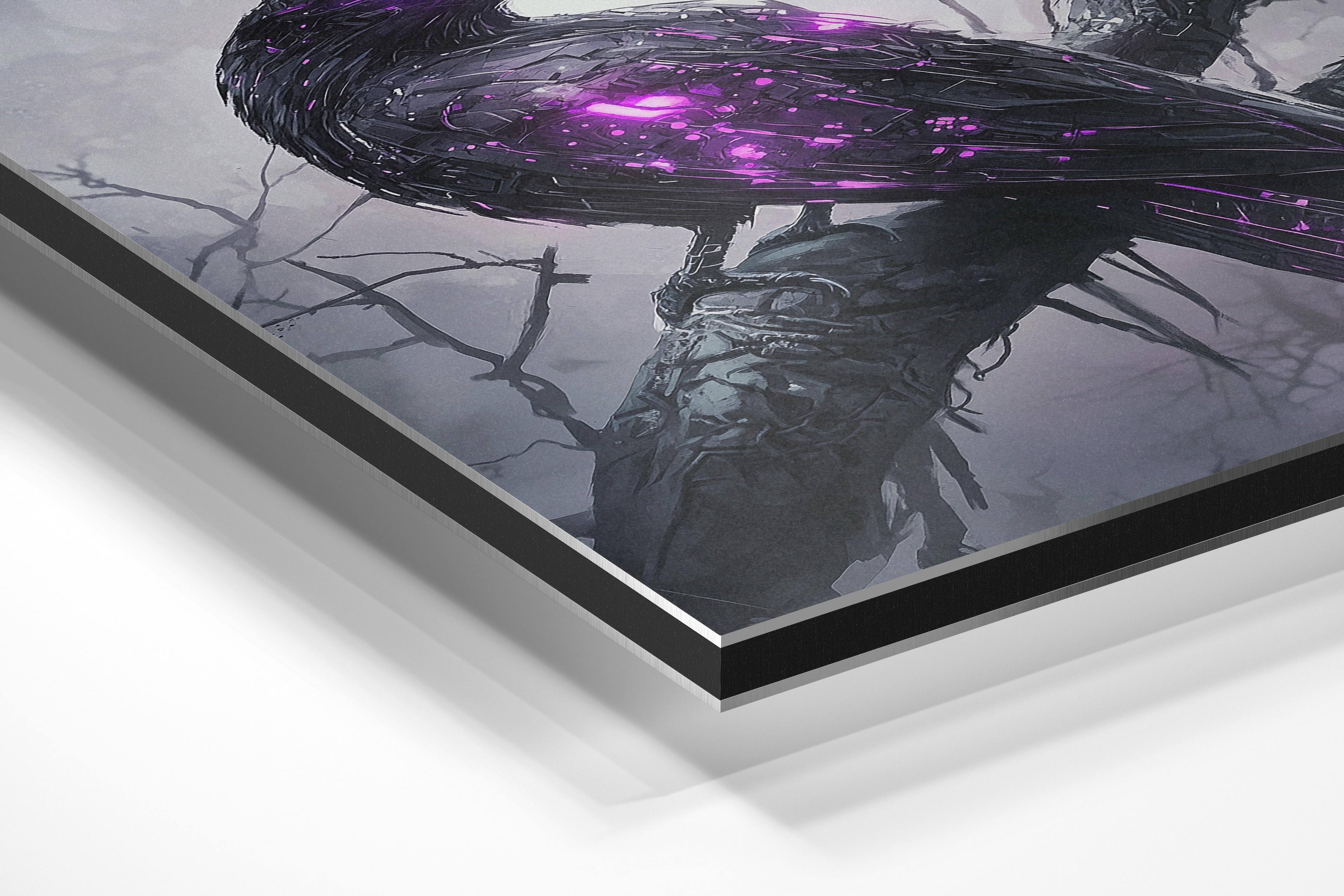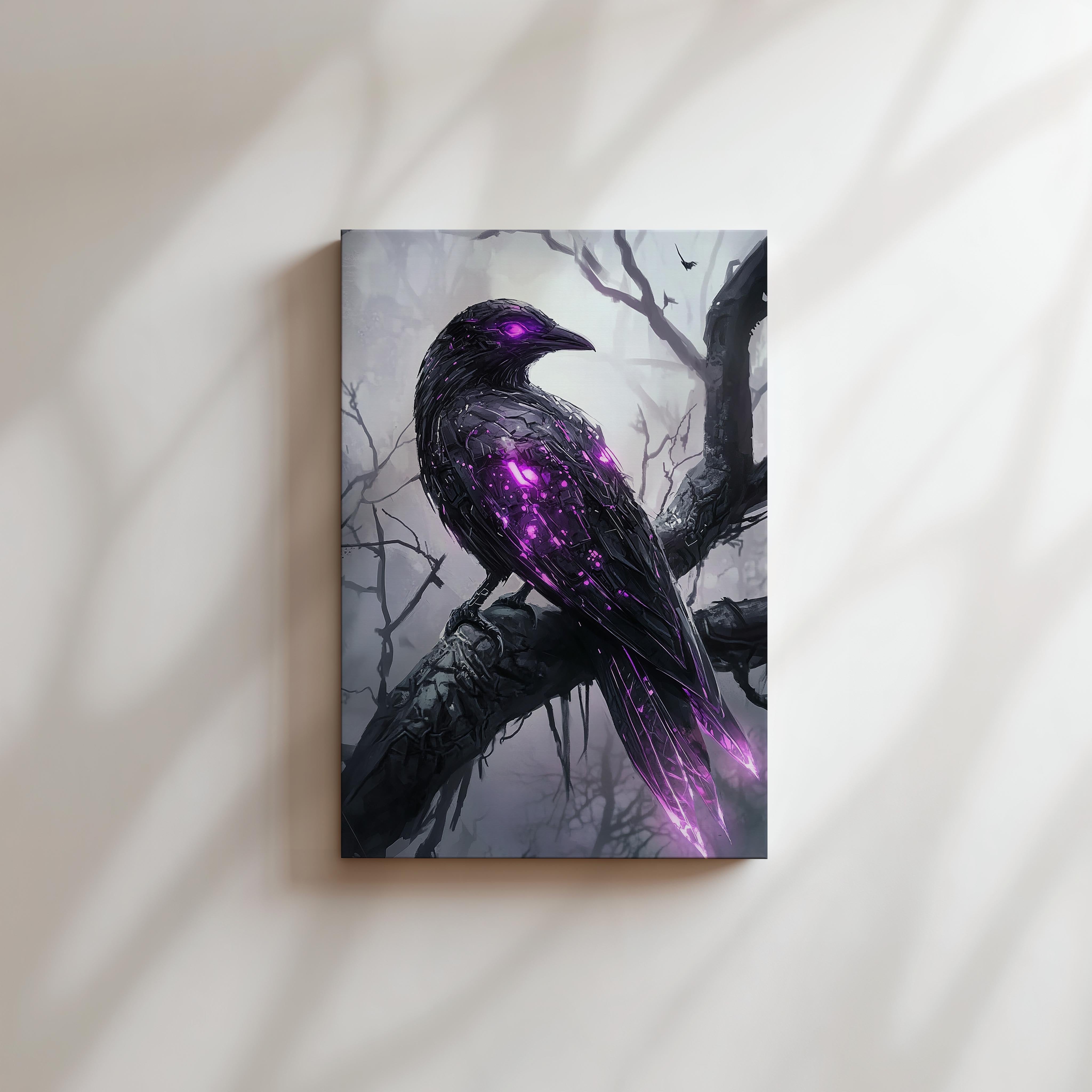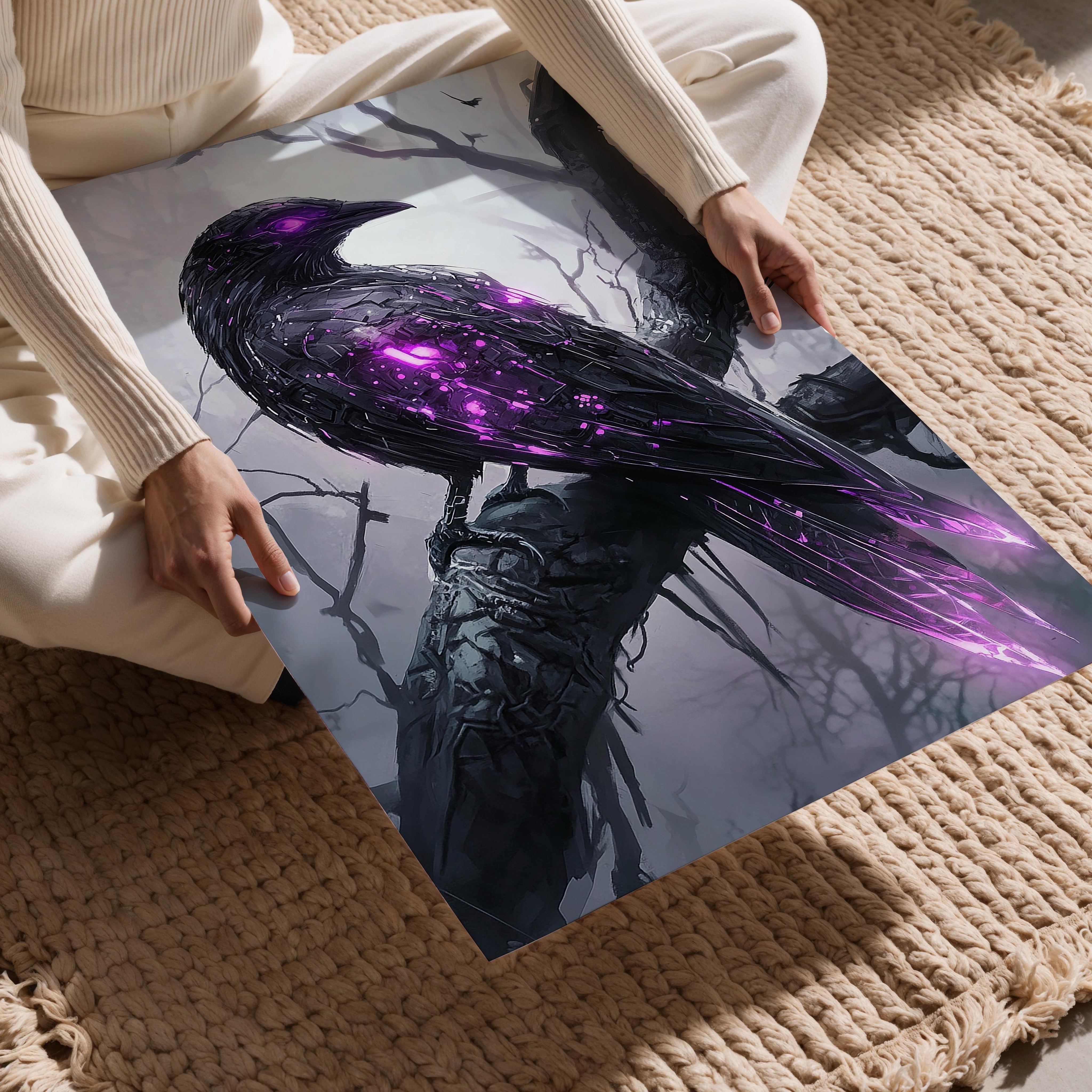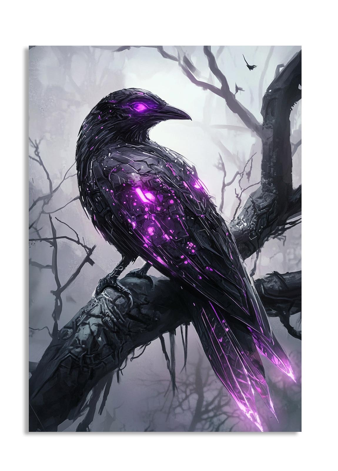 An extraordinary depiction of a raven enhanced with neon purple cybernetic elements. Perched amidst a misty, desolate landscape, the glowing components of the bird stand in stark contrast to its dark surroundings. The intricate mechanical details emphasize the fusion of wildlife and futuristic technology. Perfect for projects delving into cyberpunk aesthetics, this image conveys mystery, intelligence, and the intriguing balance between nature and machine. Its captivating visuals make it an excellent choice for creative endeavors in sci-fi and speculative art.