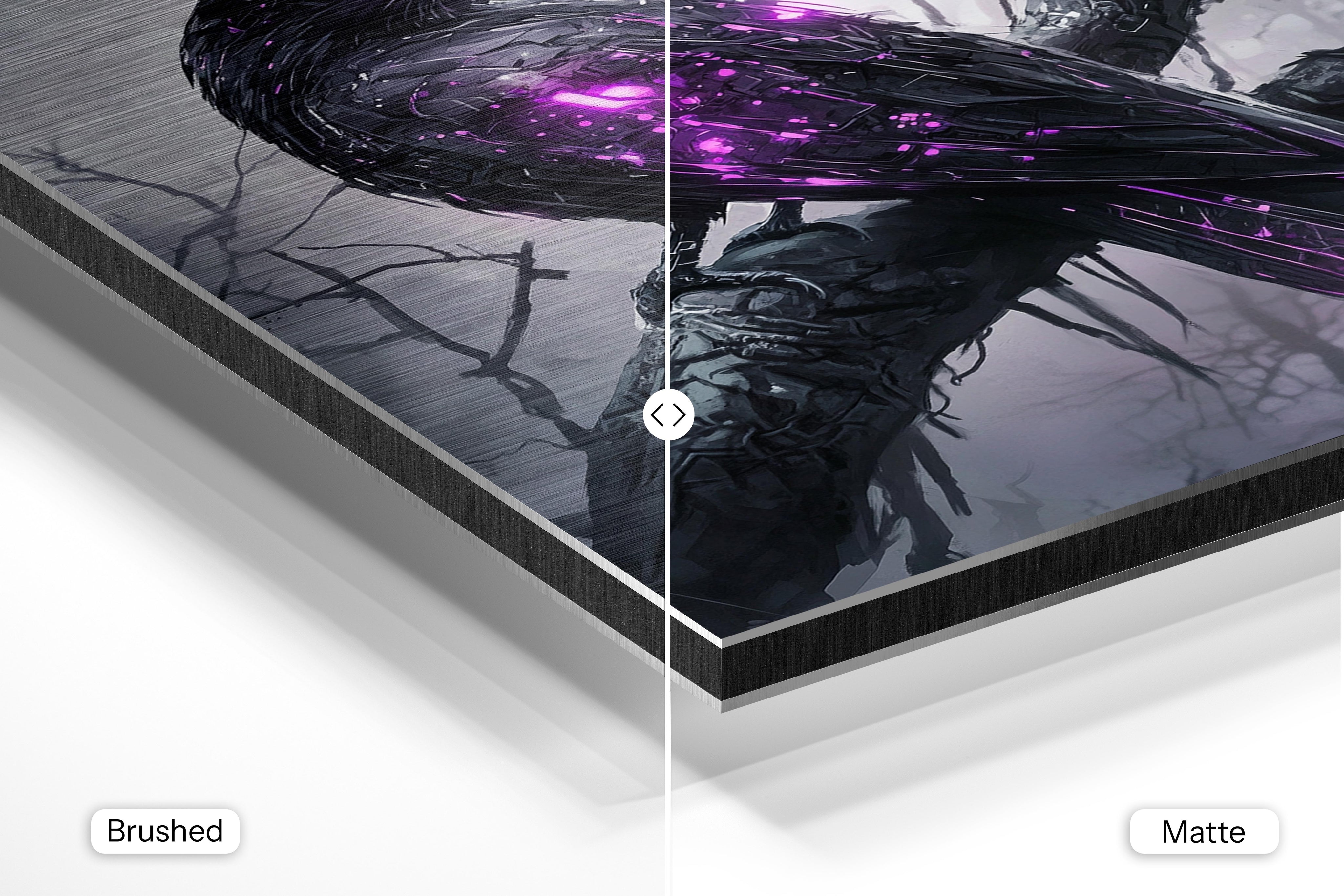 - Brushed Aluminum, on the other hand, features a raw metallic texture with visible brush strokes. Whites and highlights in your image let the silver surface show through, adding a dramatic, shimmering effect. Ideal for black-and-white images, minimalist designs, or abstract art, it creates a bold, industrial vibe with a modern edge.