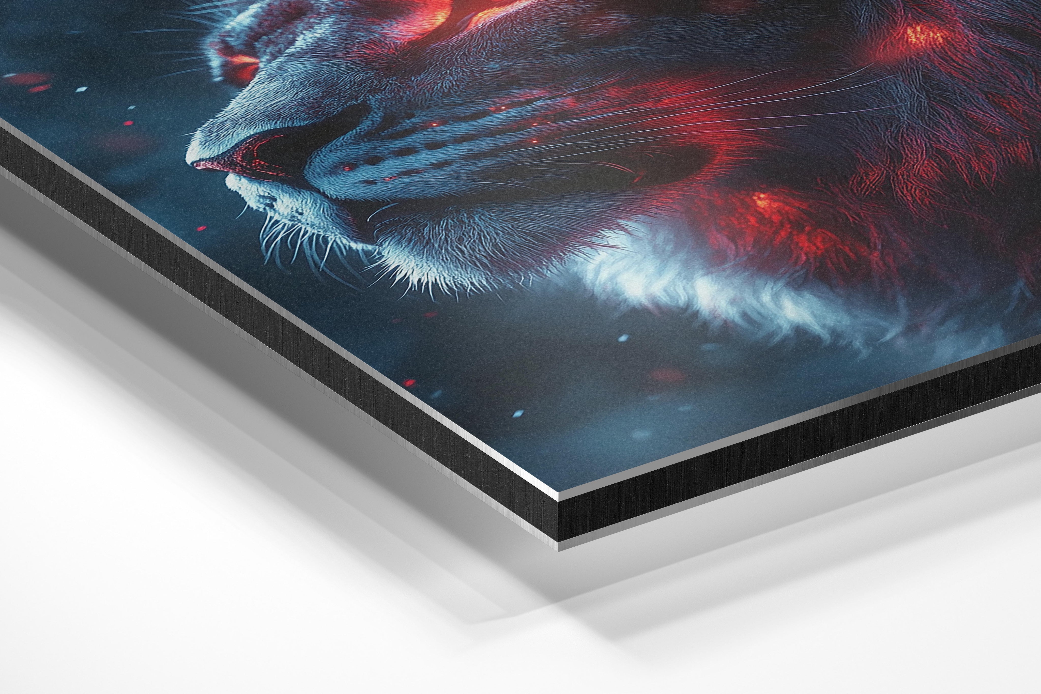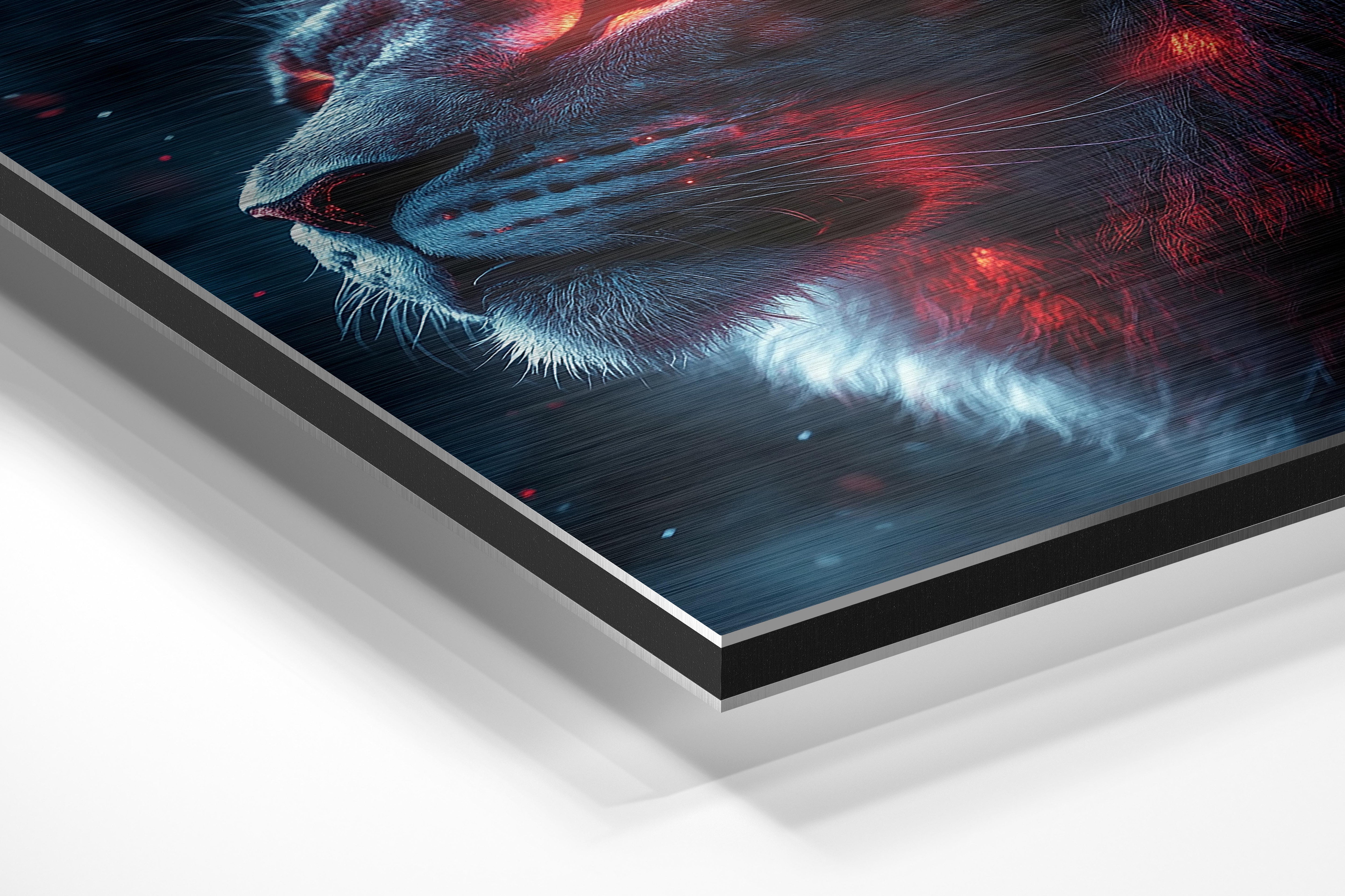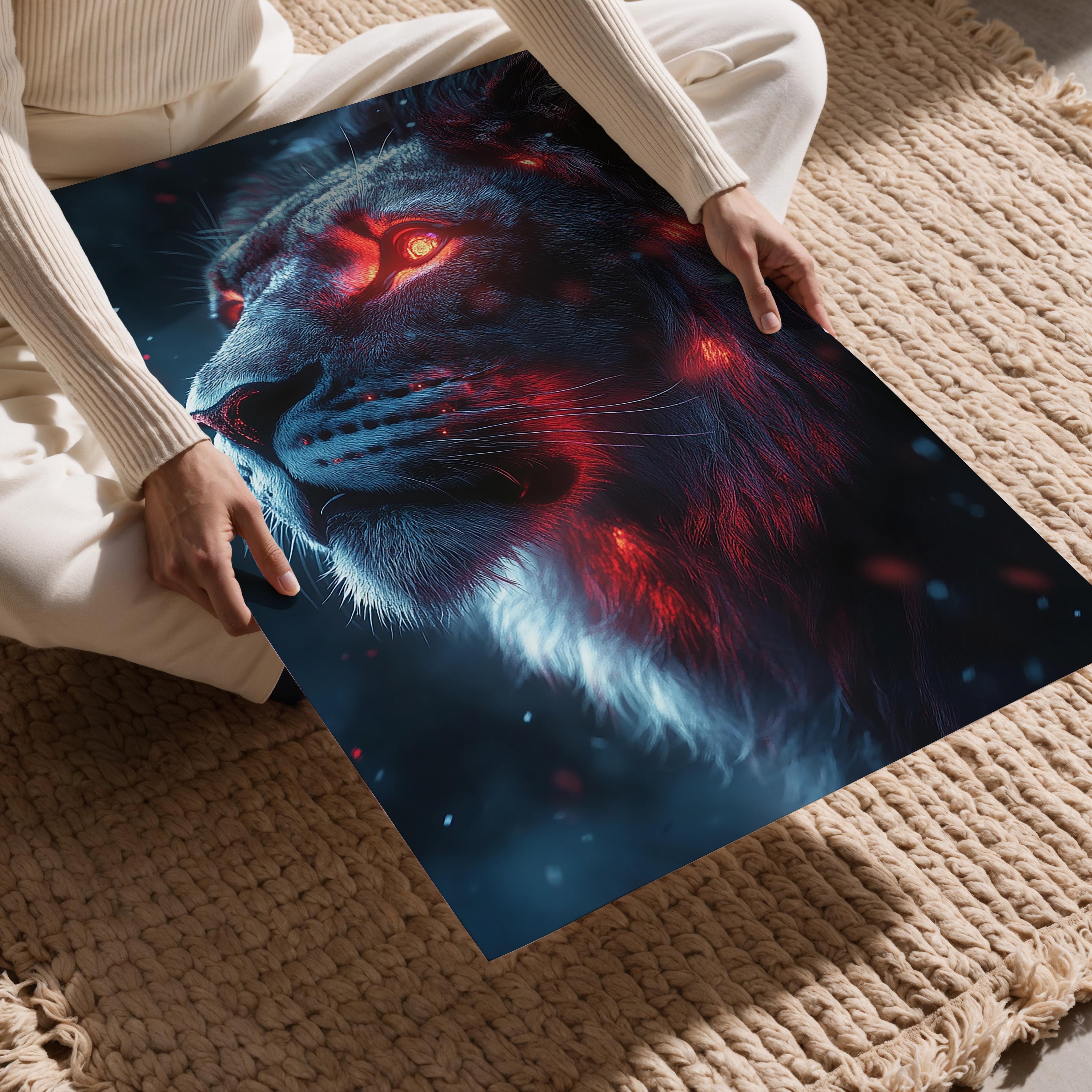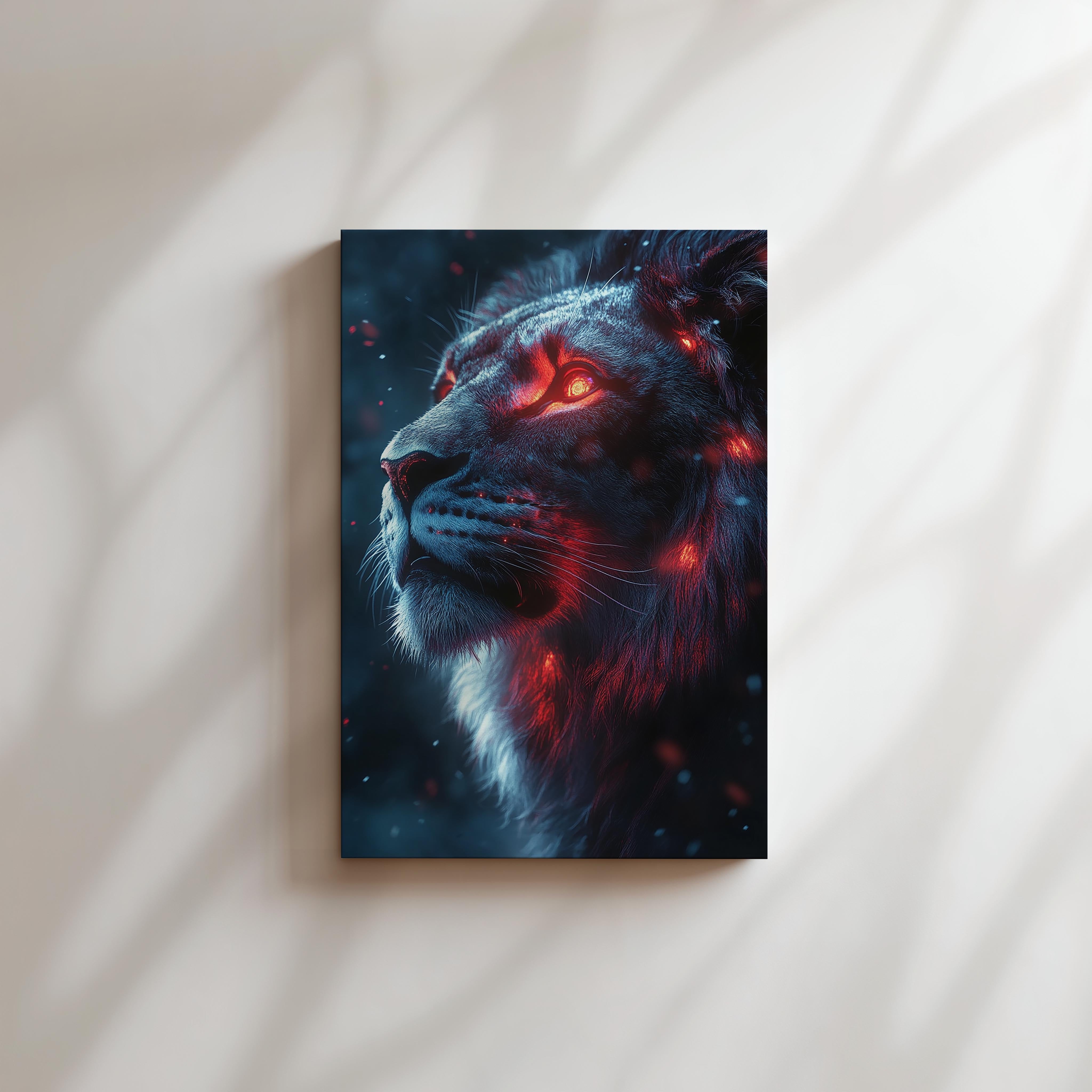 A stunning close-up of a lion’s face illuminated by vivid neon lights, blending natural majesty with futuristic aesthetics. The intense, glowing eyes convey strength and mystery, making this image both captivating and thought-provoking. Perfect for artistic projects, branding, or symbolic storytelling, it emphasizes themes of power, beauty, and the convergence of nature and technology. The bold colors and striking composition make it a visual masterpiece that captures attention and inspires imagination. Its dramatic flair ensures it stands out in any creative application.