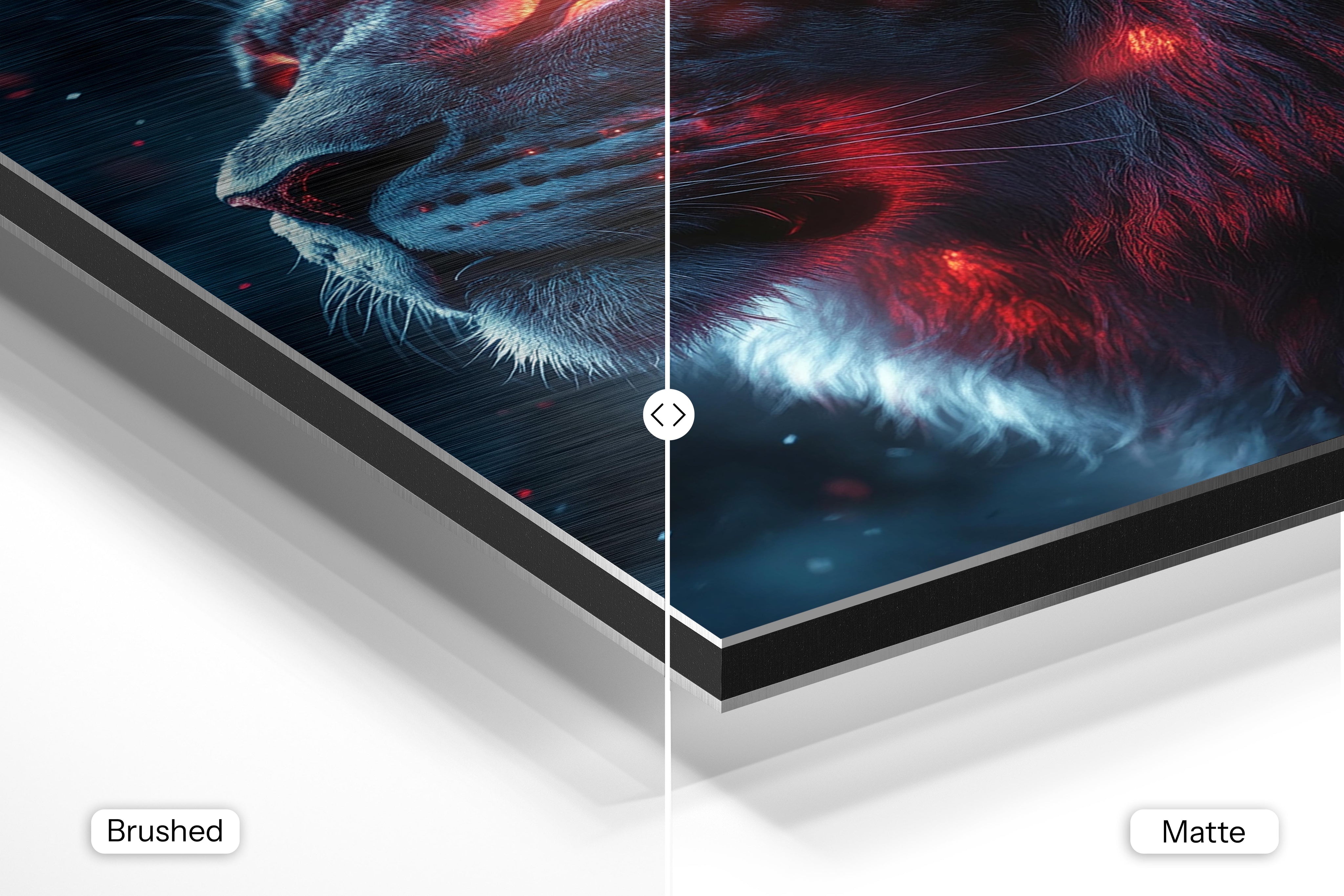 - Brushed Aluminum, on the other hand, features a raw metallic texture with visible brush strokes. Whites and highlights in your image let the silver surface show through, adding a dramatic, shimmering effect. Ideal for black-and-white images, minimalist designs, or abstract art, it creates a bold, industrial vibe with a modern edge.
